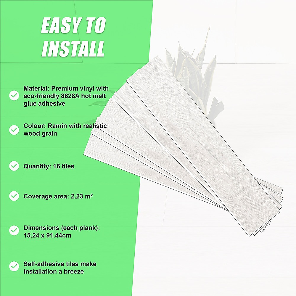 Vinyl Floor Tiles Self Adhesive Flooring Ramin Wood Grain 16 Pack 2.3SQM