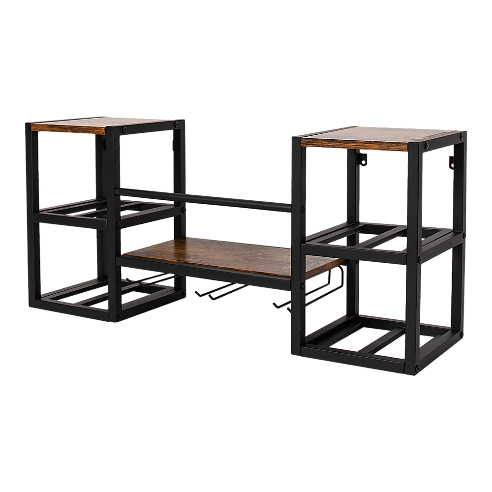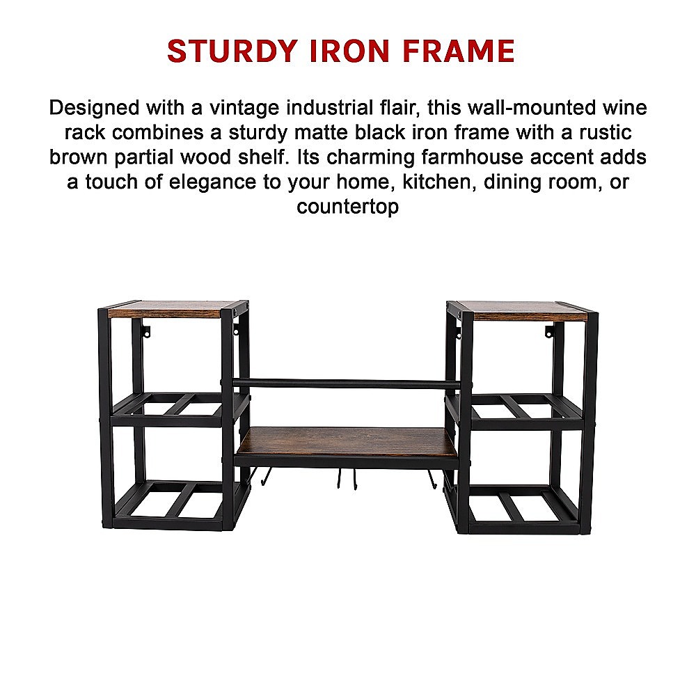 Designed with a vintage industrial flair, this wall-mounted wine rack combines a sturdy matte black iron frame with a rustic brown partial wood shelf. Its charming farmhouse accent adds a touch of elegance to your home, kitchen, dining room, or countertop. It's not only a practical rack but also makes a thoughtful gift for wine lovers.