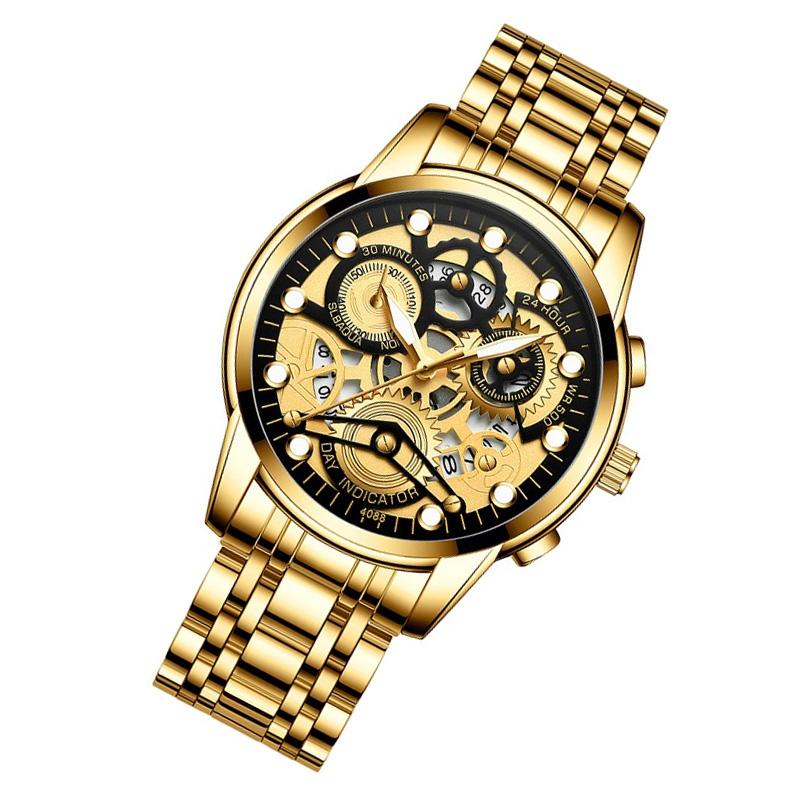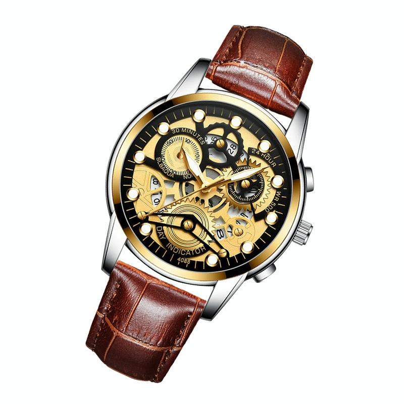 Waterproof Luminous Men Quartz Watch – Hollow Design – Brown Leather Full Gold Black Surface