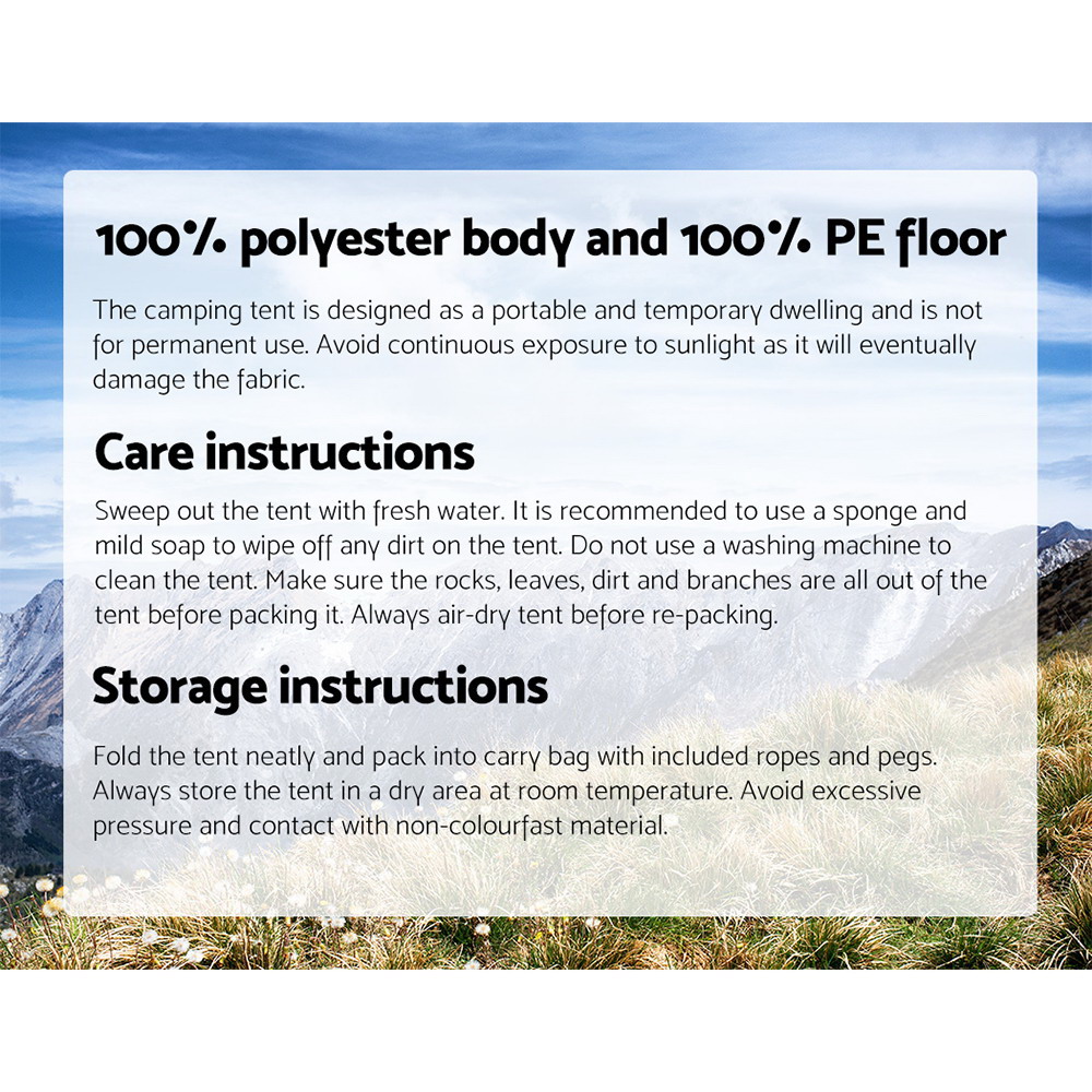 Now you can spend less time setting up the tent and more time relaxing or exploring the outdoors when you go camping with our Weisshorn 5-person Pop-Up Tent. Both the setting up and packing away of the tent is easy and can be done by a single person. In fact, it takes less than a minute to set up the tent – just throw it into an open area and watch it pop up instantly. The tent is made of high-quality heavy-duty 190T polyester material with PU coating to keep rain and UV rays at bay efficiently and effectively. The steel poles are durable and super strong to keep your tent sturdy and firm. To enable ample light and ventilation within the tent, mesh windows are featured while the oversized entrance is easily opened and closed with a handy zipper. Step inside and five persons will appreciate the generous space that welcomes them. So take that road trip to the hills or have that wonderful outdoor family picnic with total peace of mind as you load up the pop-up tent with its handy carry bag into your vehicle. Happy trails!