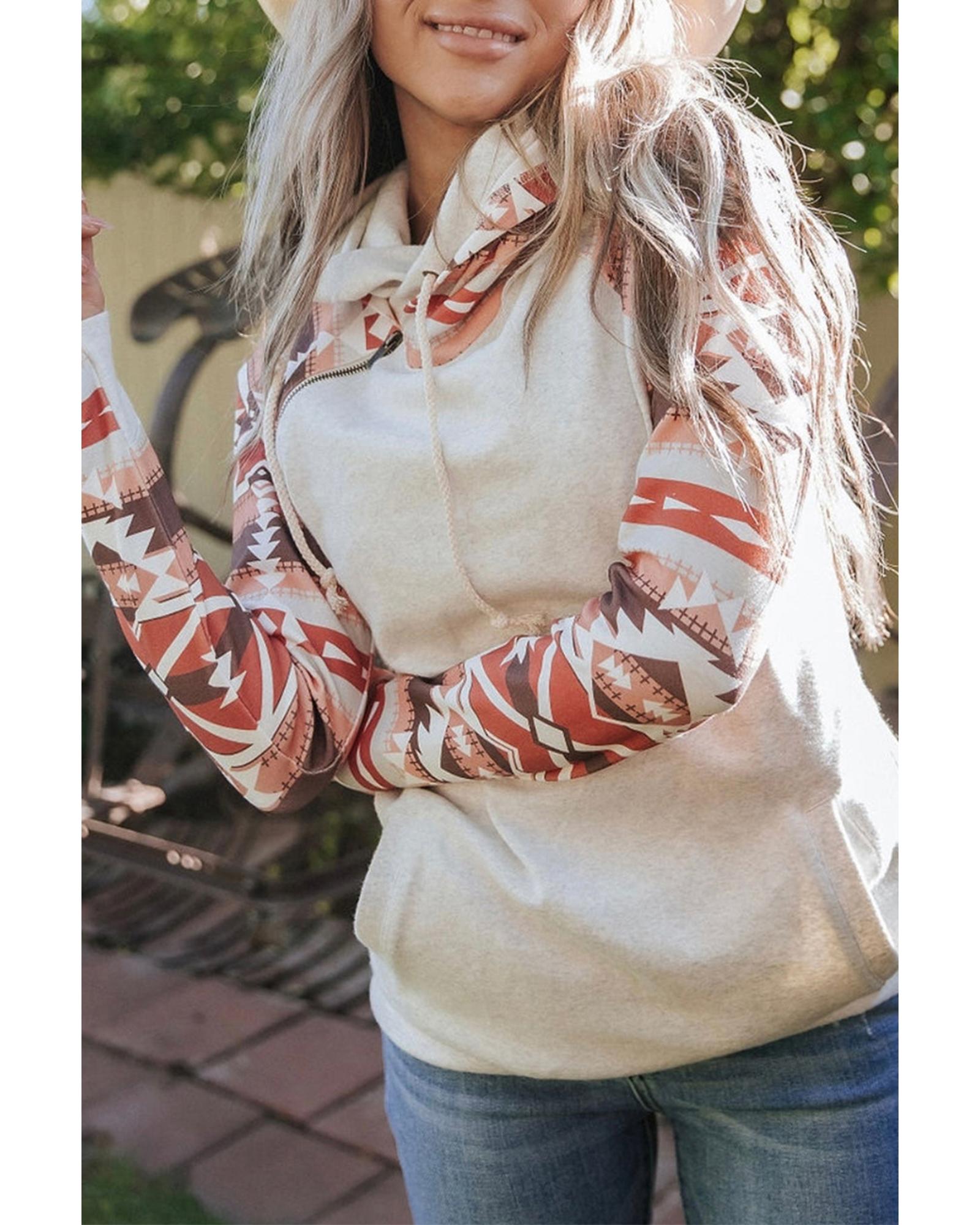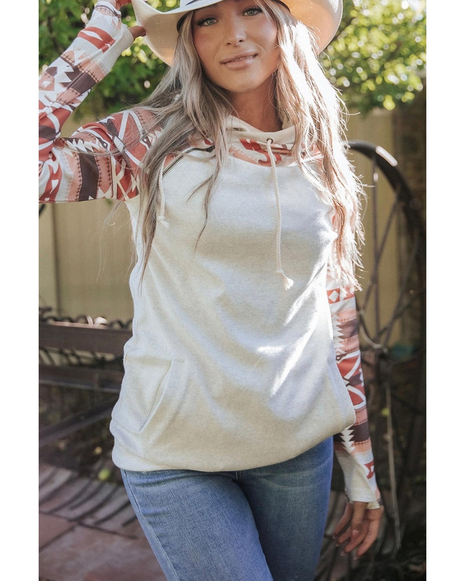 - Western Aztec Print Patchwork Double Hood Hoodie