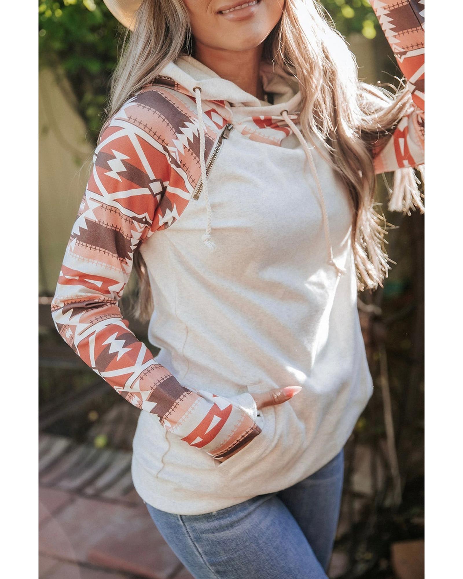 - Western Aztec Print Patchwork Double Hood Hoodie