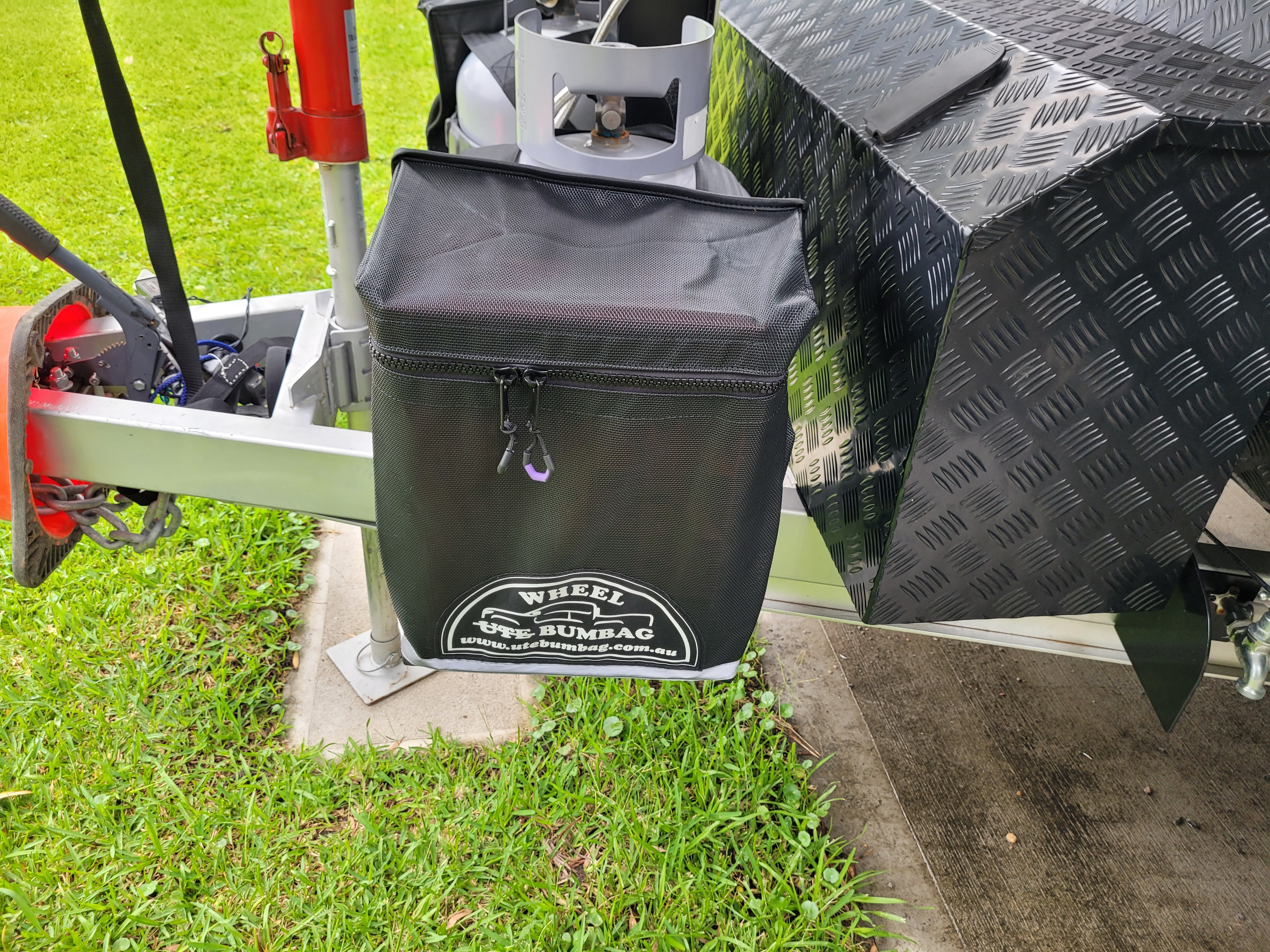 Our new Wheel Bumbag is so versatile that it fits Wheels, Stone Guards, Ladders, 9Kg Gas Bottles or any flat surface when combined with our Saddle Pack the Convertible Dirty Gear Bag! It is made from UV stabilized Truck Mesh that wont hold smells or perish in the sun like canvas.
