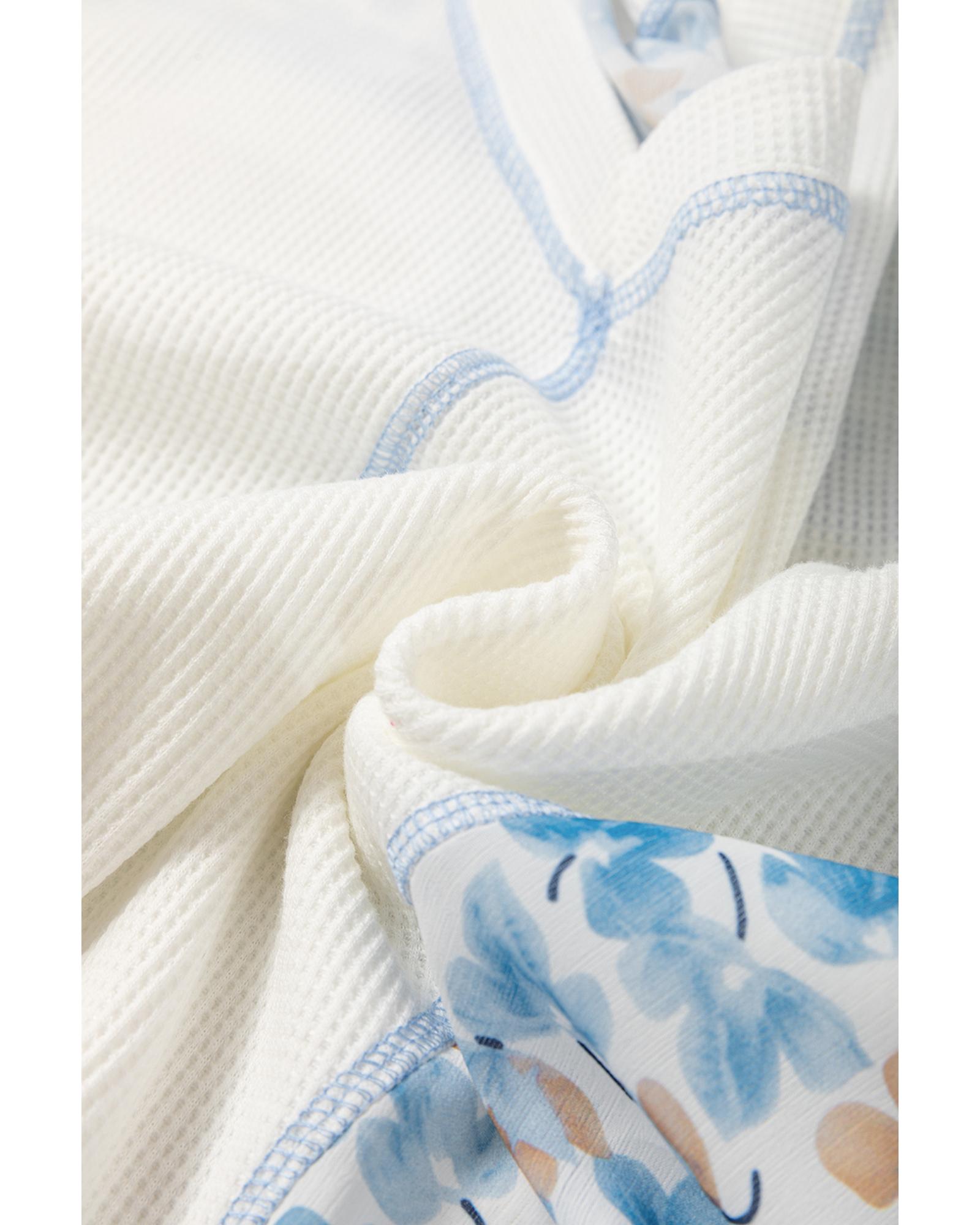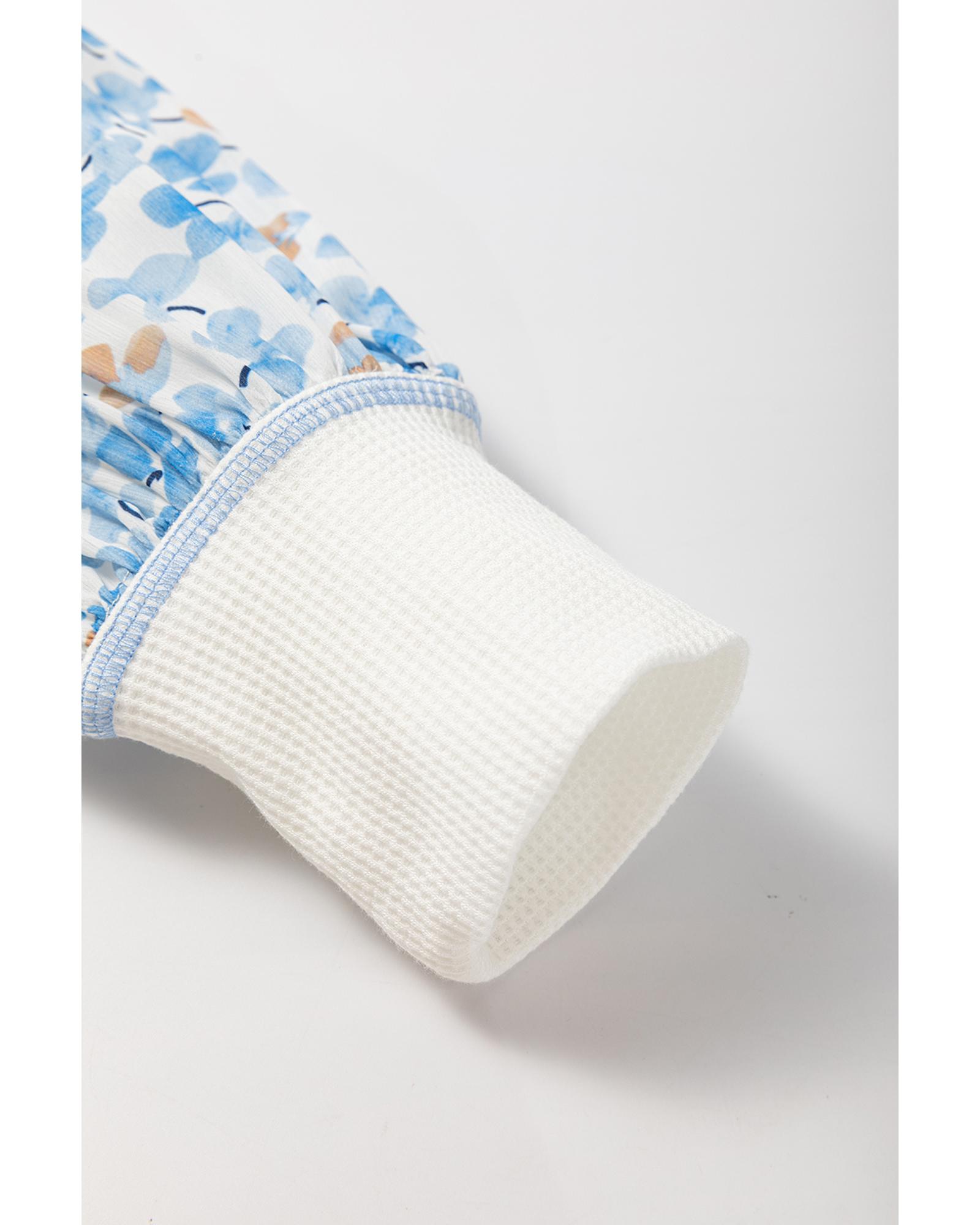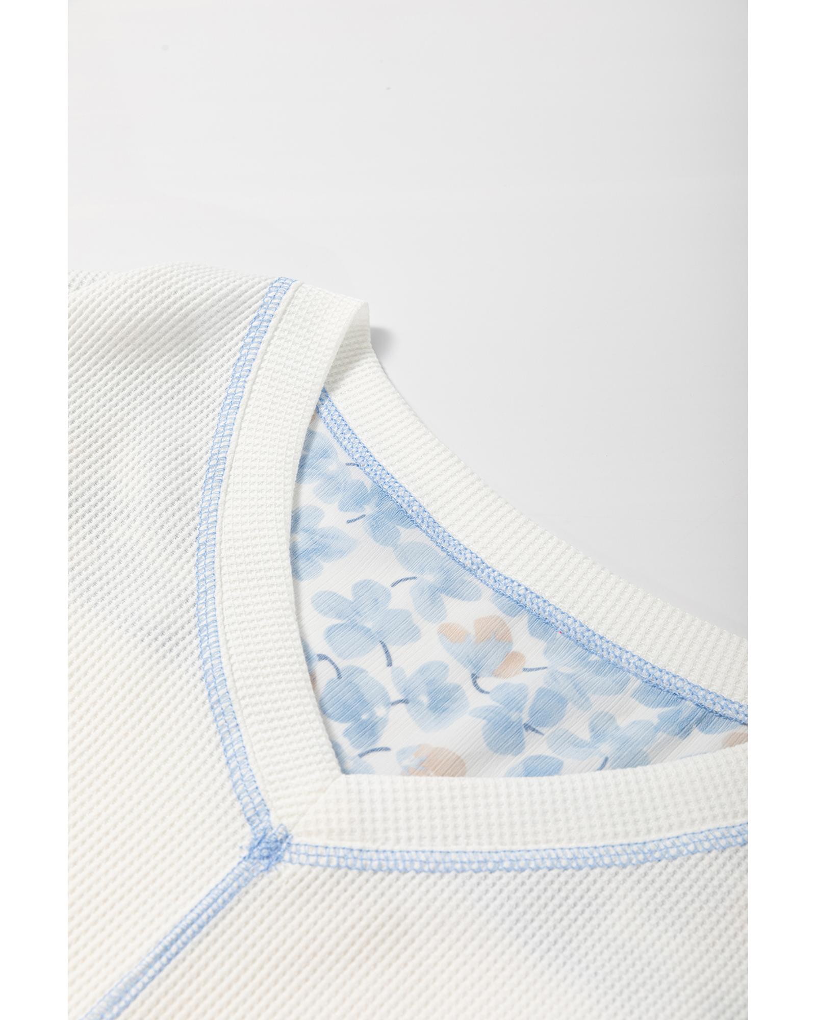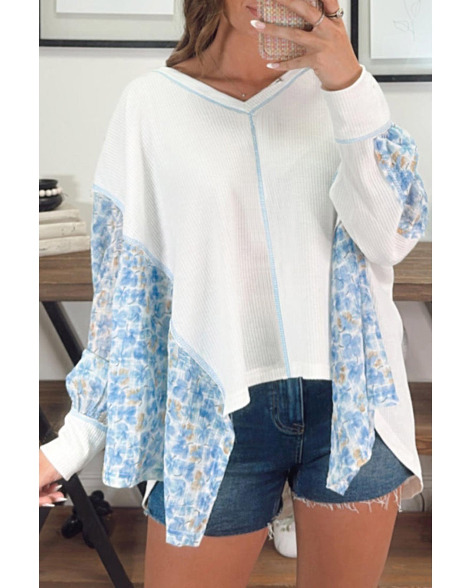 White Abstract Floral Patchwork Batwing Sleeve V Neck Blouse – M