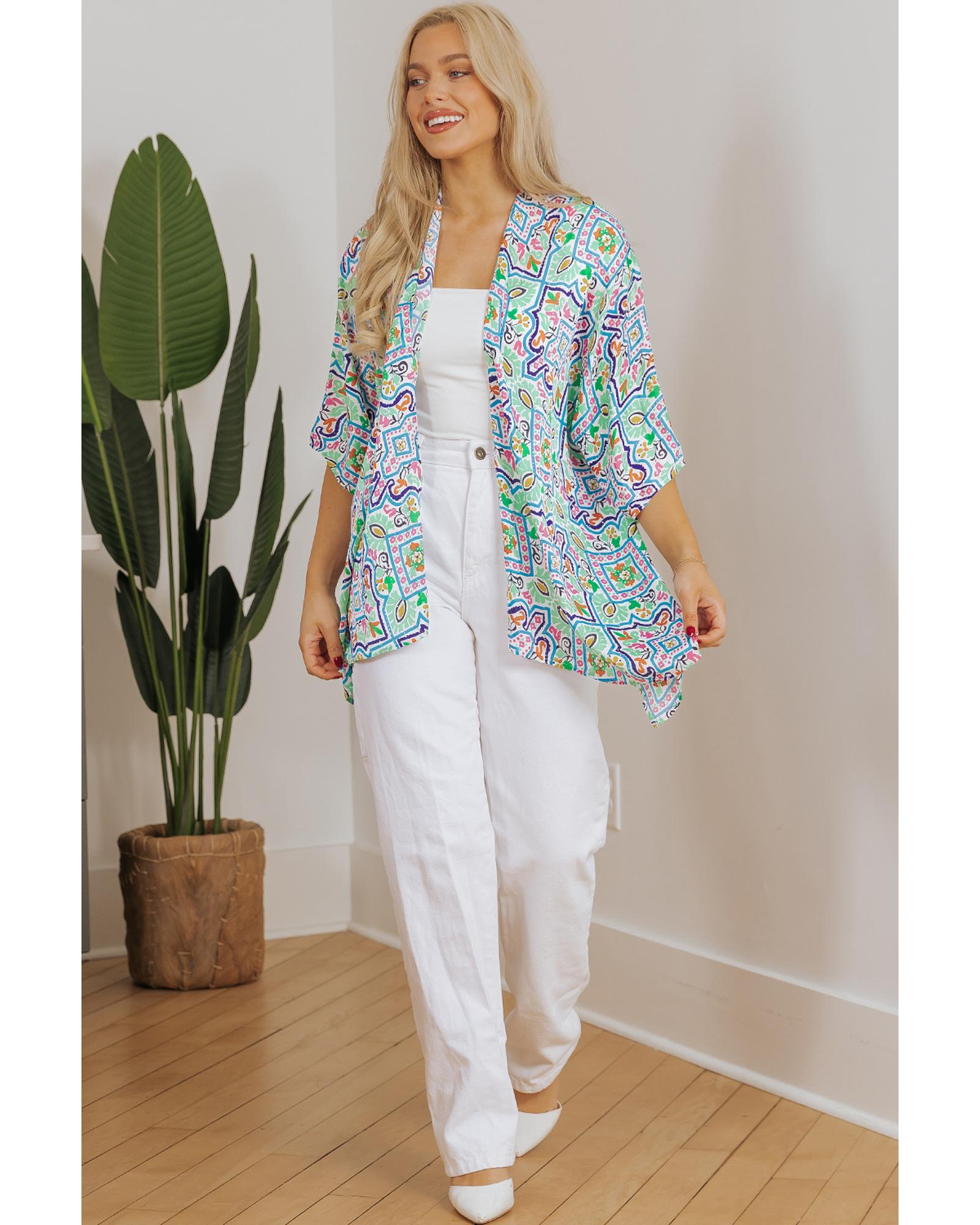 White Boho Floral Printed Rhinestone 3/4 Sleeve Open Front Kimono – L