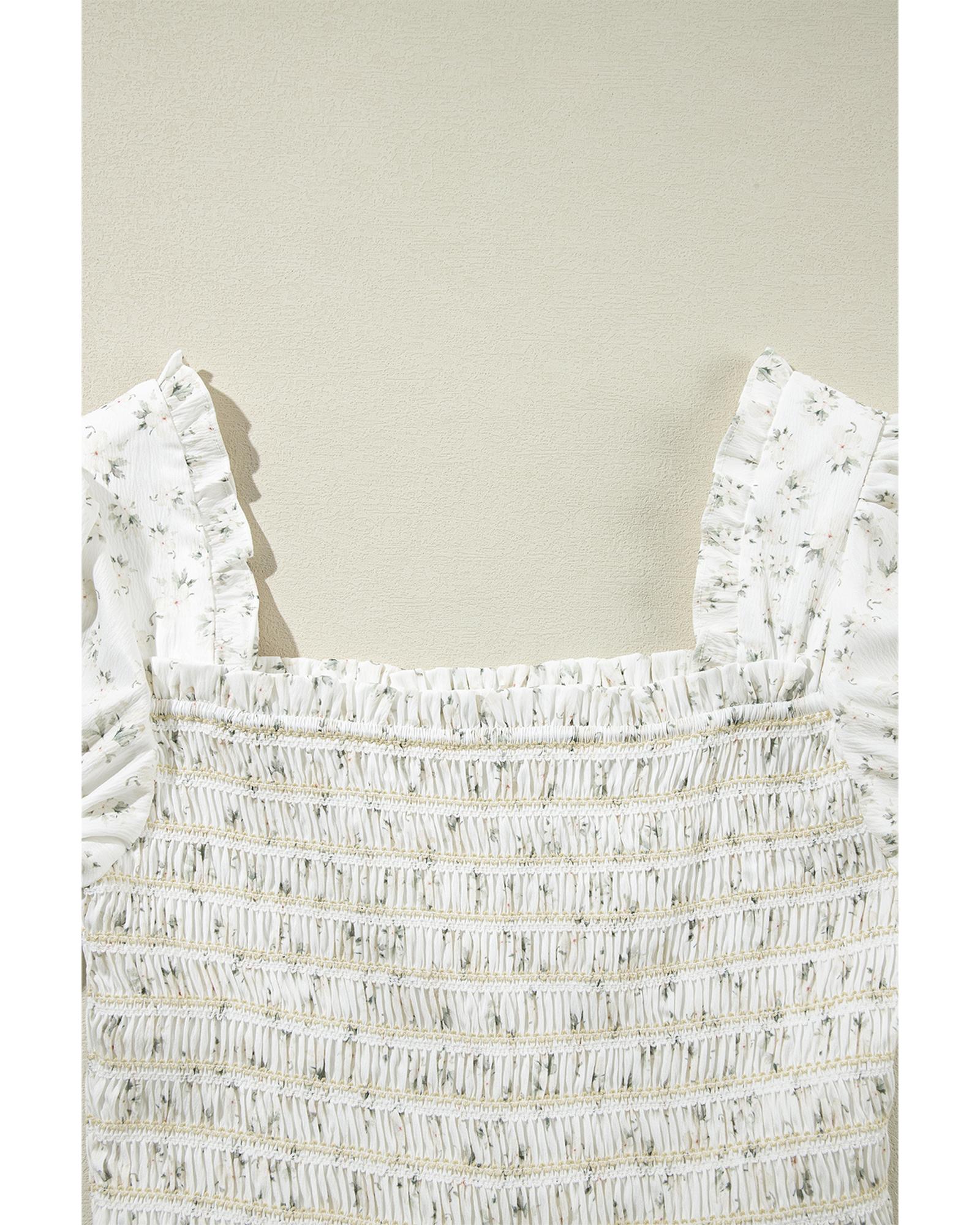 White Boho Floral Smocked Wide Leg Short Puff Sleeve Jumpsuit – L