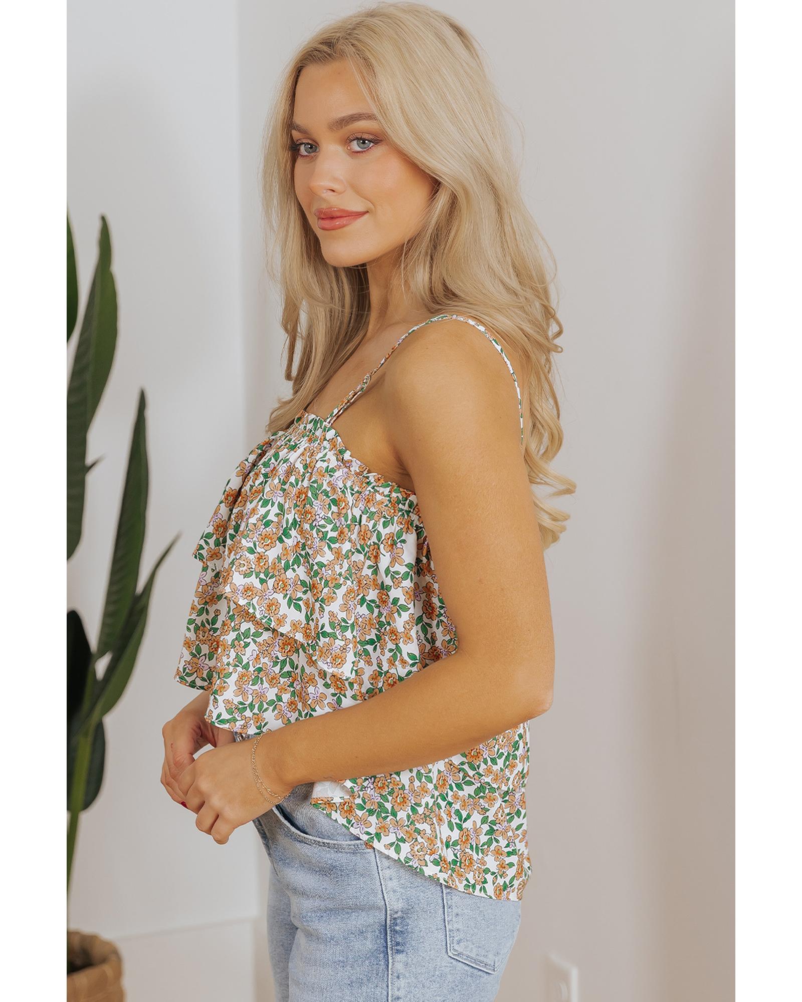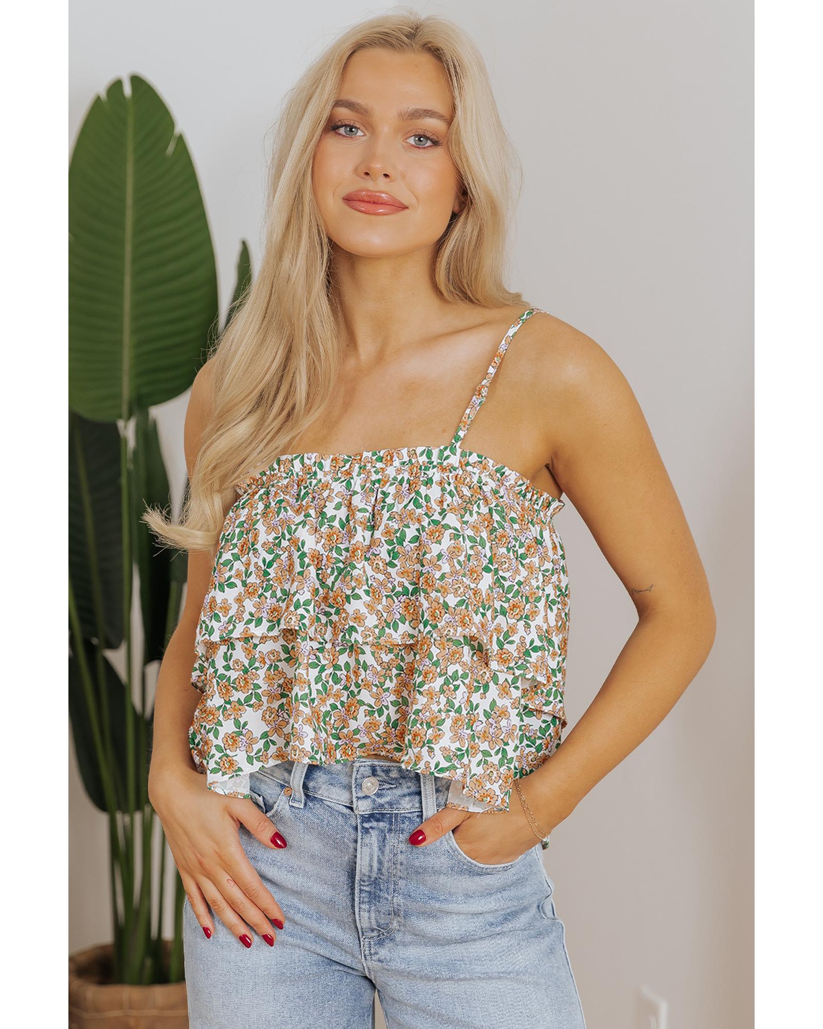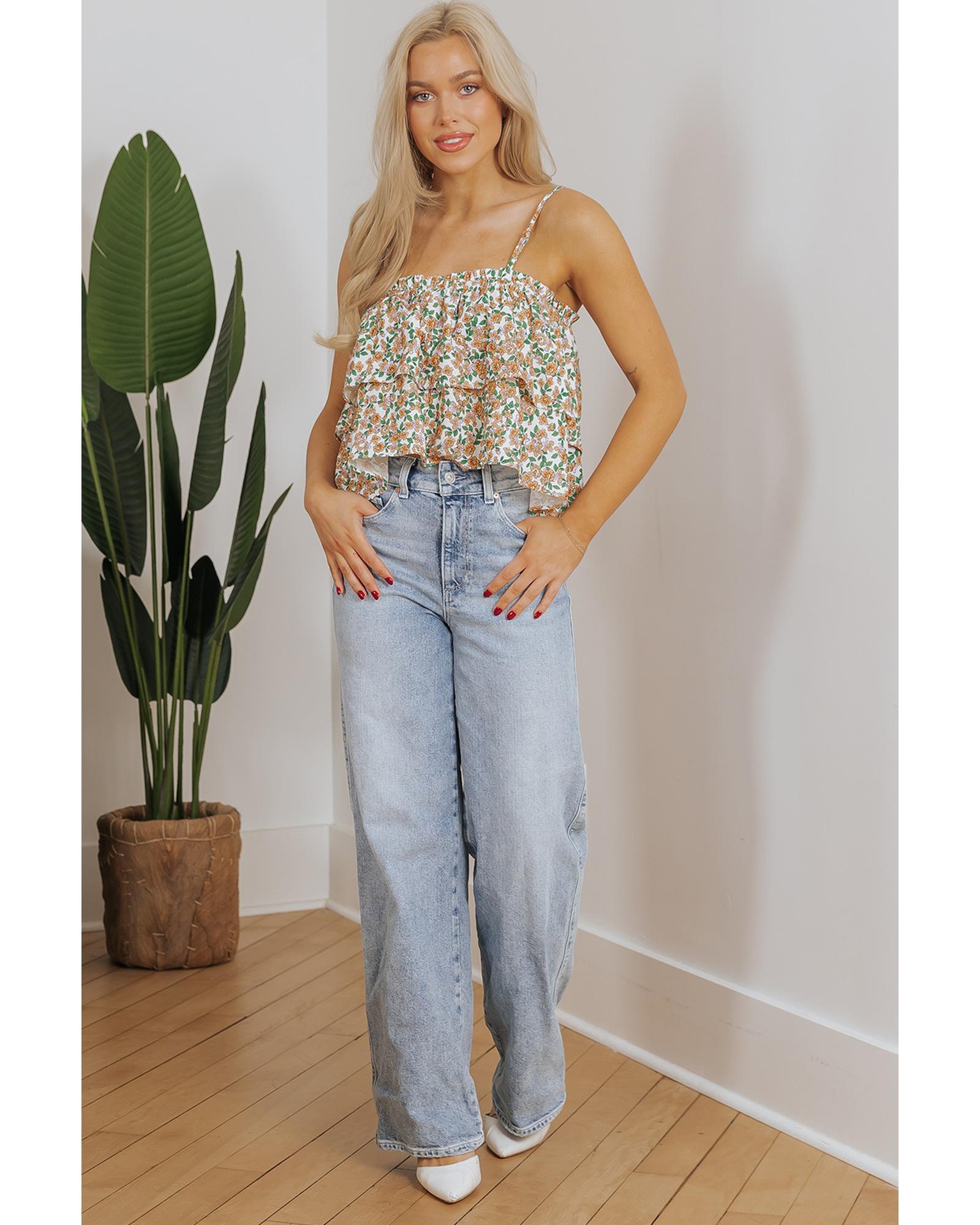 White Boho Floral Spaghetti Strap Ruffle Summer Tank Top – M
