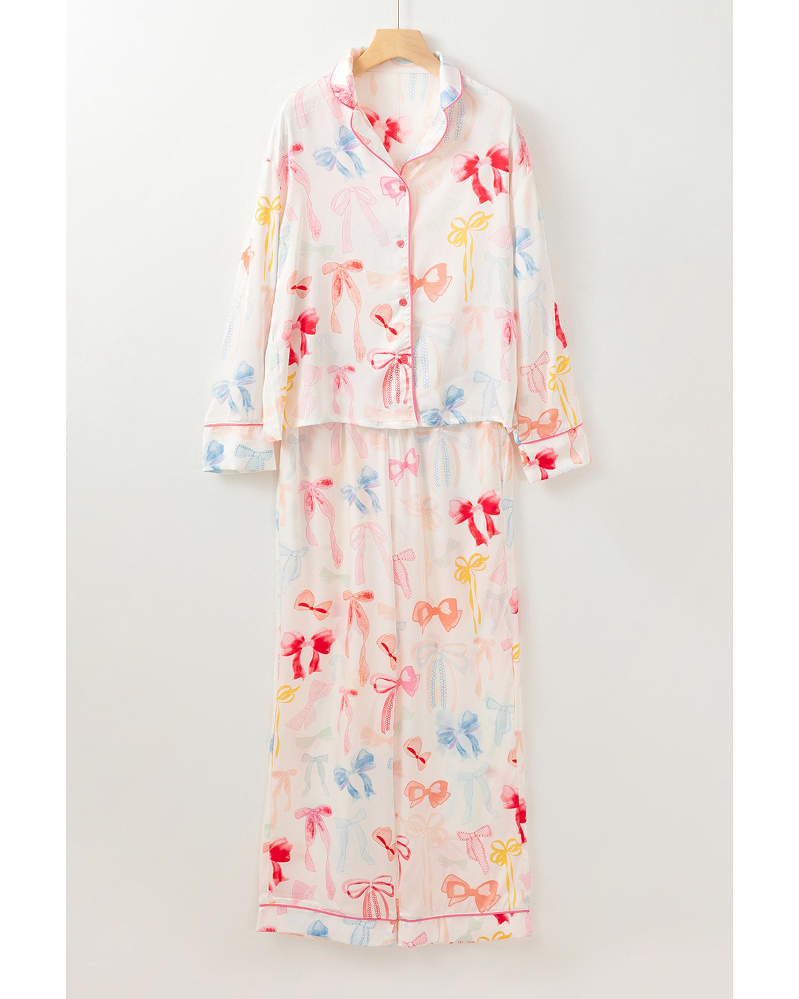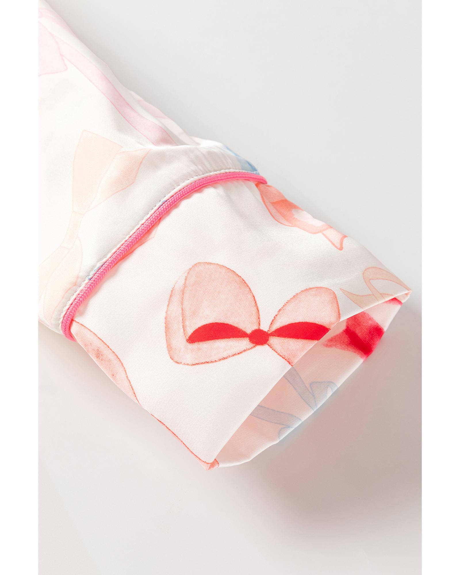 White Bow Knot Print Lapel Collar Wide Leg Satin Pajama Set – L