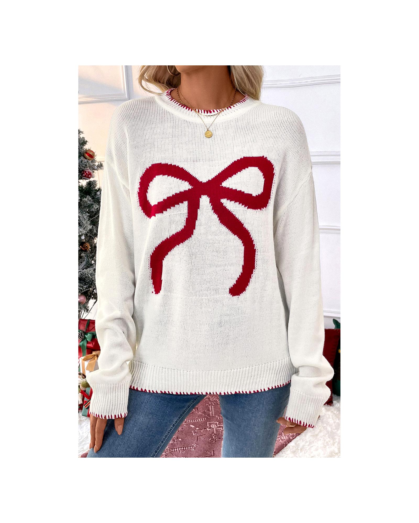 White Bow Pattern Contrast Trim Christmas Loose Graphic Sweater – L