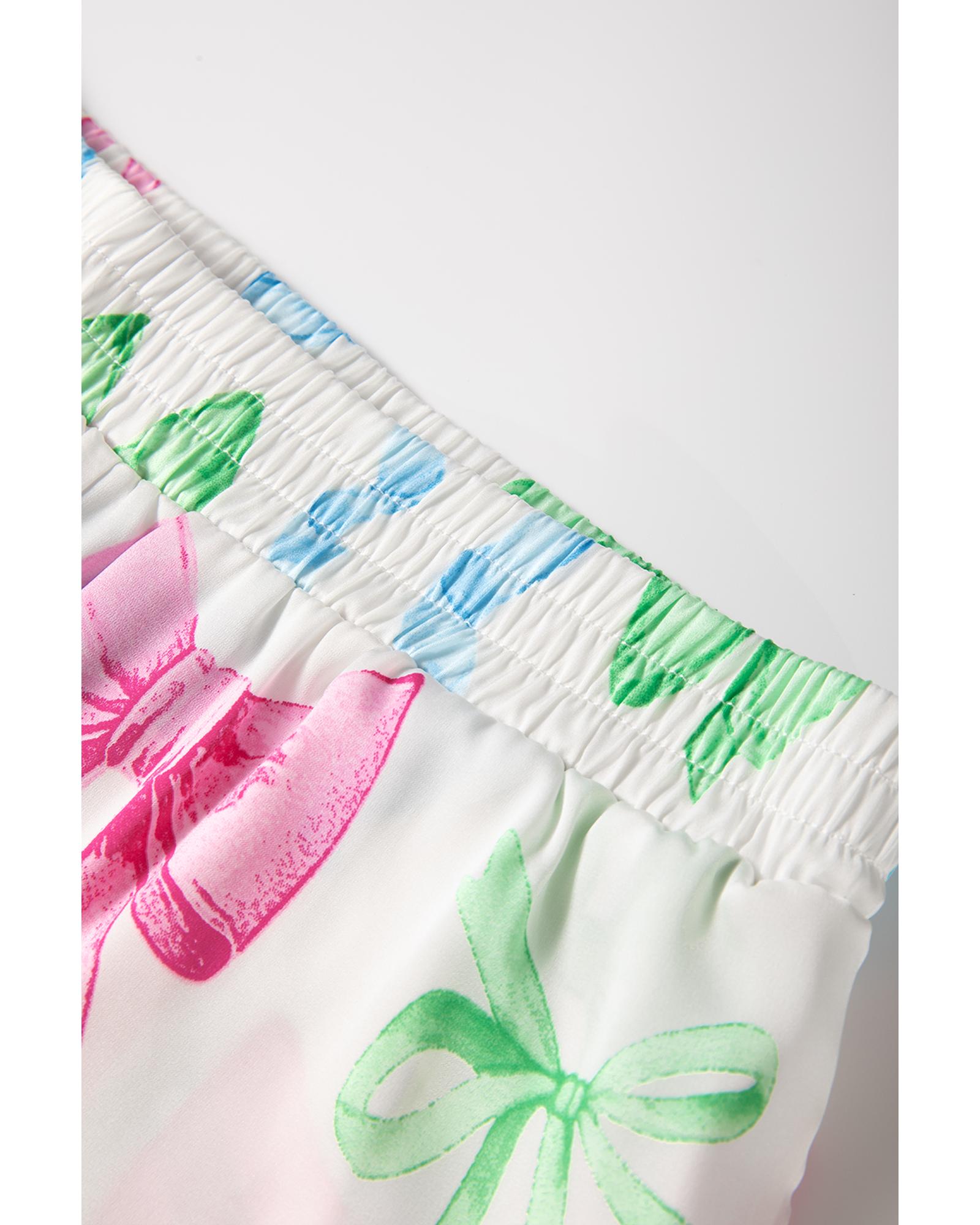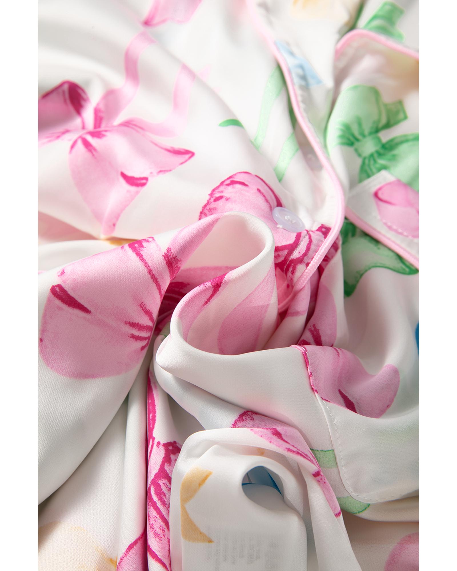 - White Bowknot Print Buttoned Shirt High Waist Shorts Pajama Set
