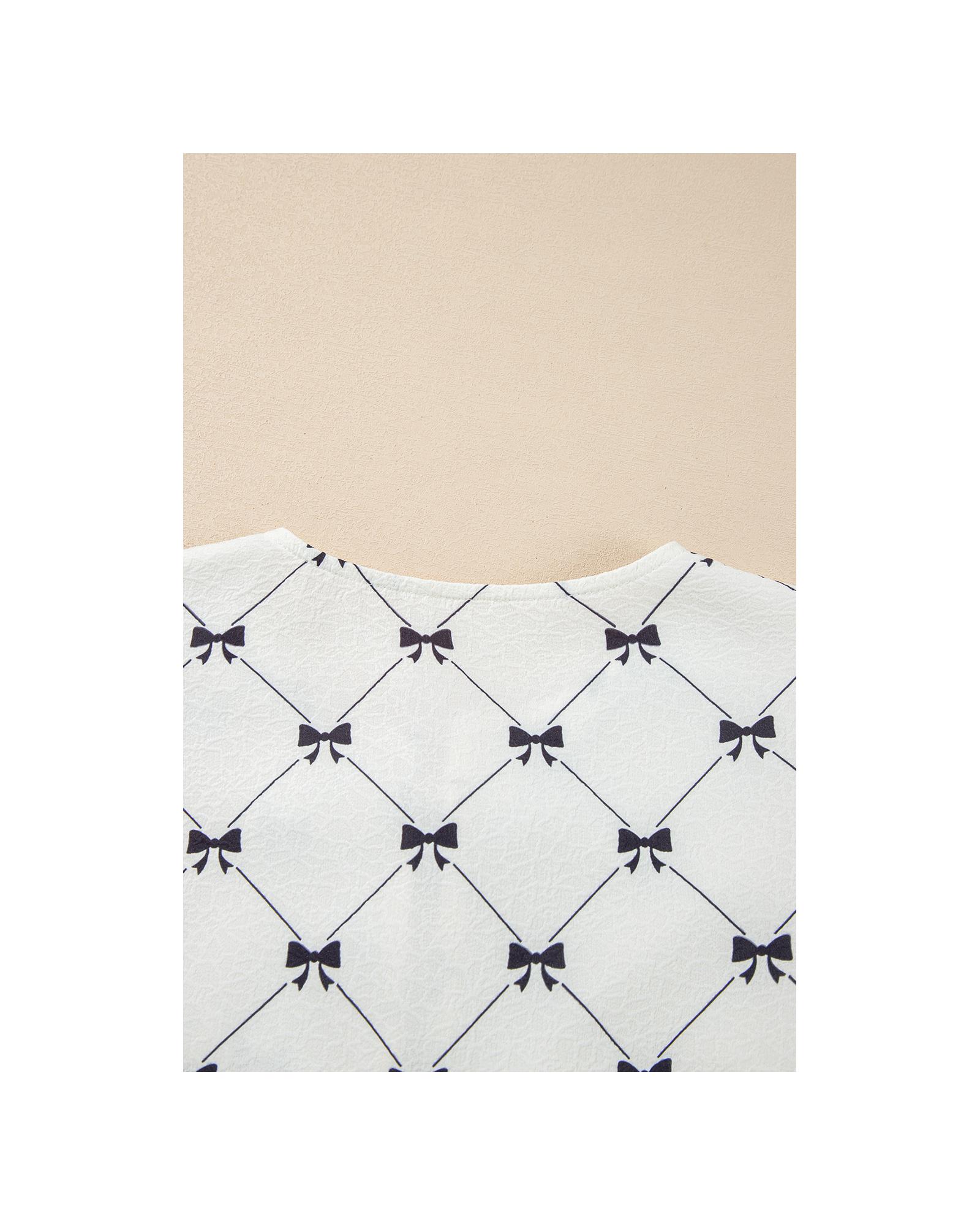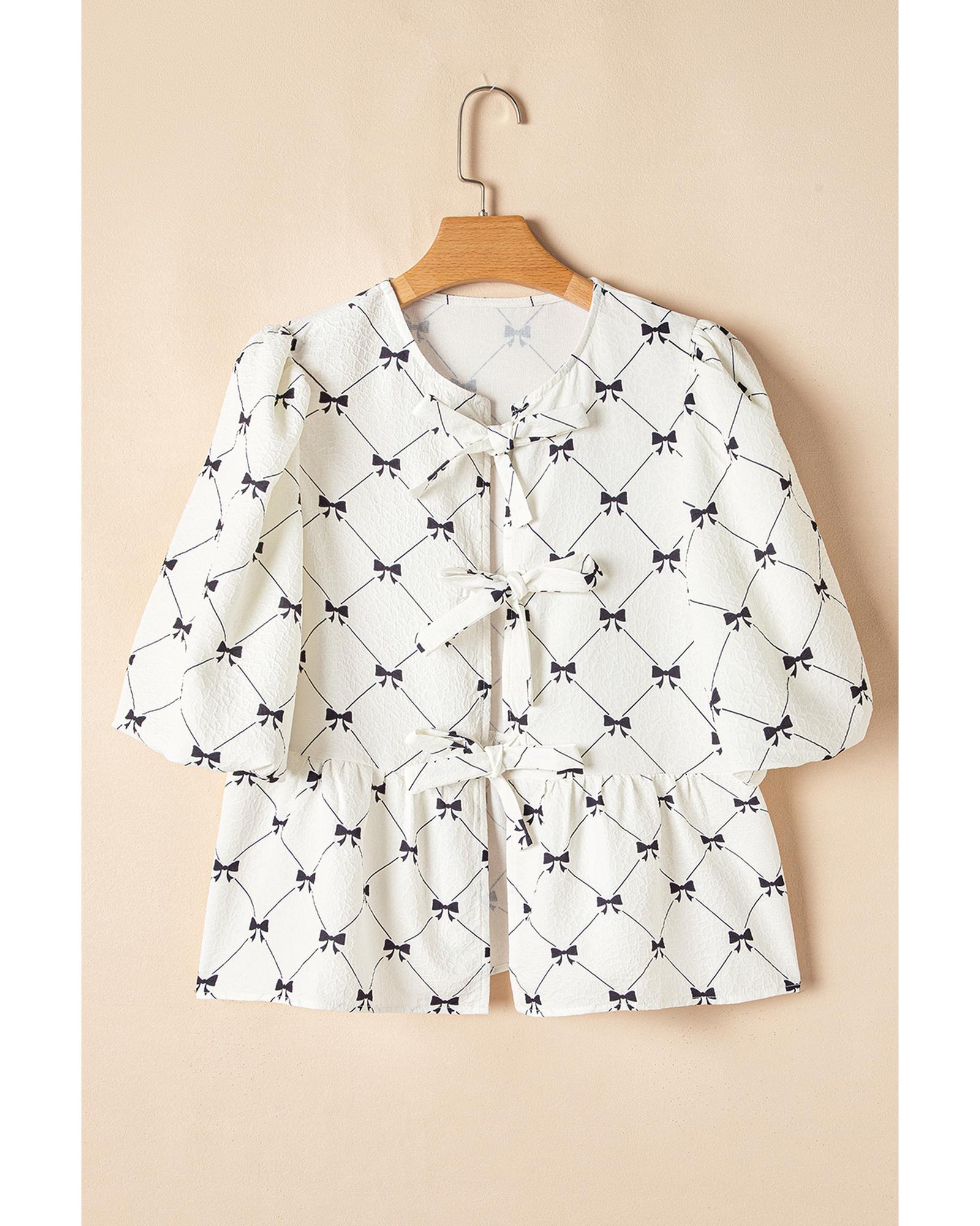 White Bowknot Print Front Knots Bubble Sleeve Blouse – L