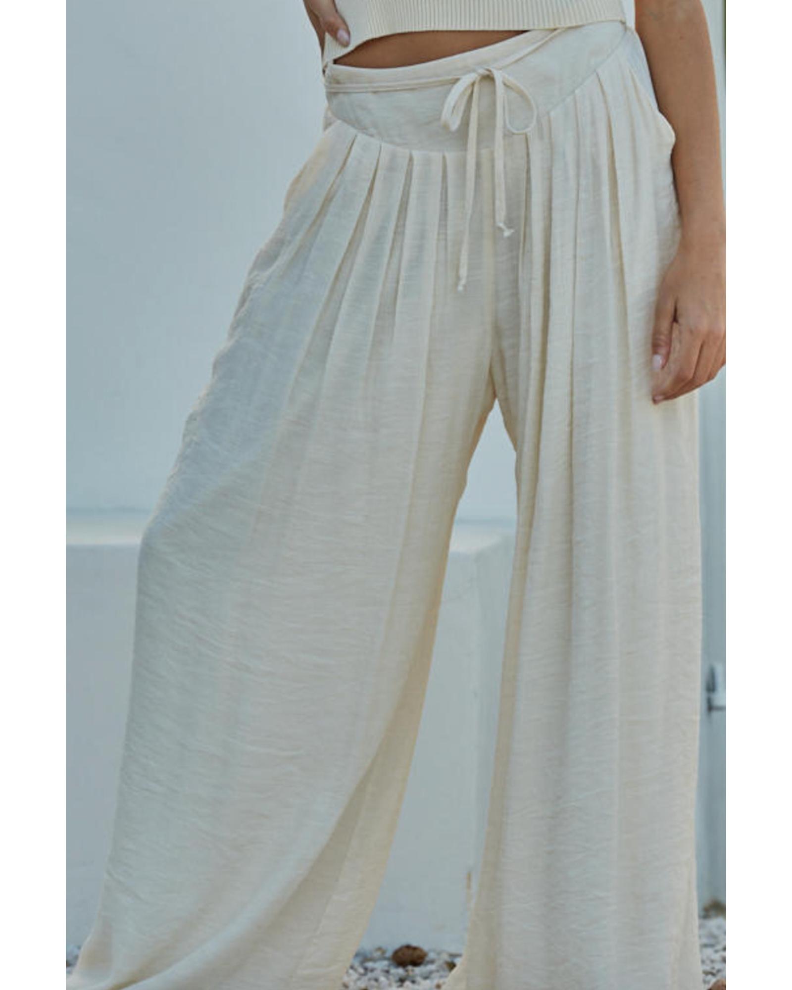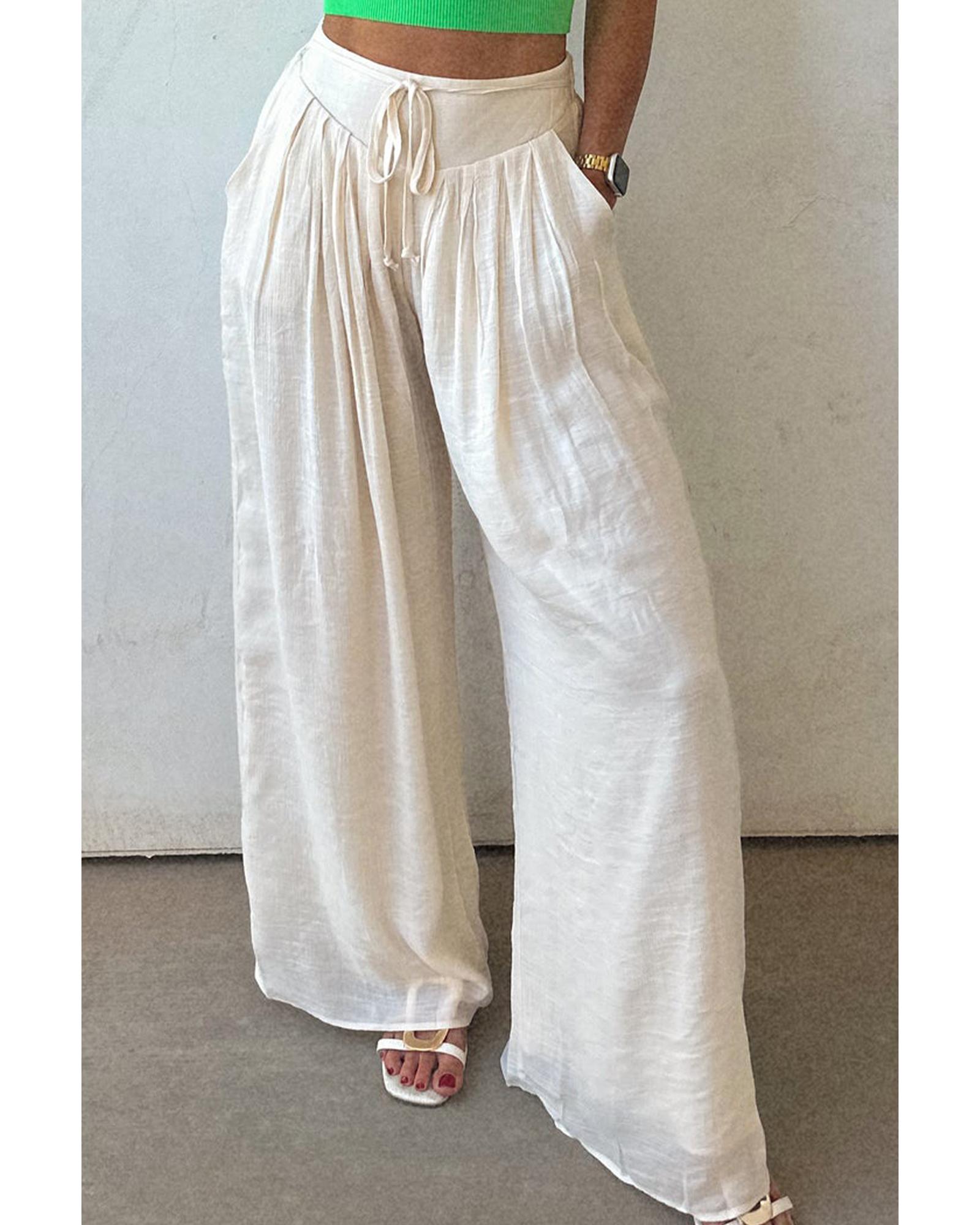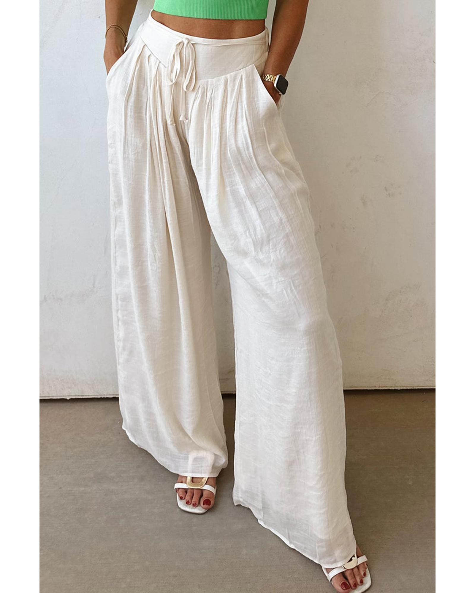 • White casual tie waist pleated wide leg pants