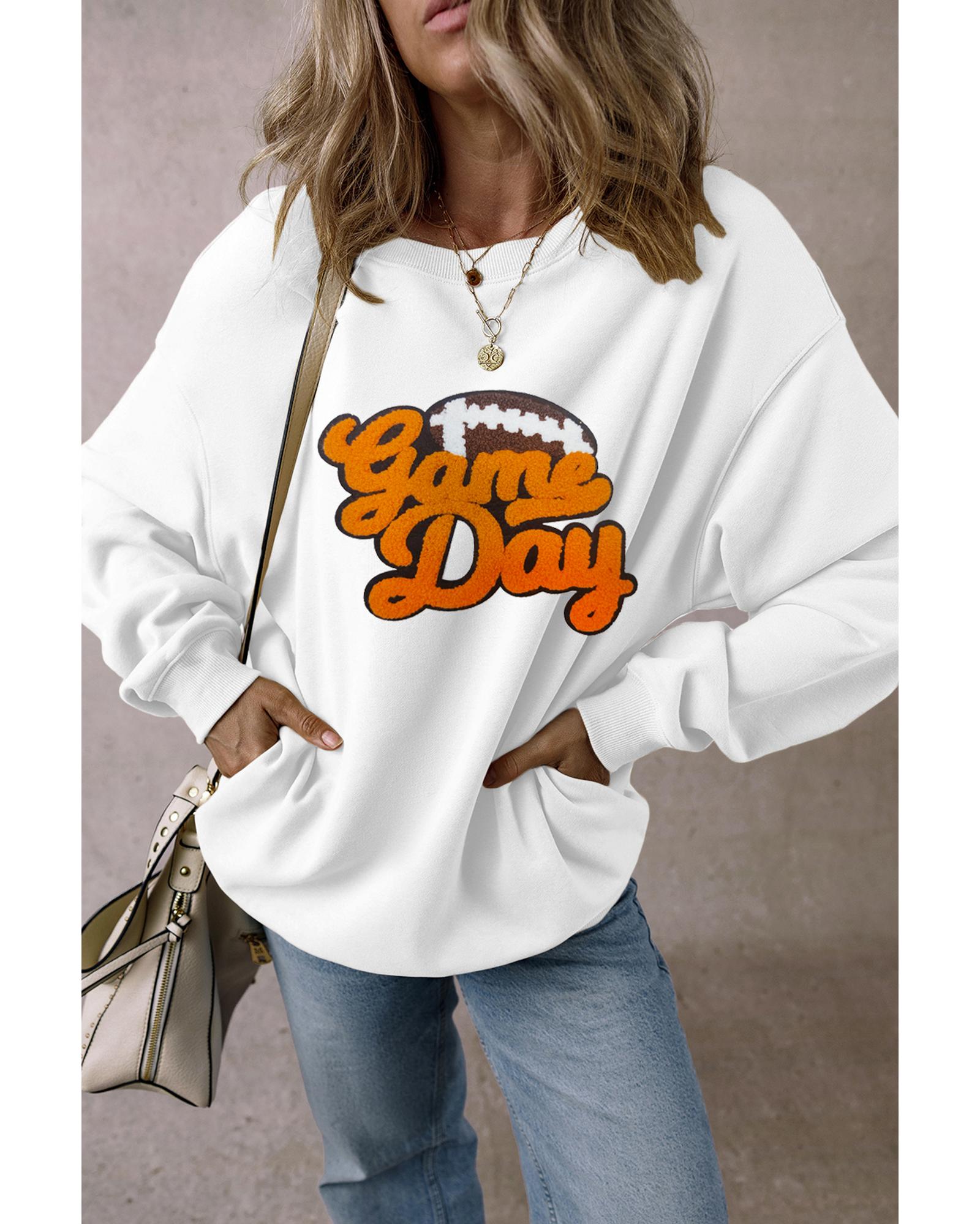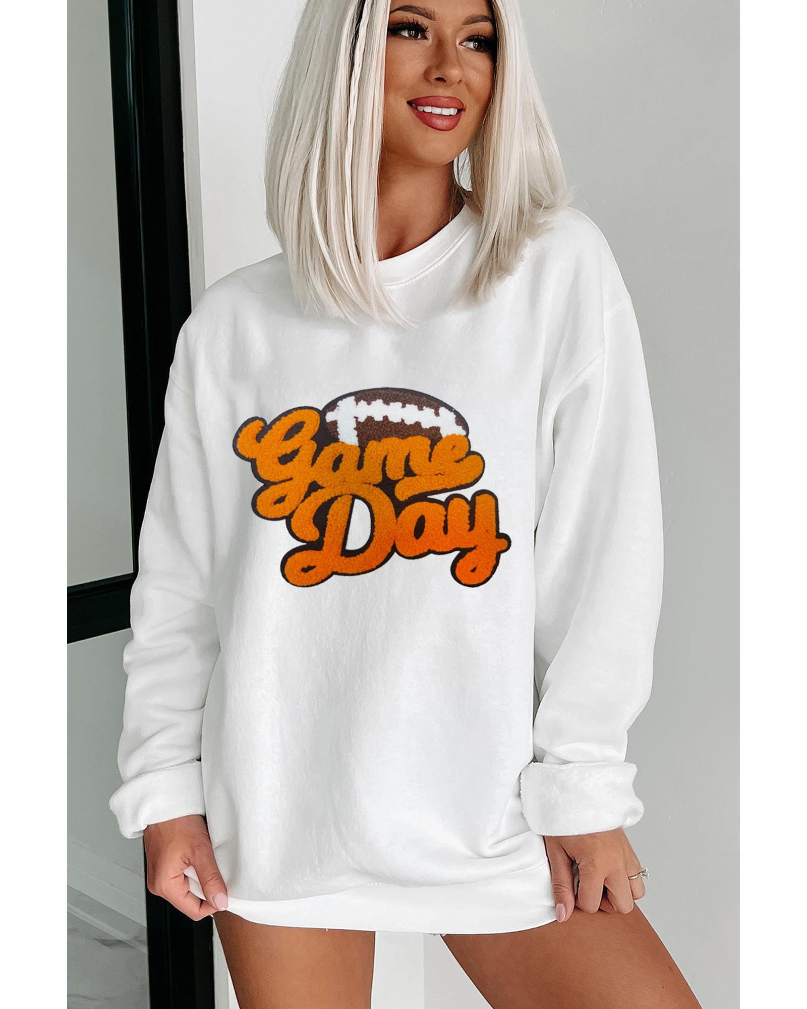 White Chenille Game Day Rugby Football Pattern Pullover Sweatshirt – S