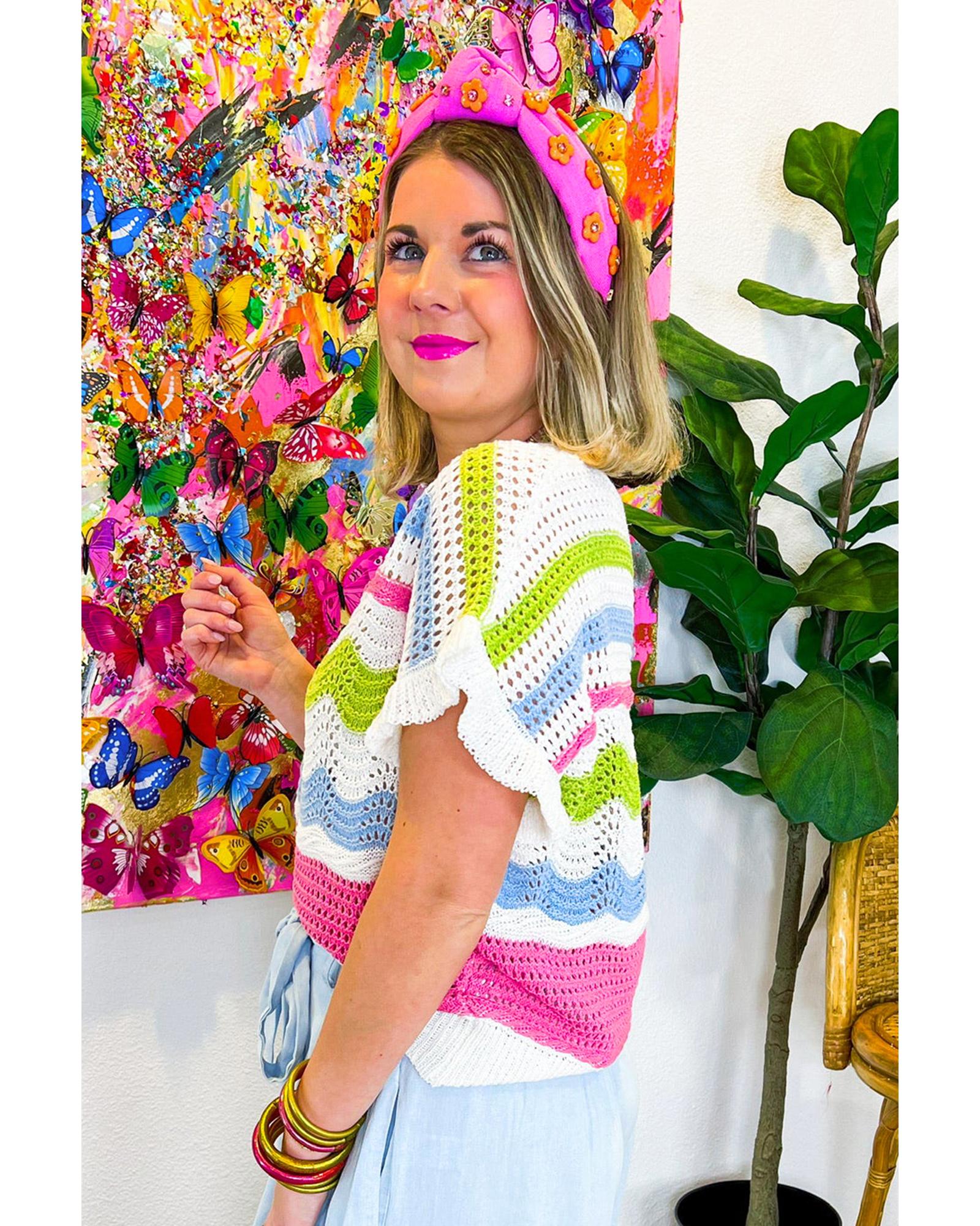 - White Colorblock Crochet Knit Ruffled Short Sleeve Sweater Top