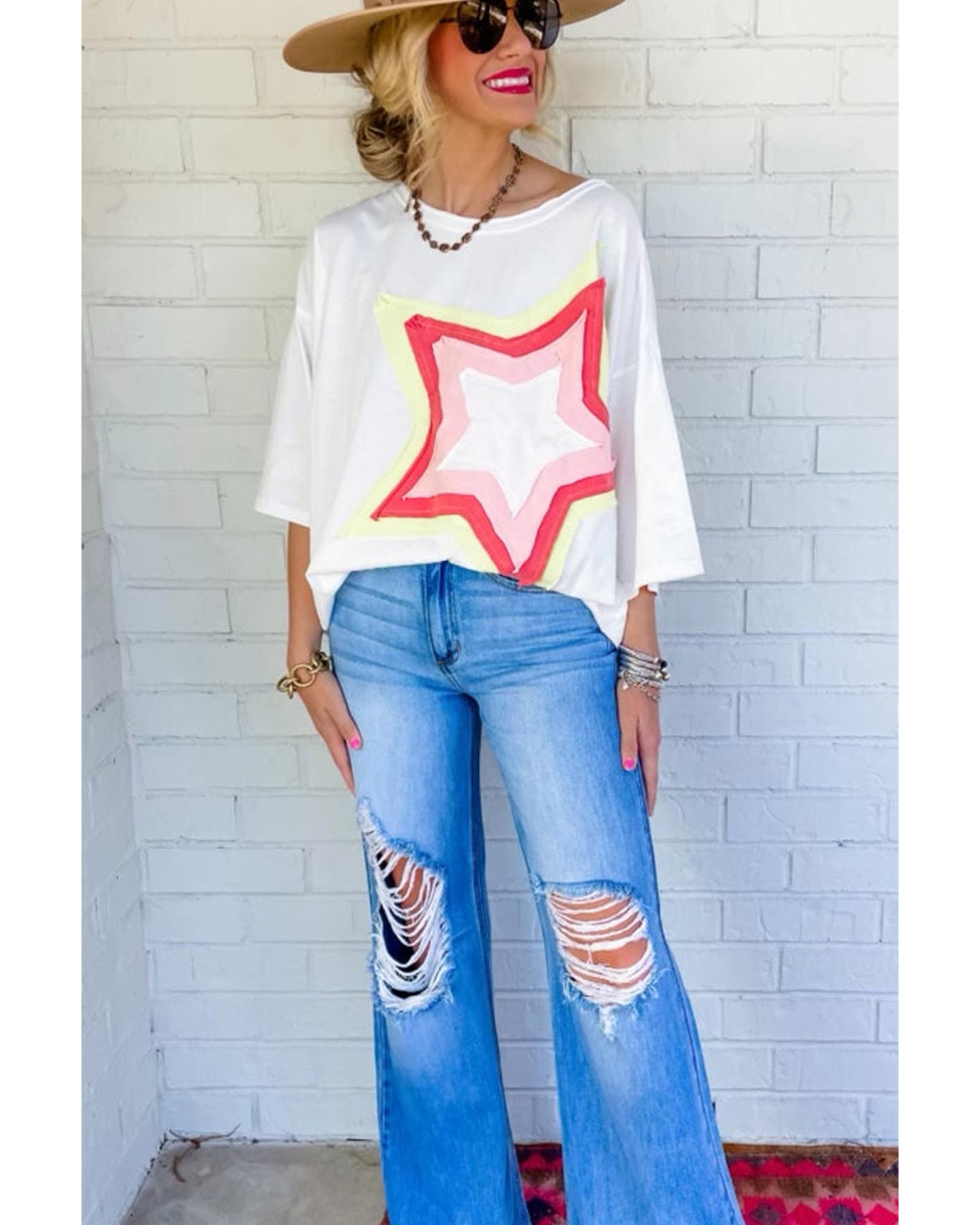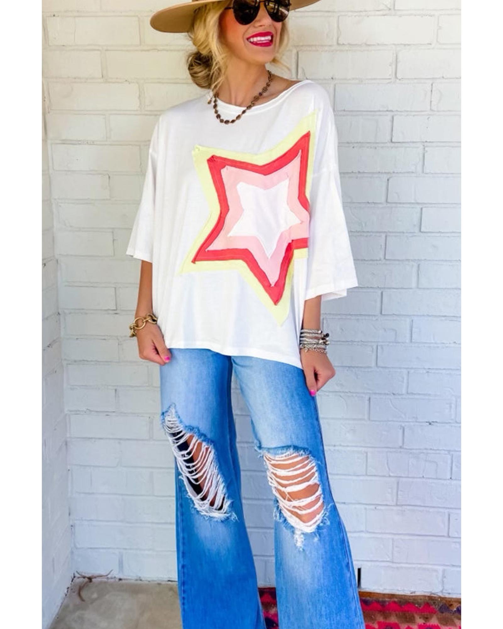 White Colorblock Star Patched Half Sleeve Oversized Tee – L