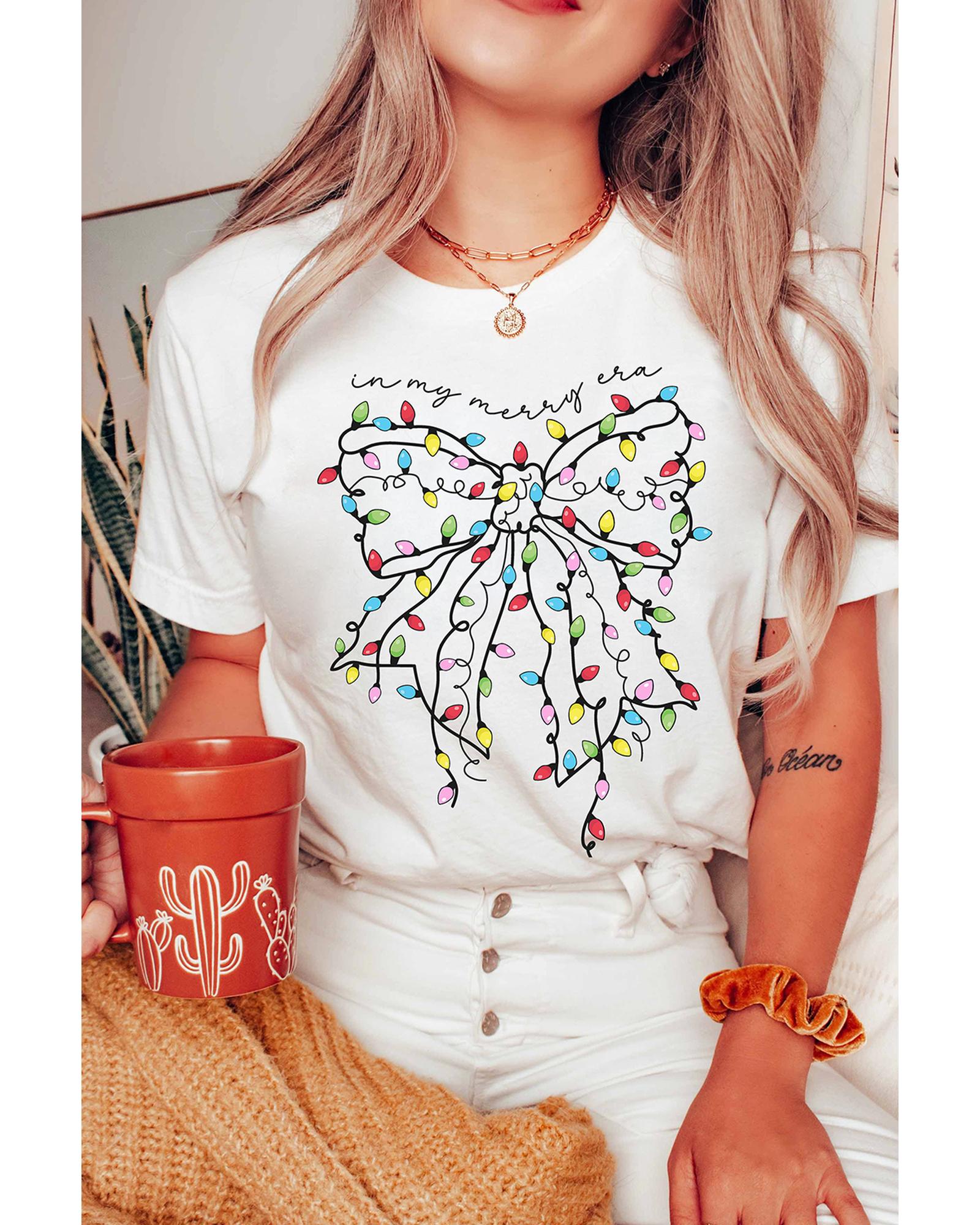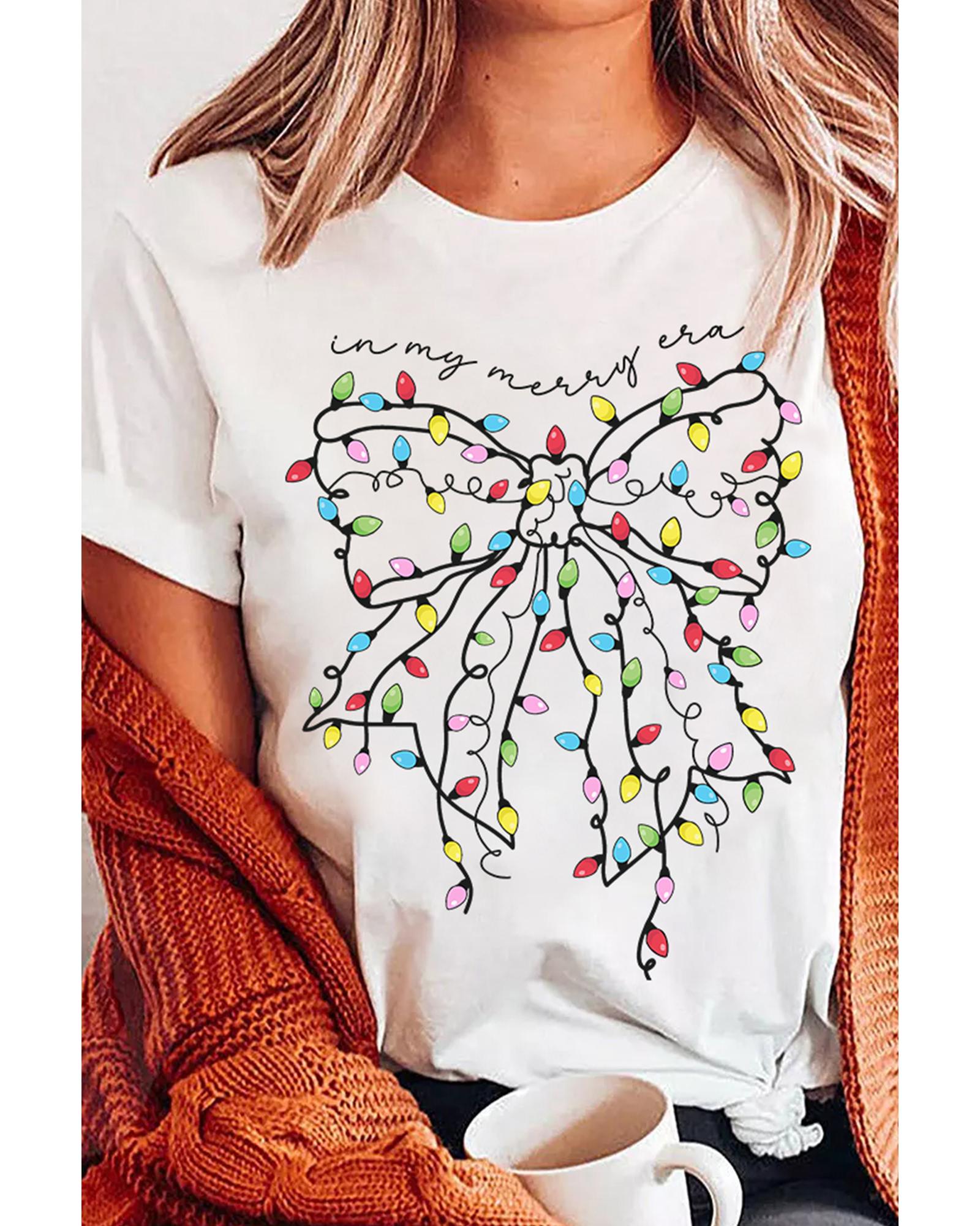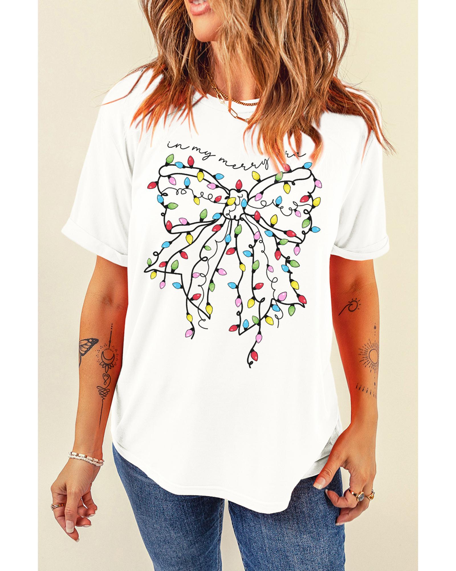 - White Colored Light Bowknot Graphic Crewneck T Shirt