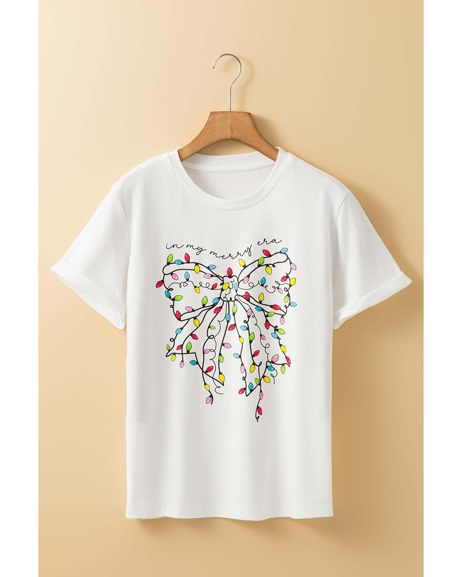 - White Colored Light Bowknot Graphic Crewneck T Shirt