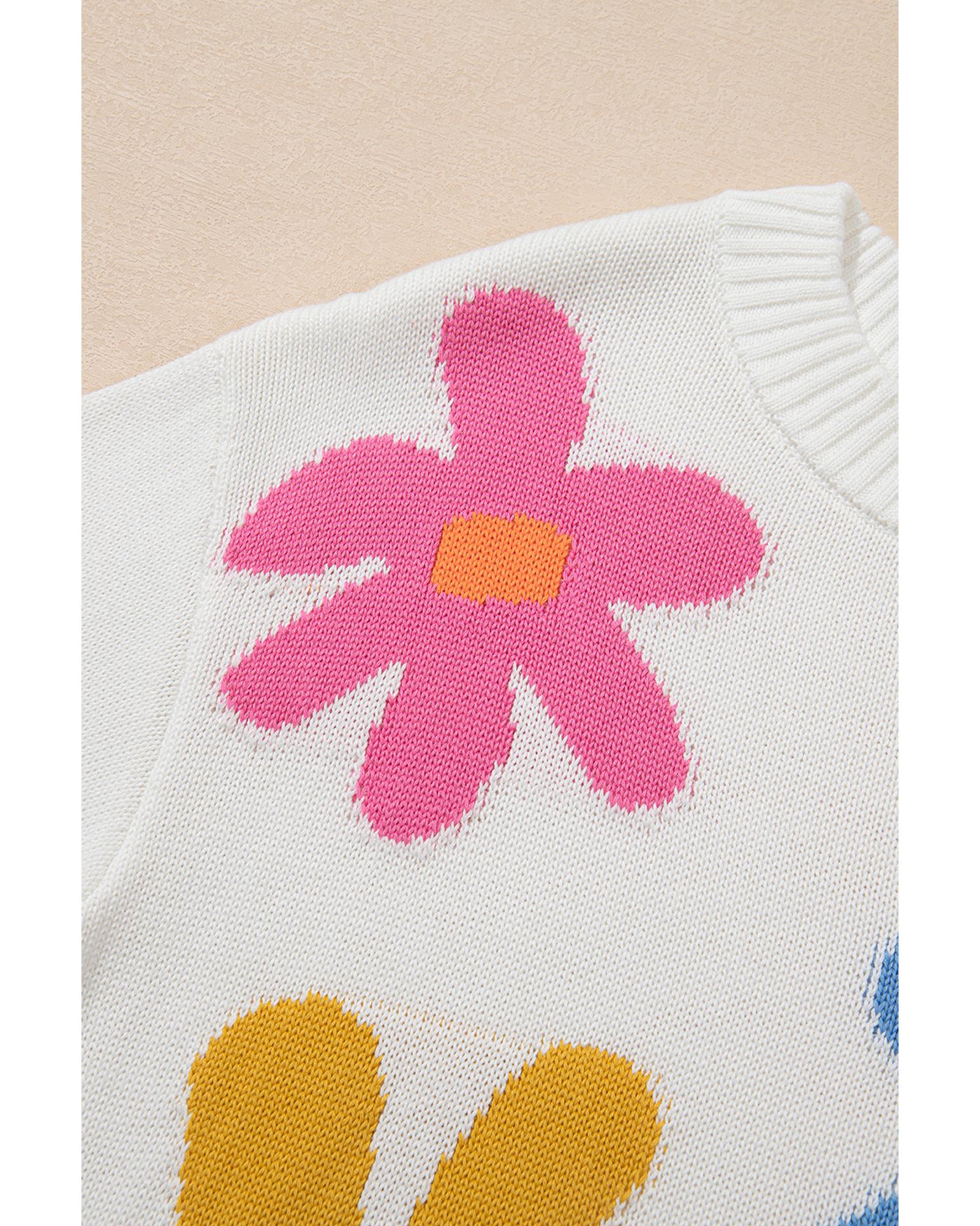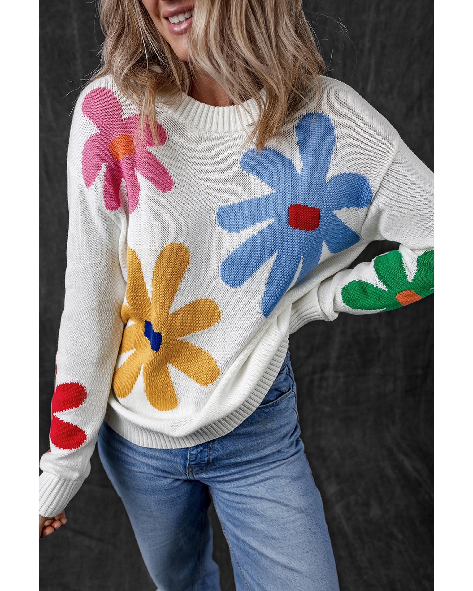 White Colorful Big Flower Pattern Crewneck Sweater – M