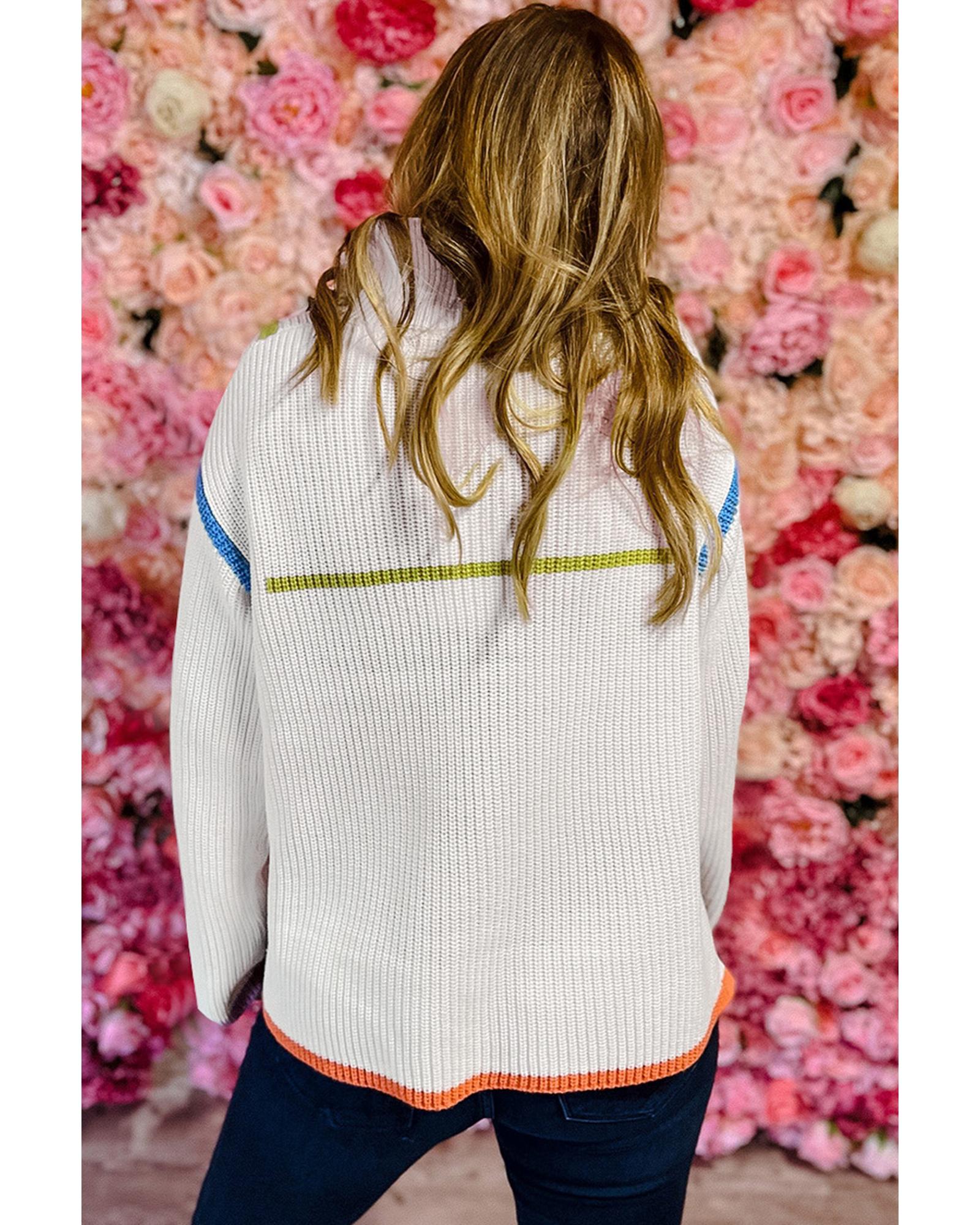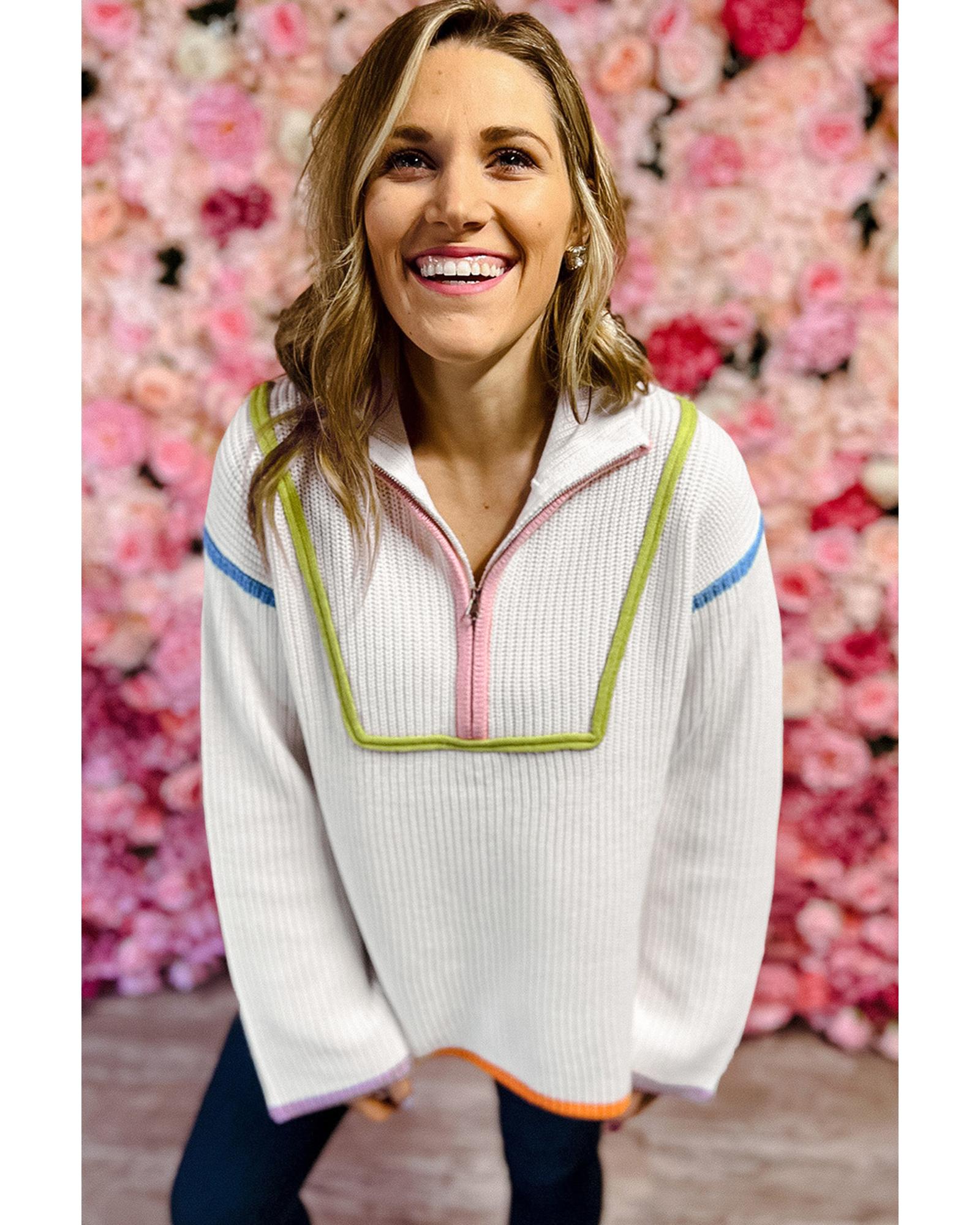 - White Colorful Edge Quarter Zip Drop Shoulder Sweater