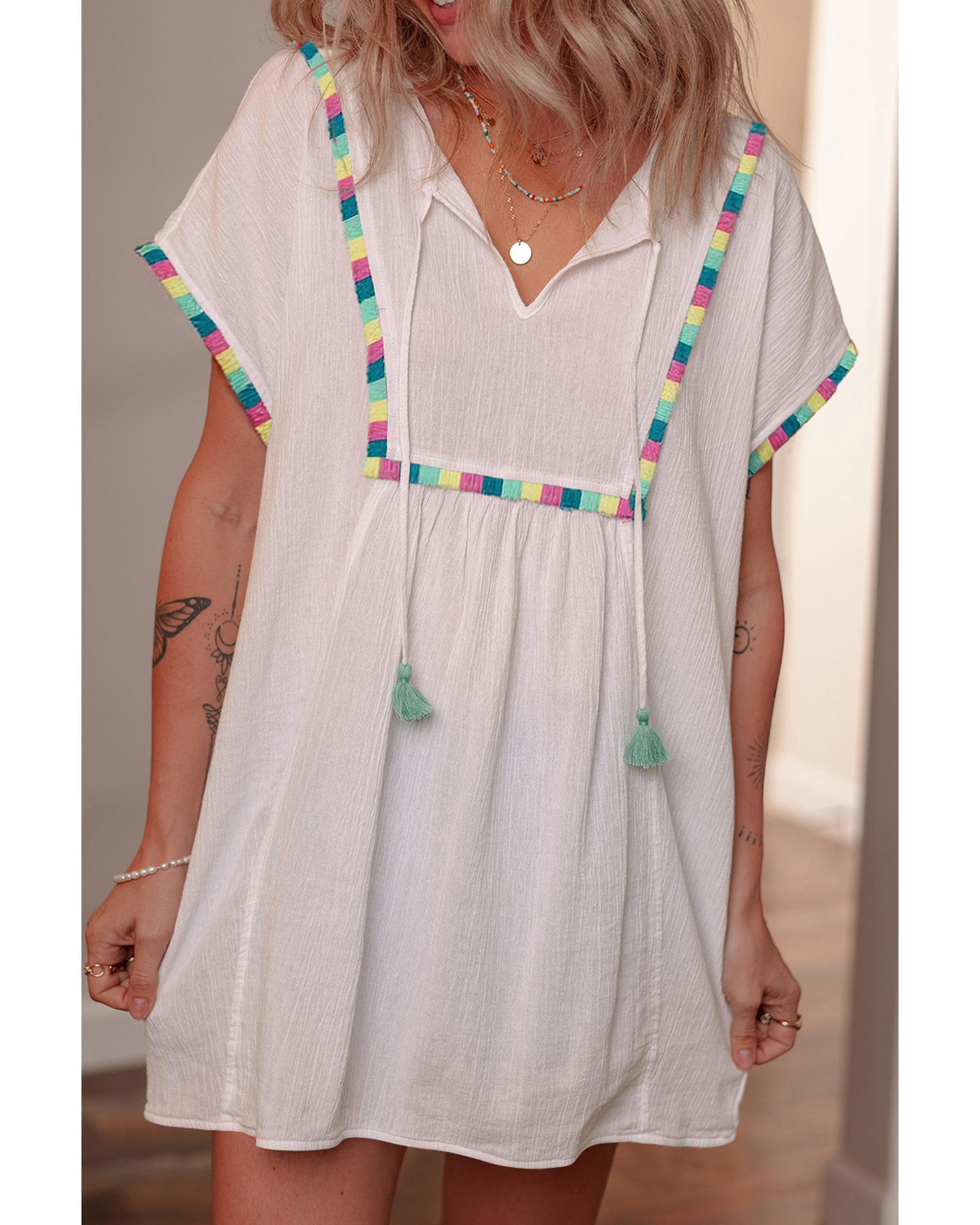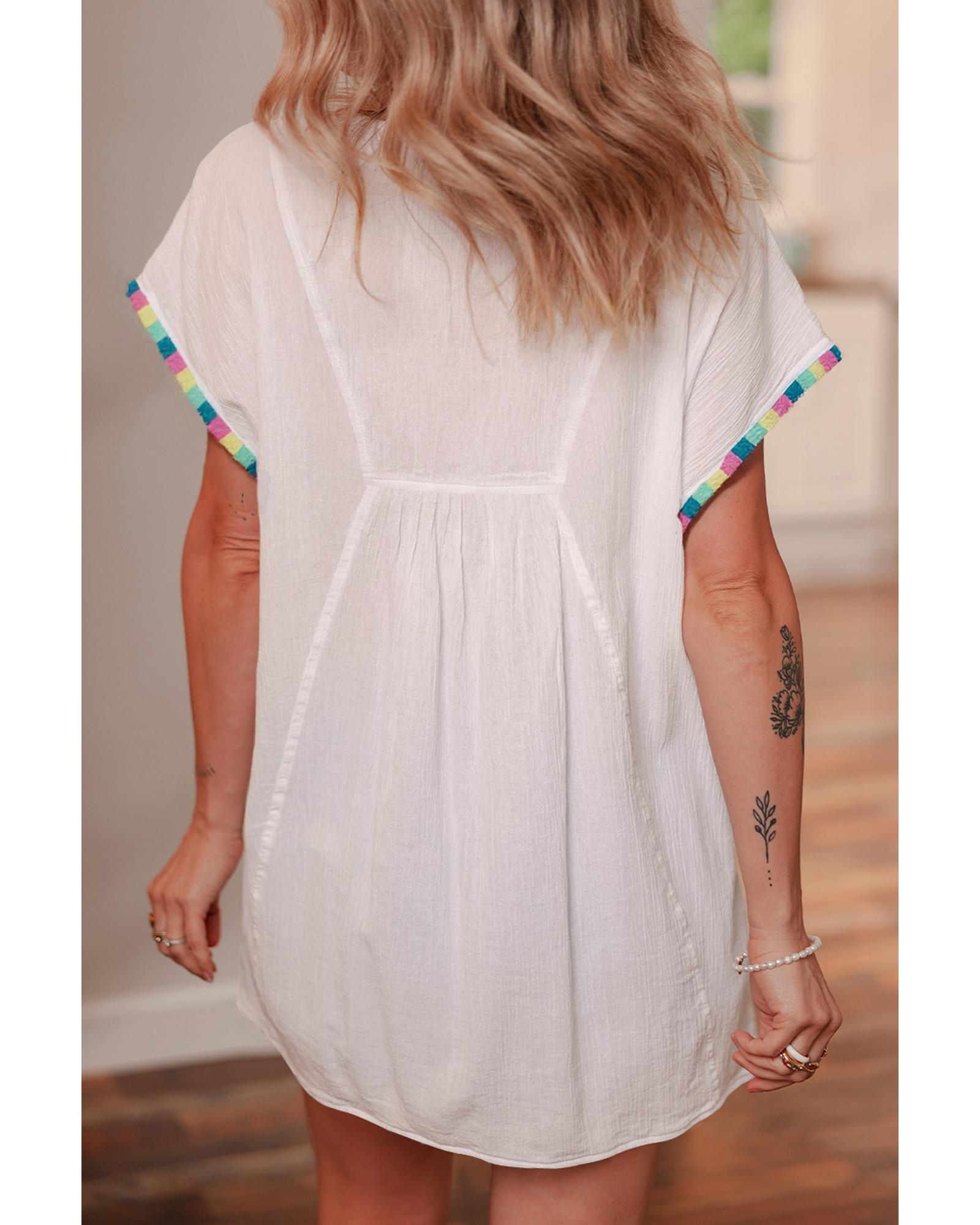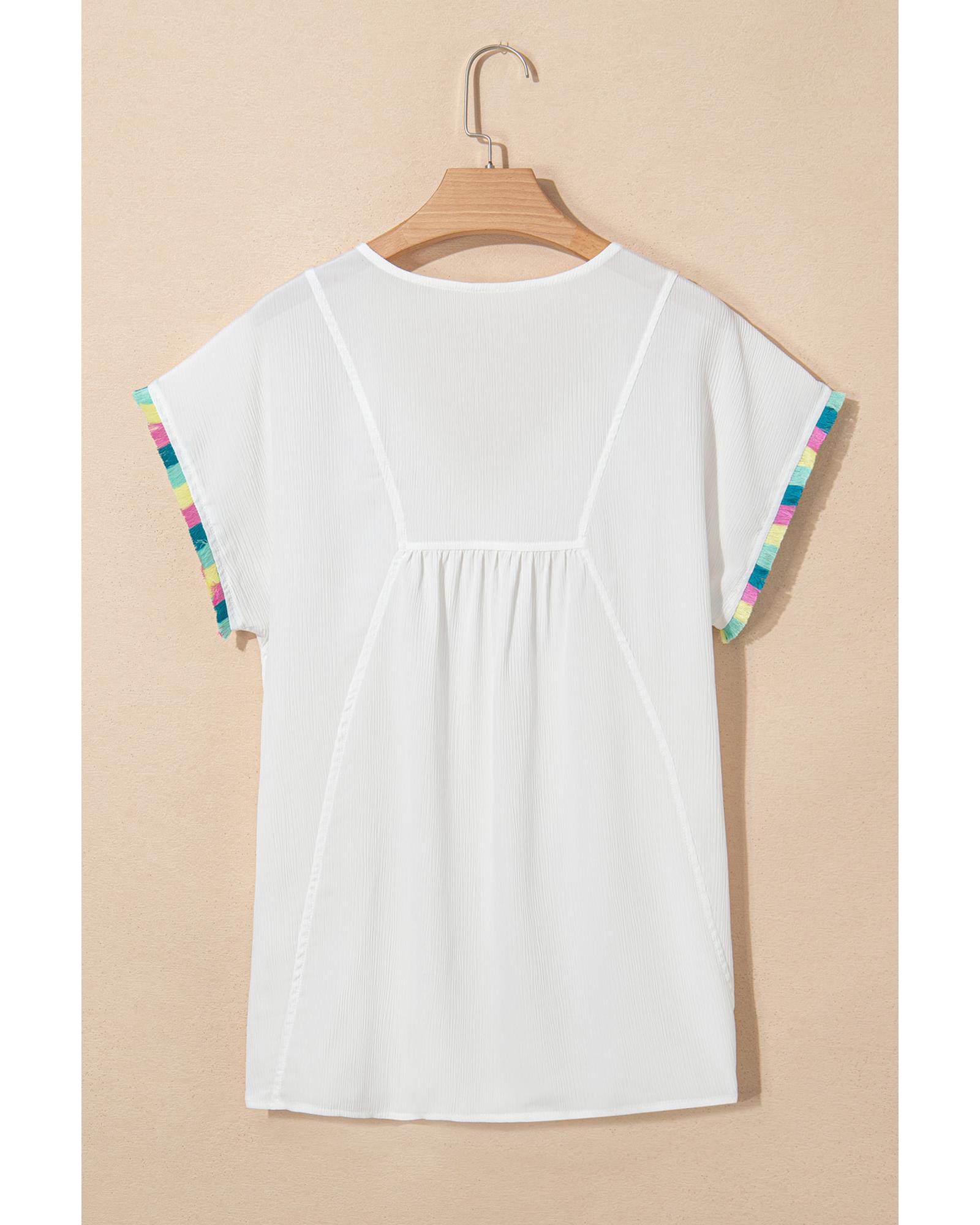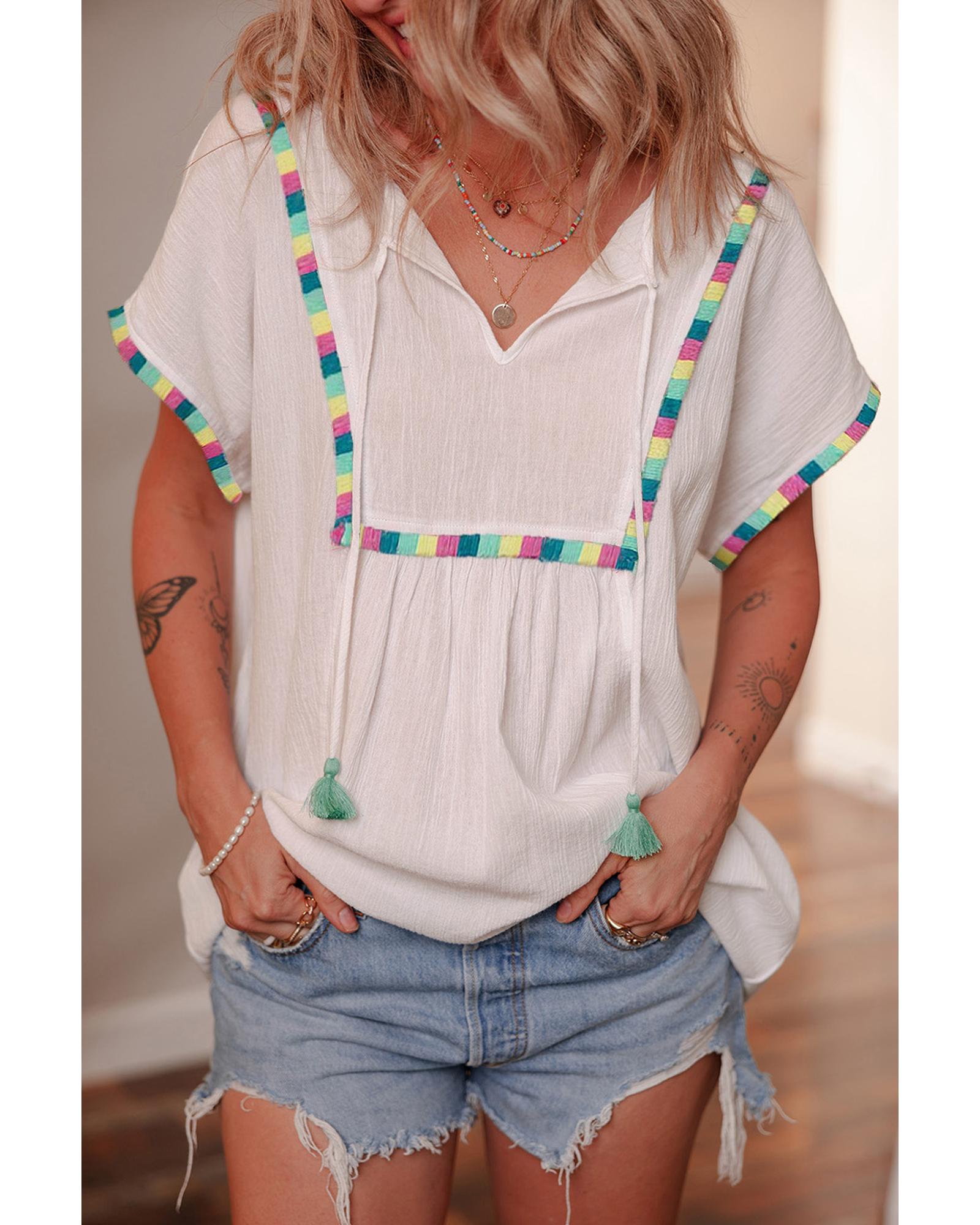 White Colorful Fringed Detail Tassel Tie Neck Short Sleeve Blouse – M
