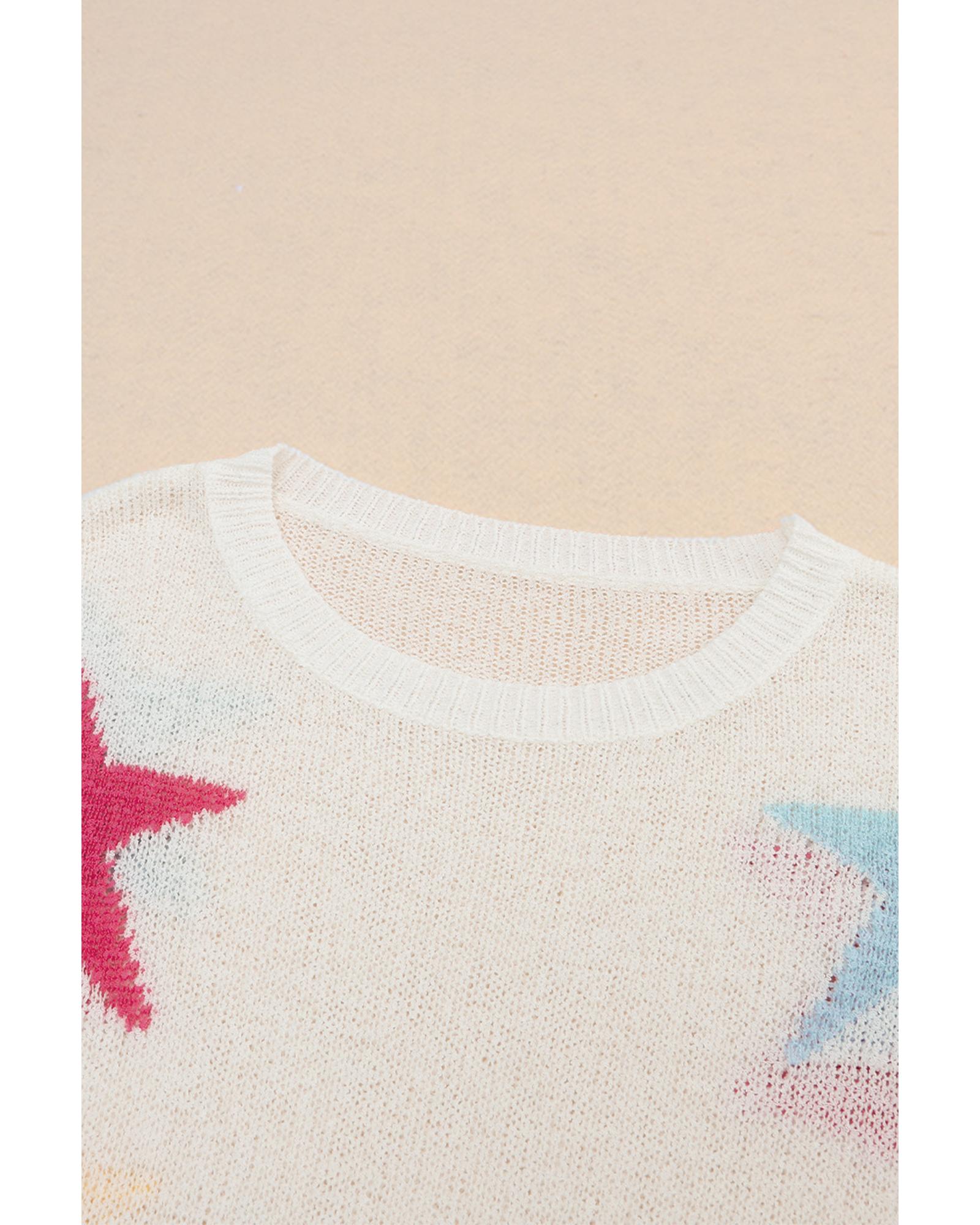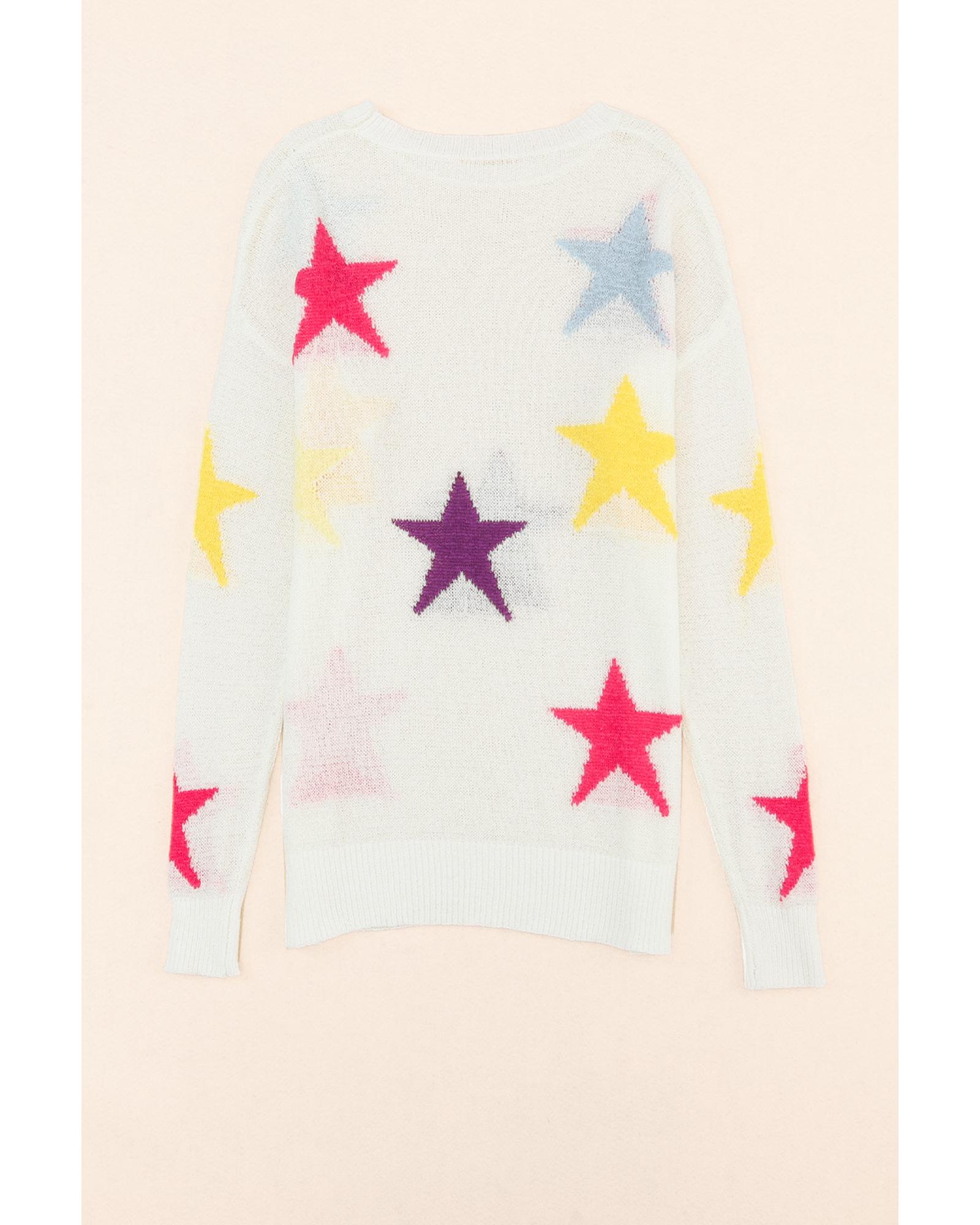 White knit sweater patterned with cute star print Loose fit style with crew neck drop shoulder and ribbed hem Made from lightweight material for comfort Suitable for spring fall and winter seasons Available in various sizes - Size on Tag: S