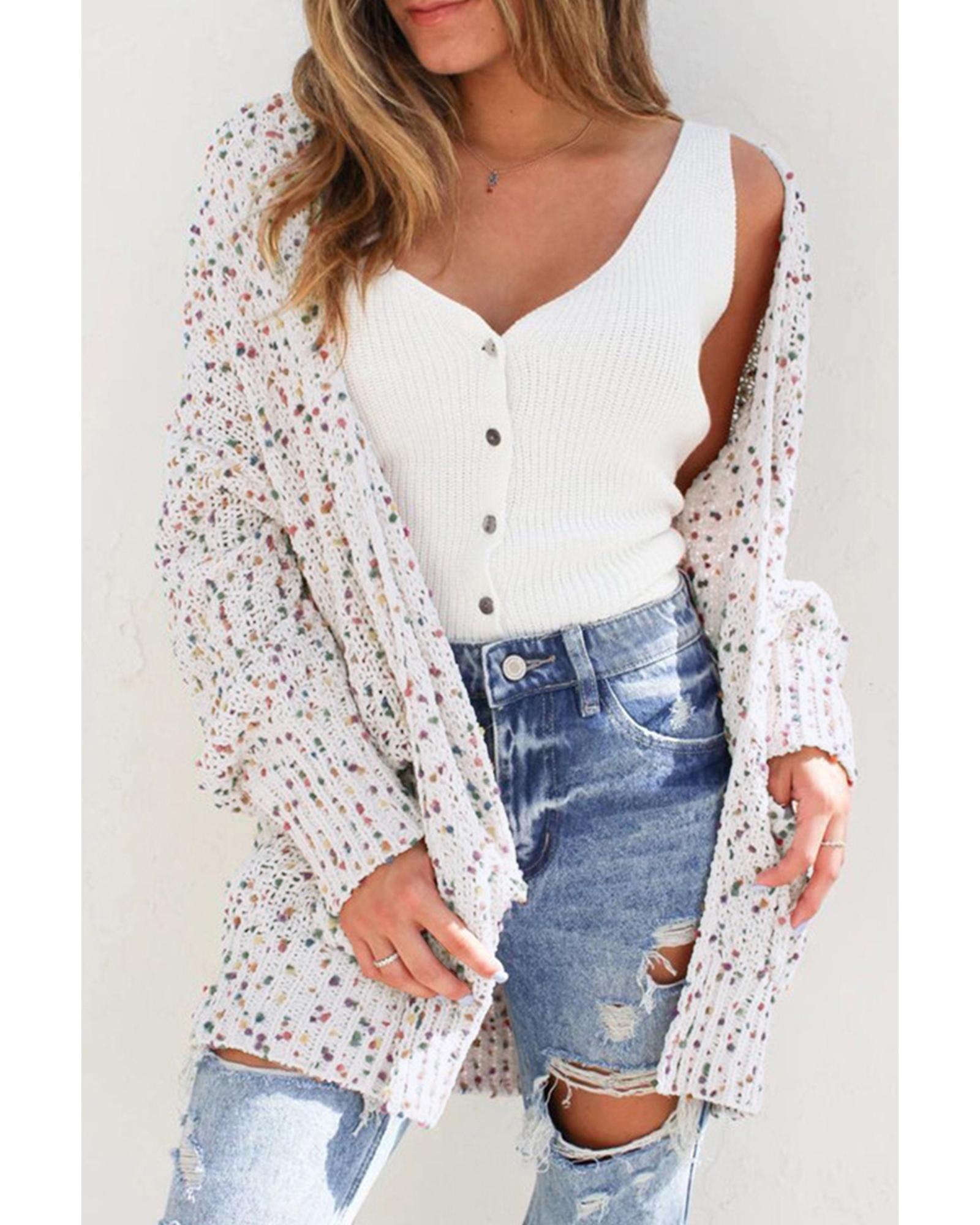- White Confetti Rib Knit Long Sleeve Cardigan