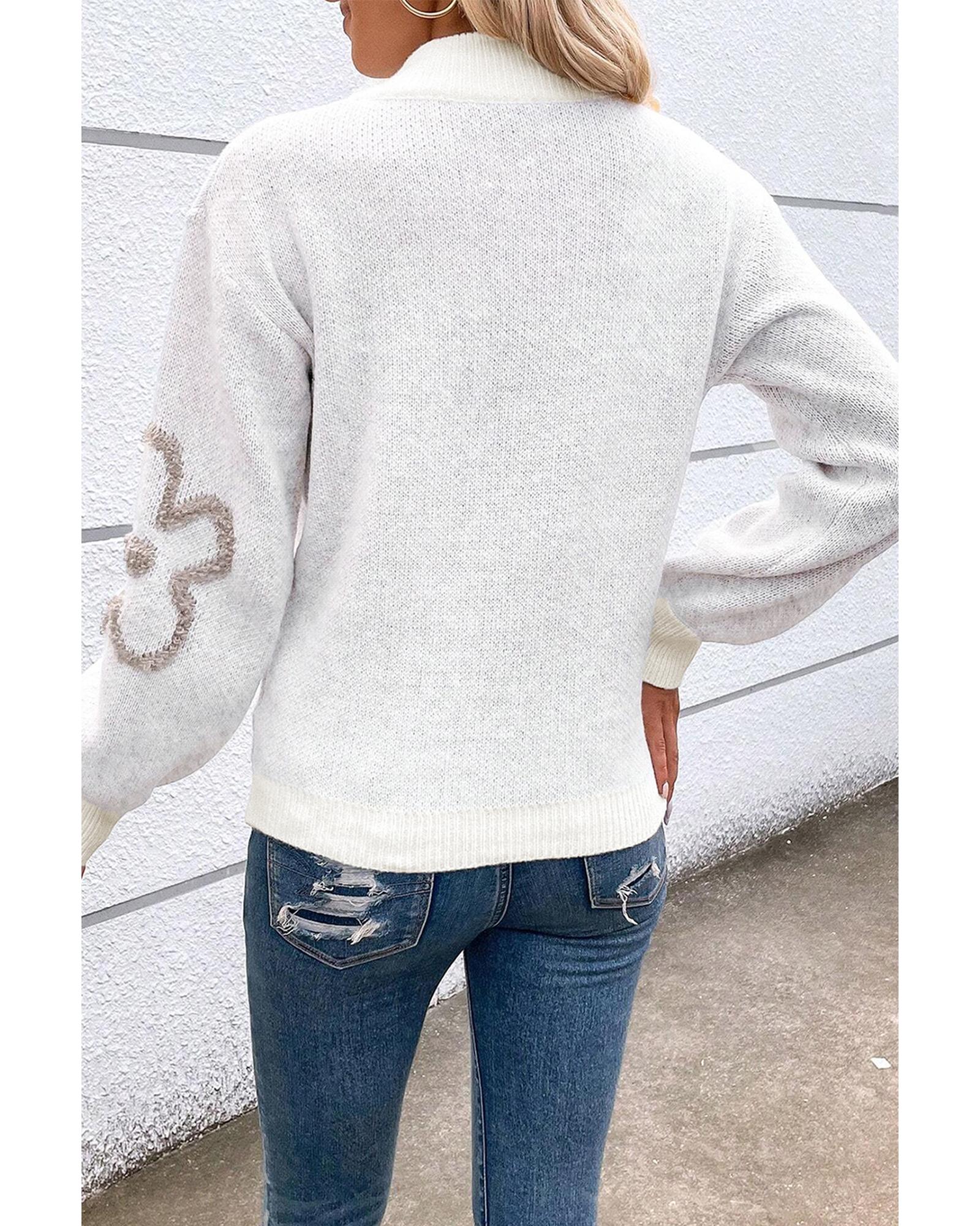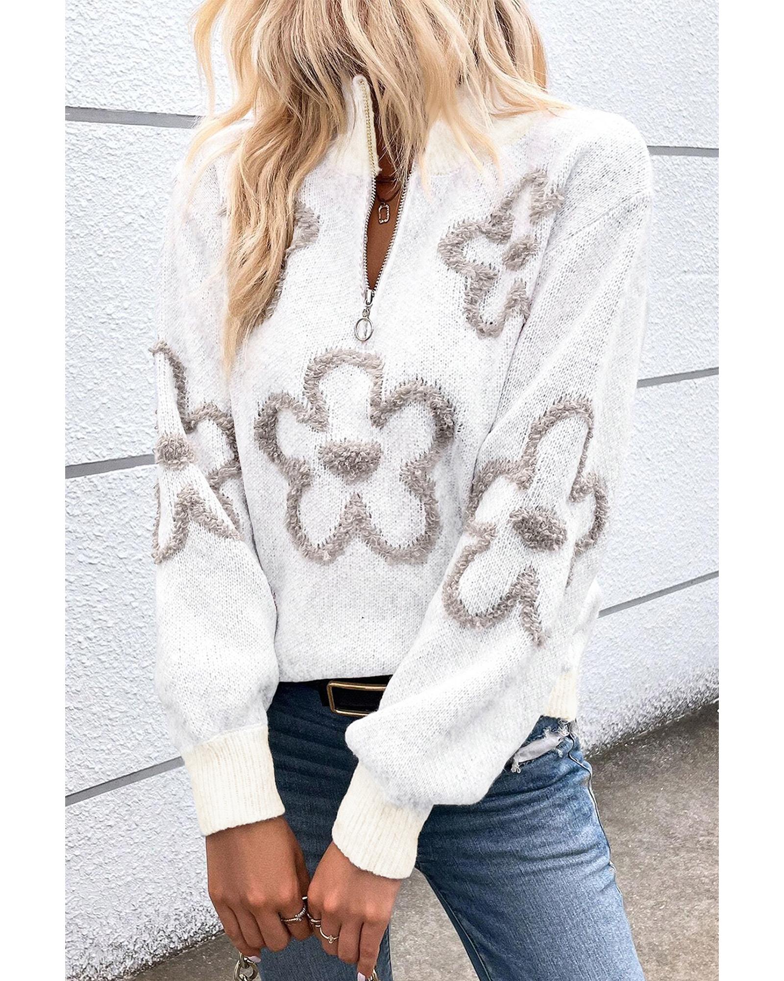 White Contrast Flower Half Zipper Stand Neck Sweater – XL
