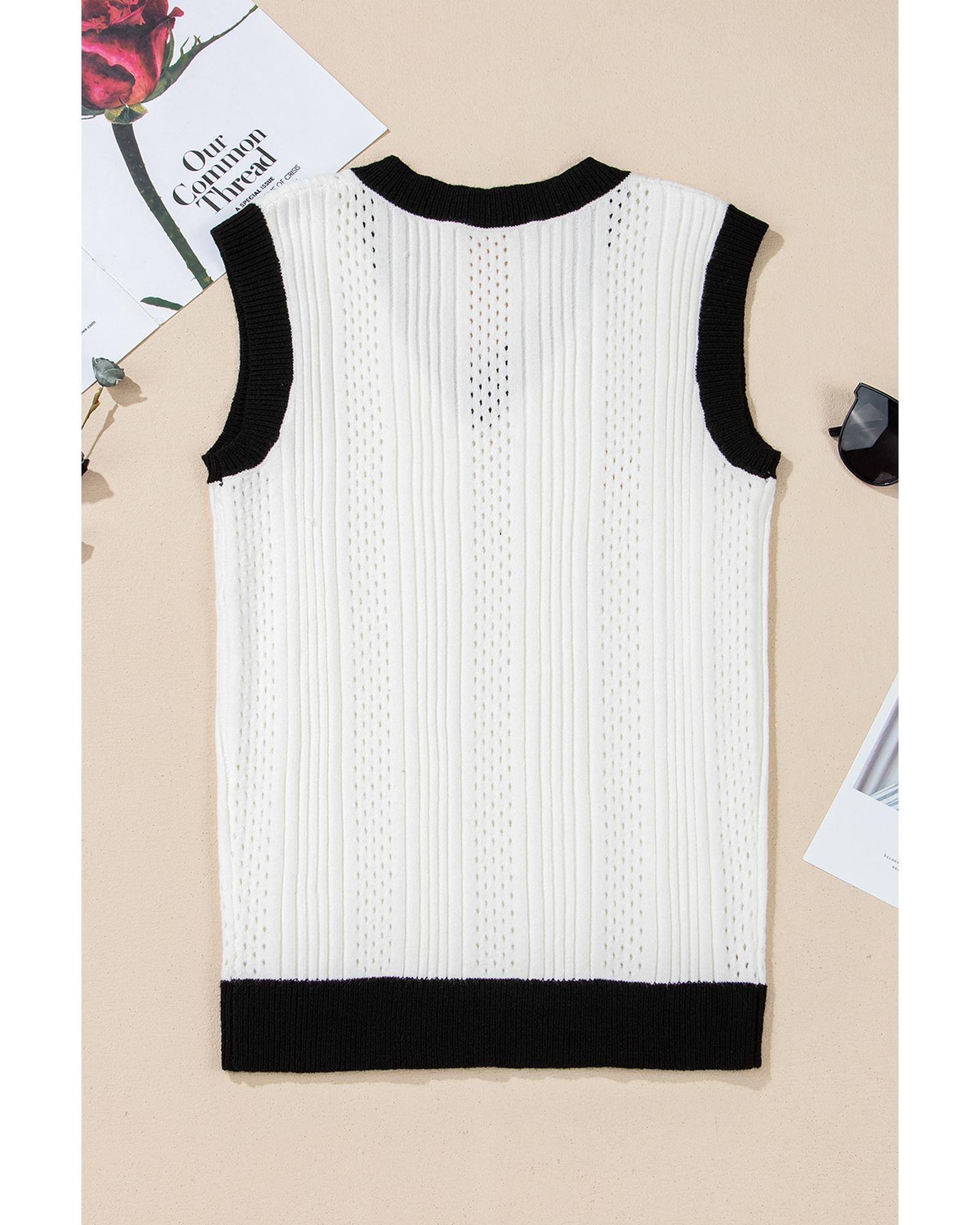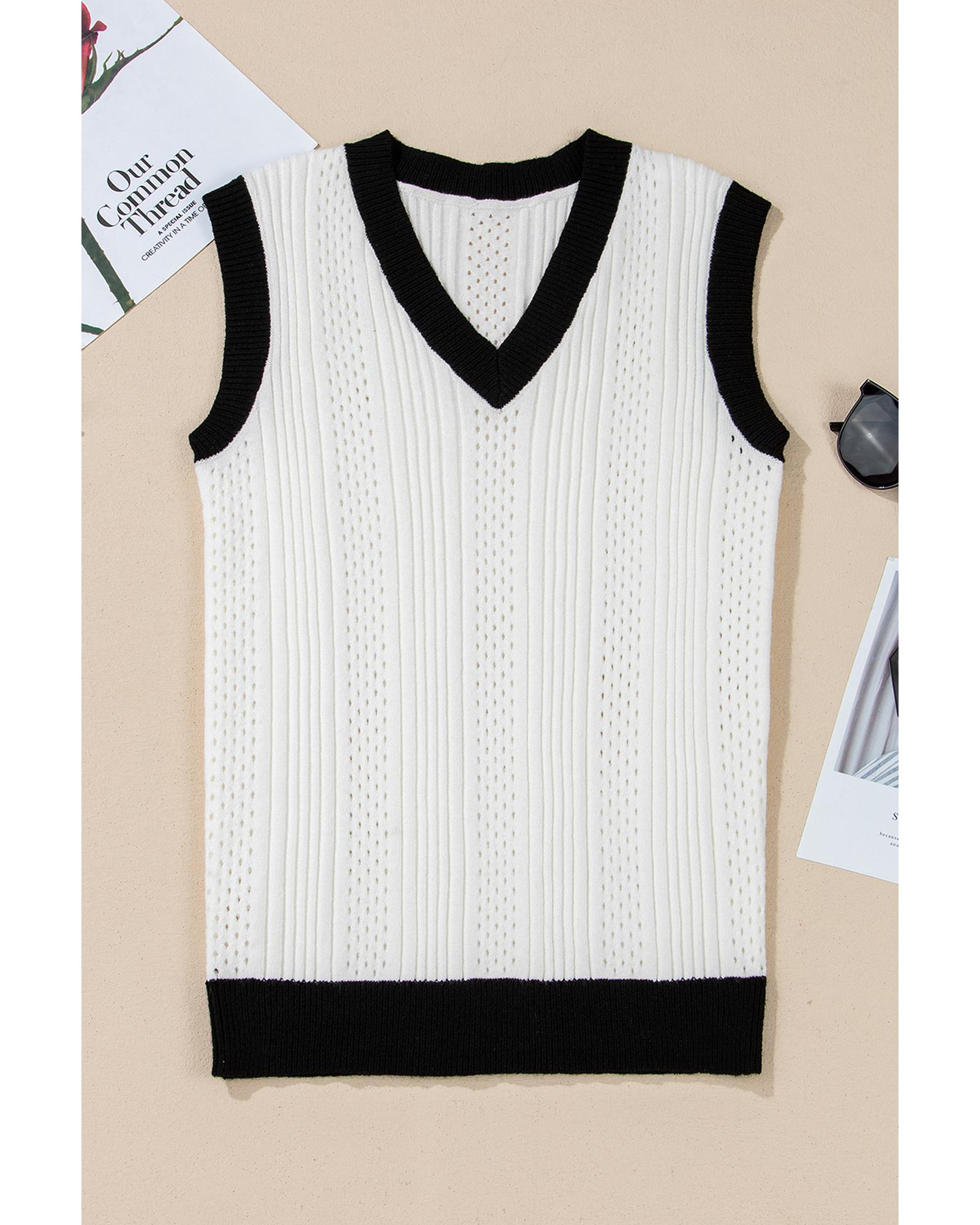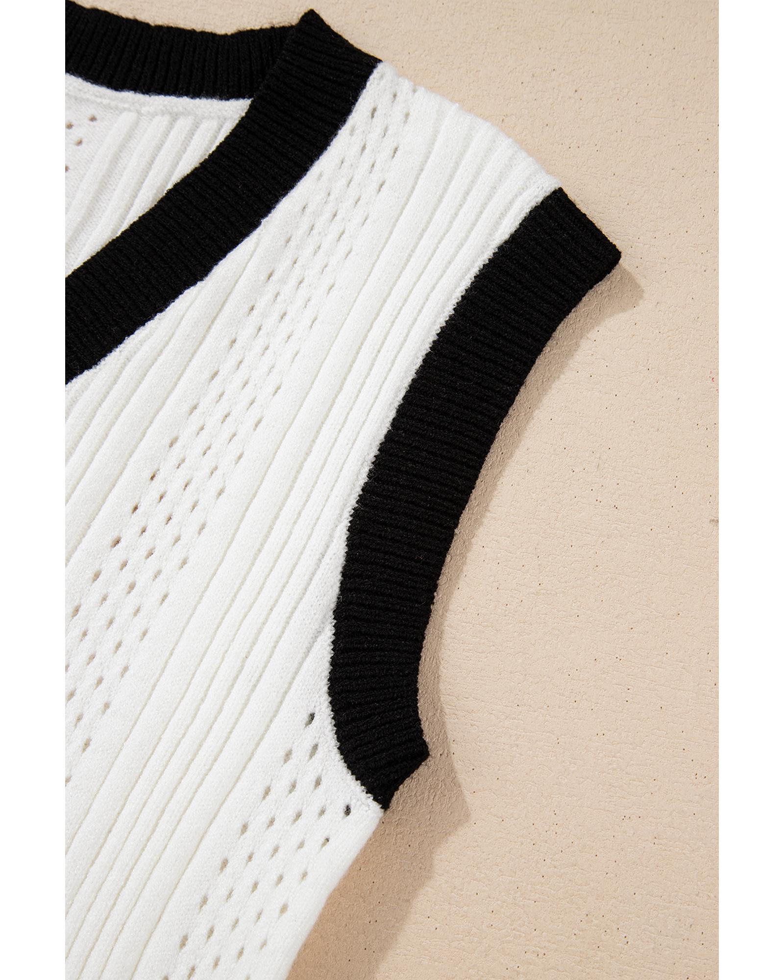 White Contrast Trim Eyelet Knit Colorblock V Neck Sweater Vest – XL
