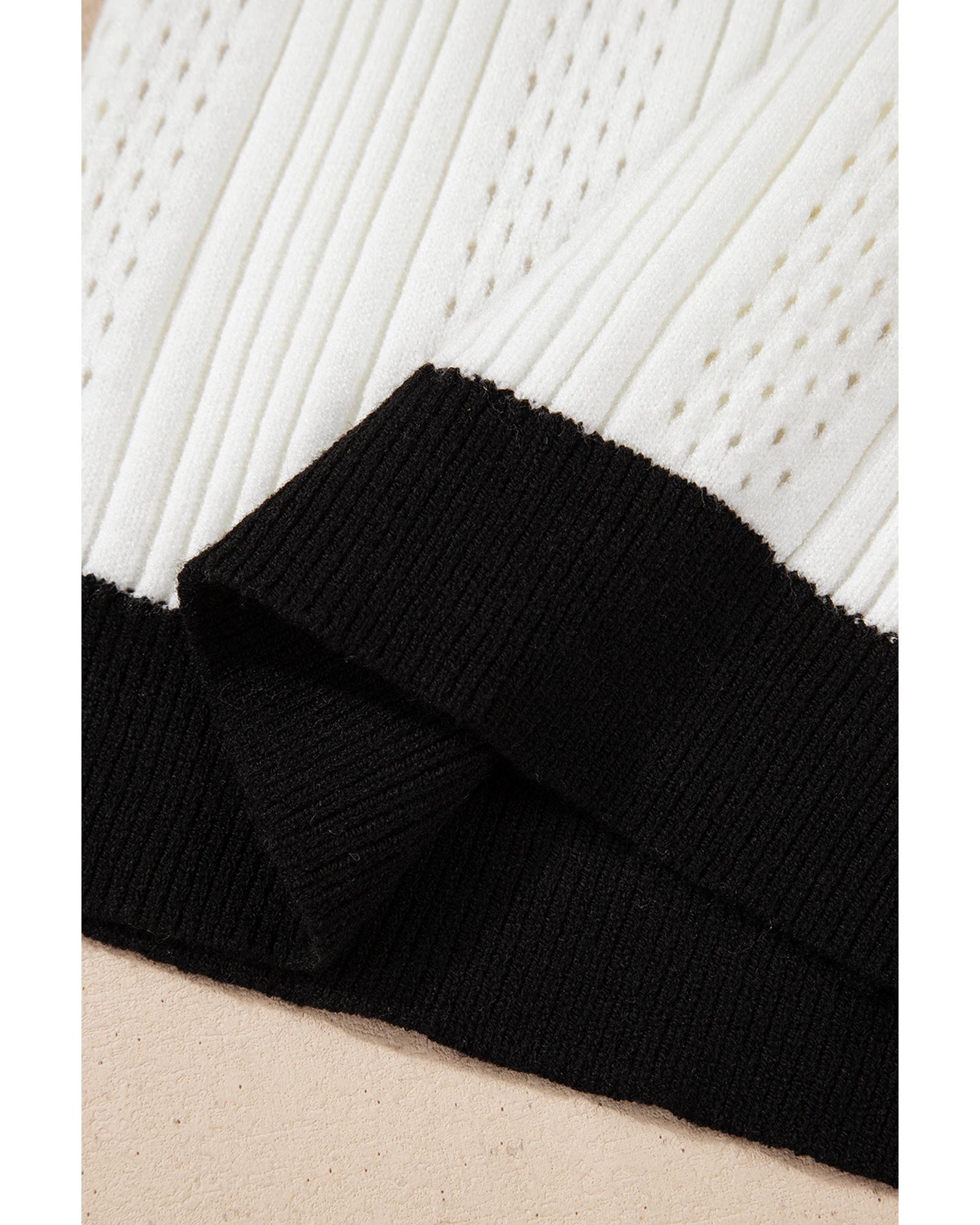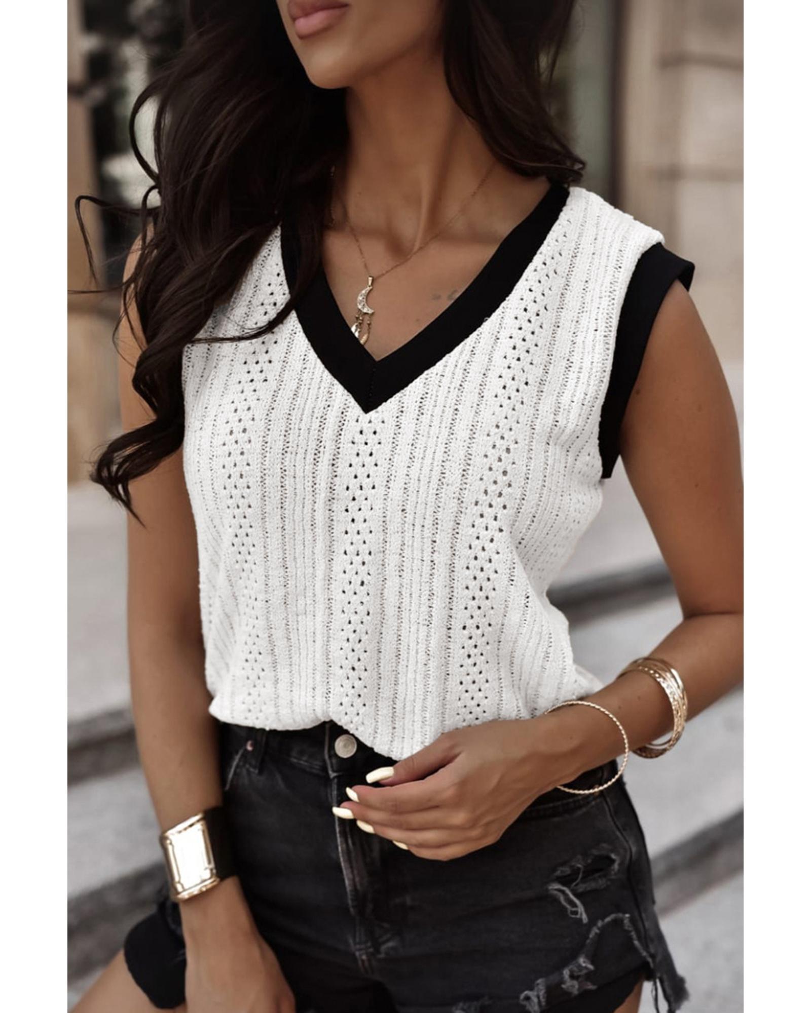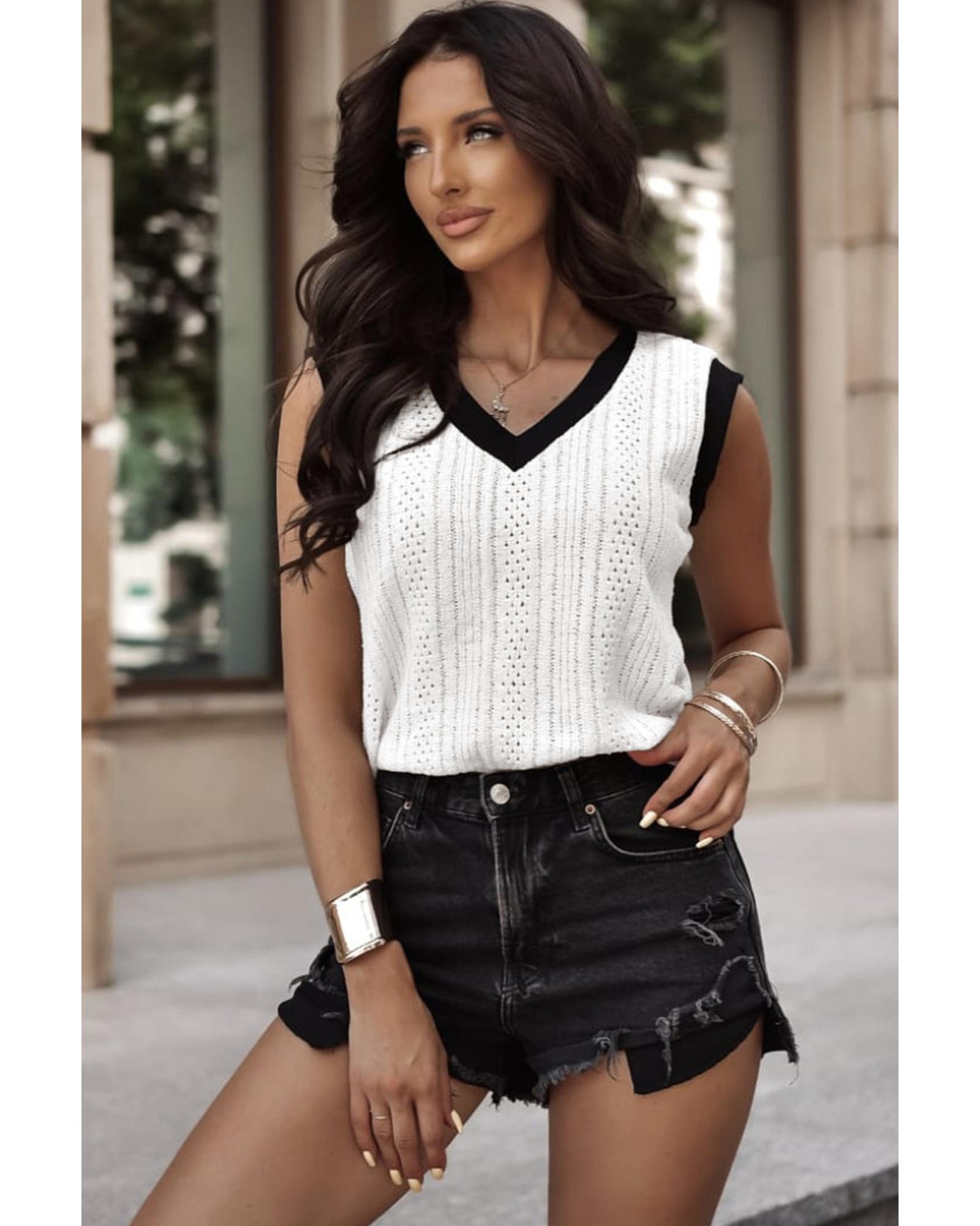 White Contrast Trim Eyelet Knit Colorblock V Neck Sweater Vest – XL