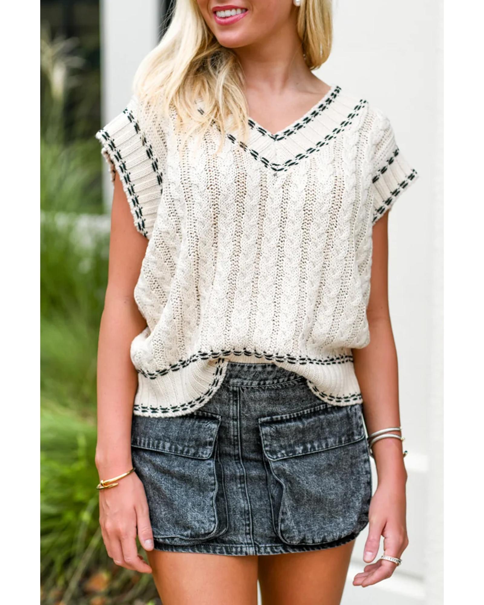 White Contrast Trim V Neck Cable Knit Sweater Vest – M