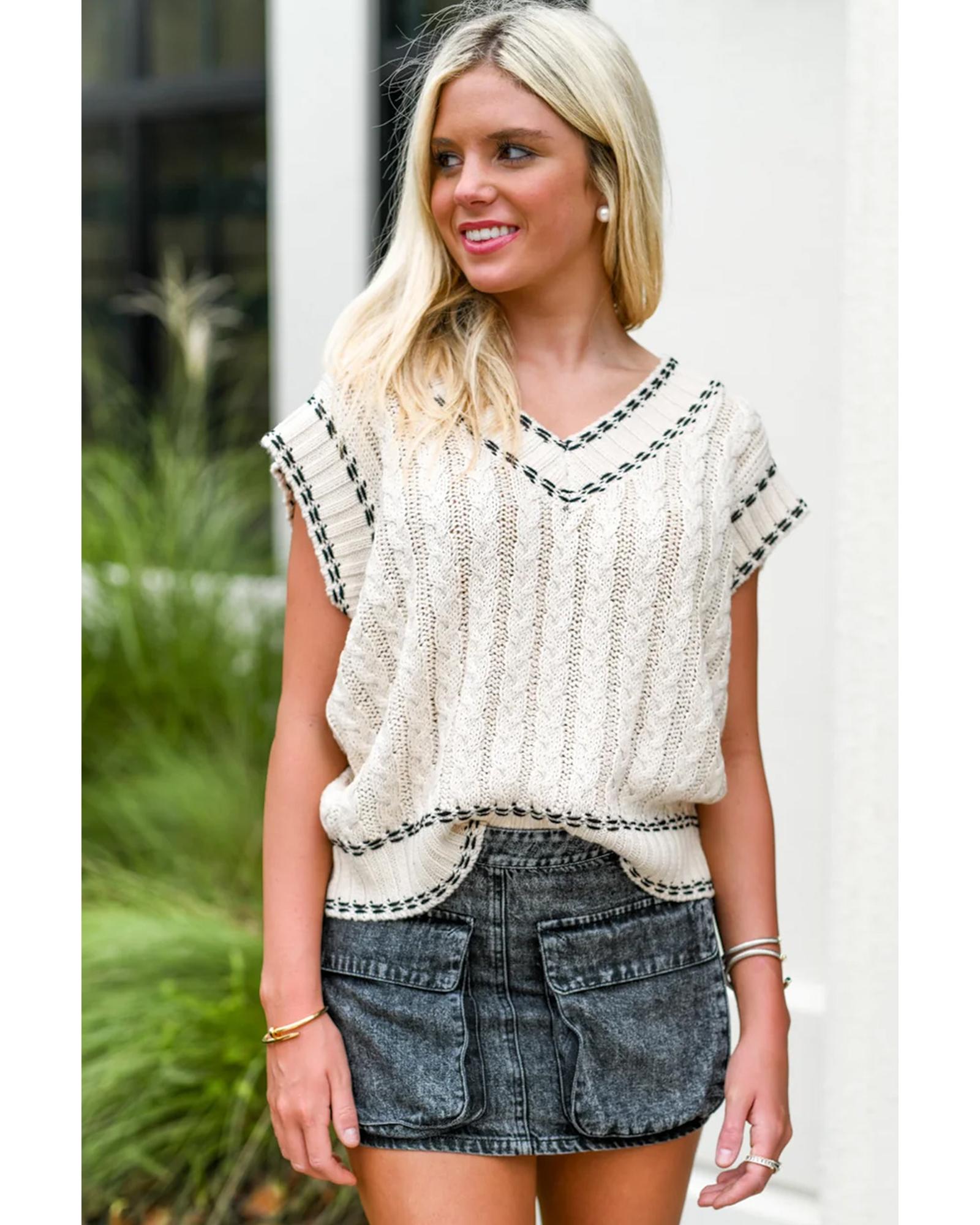 White Contrast Trim V Neck Cable Knit Sweater Vest – XL