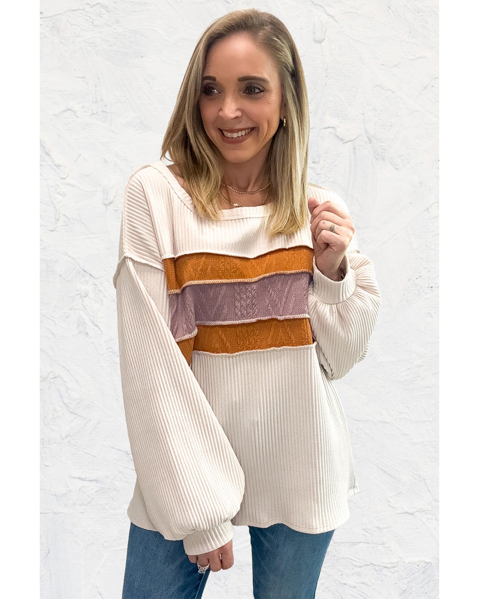 White Corded Exposed Seam Knit Patchwork Drop Sleeve Top – XL