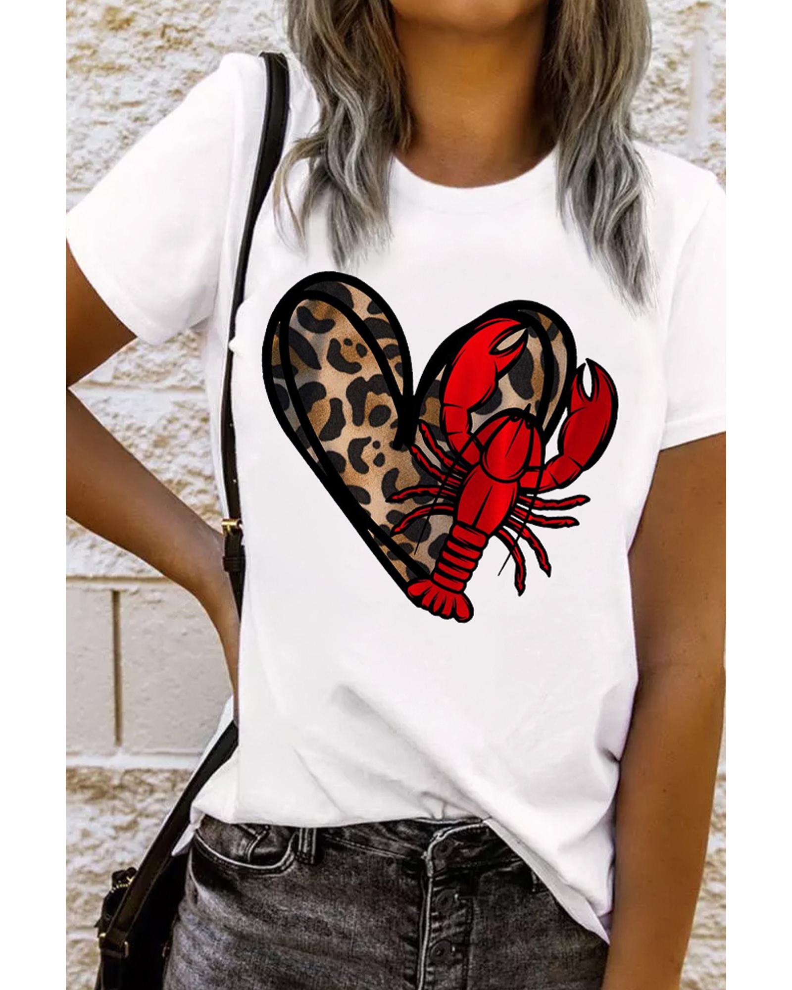 White Crawfish Leopard Heart Print Crewneck Tee – M