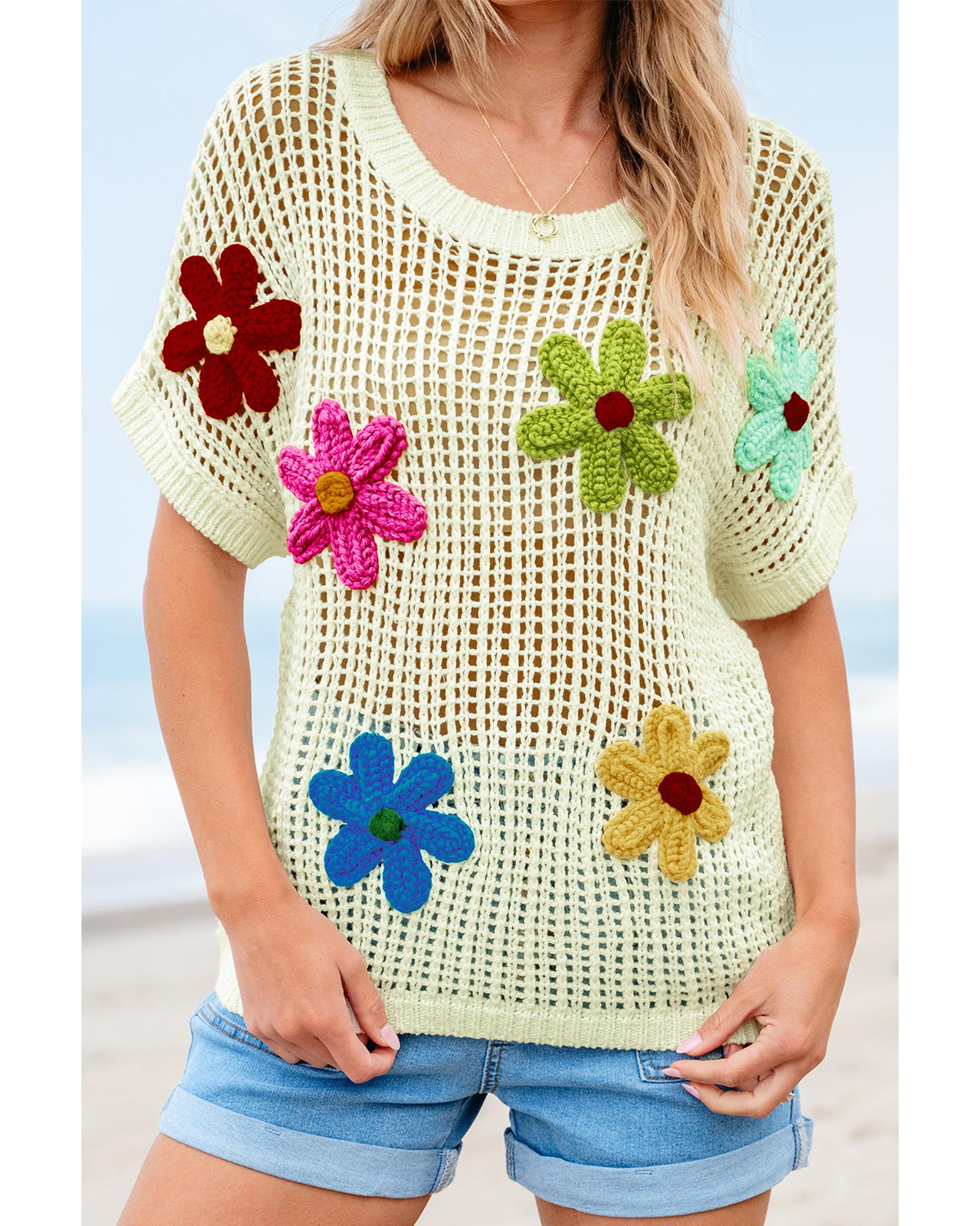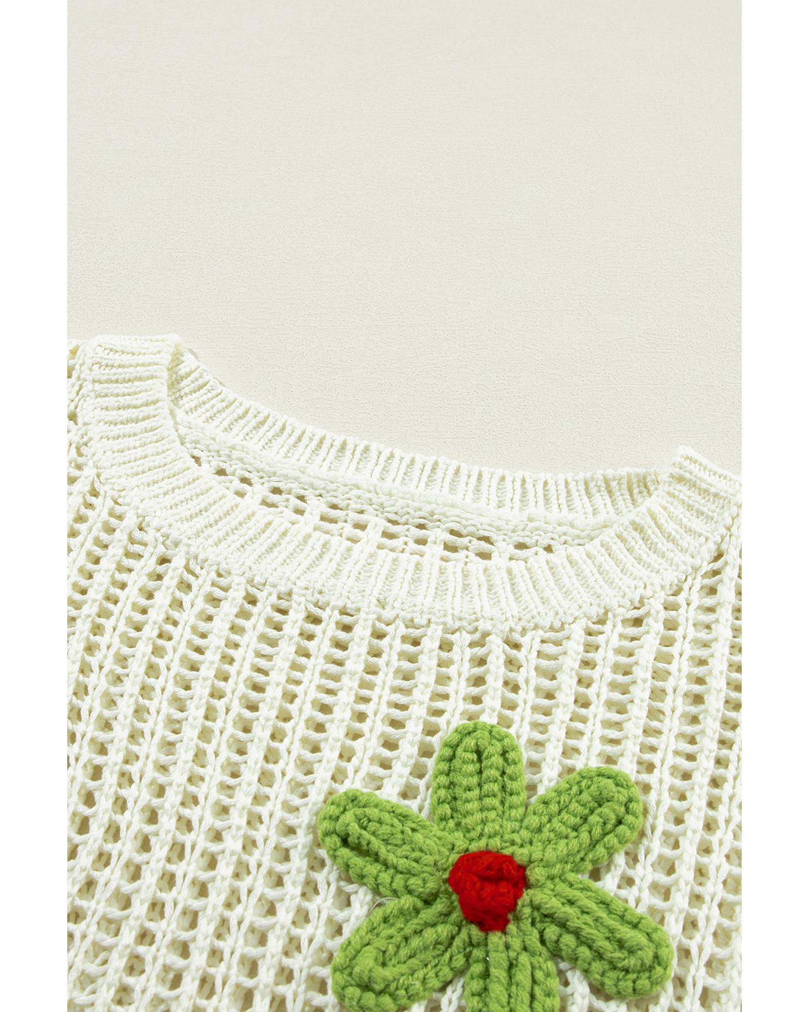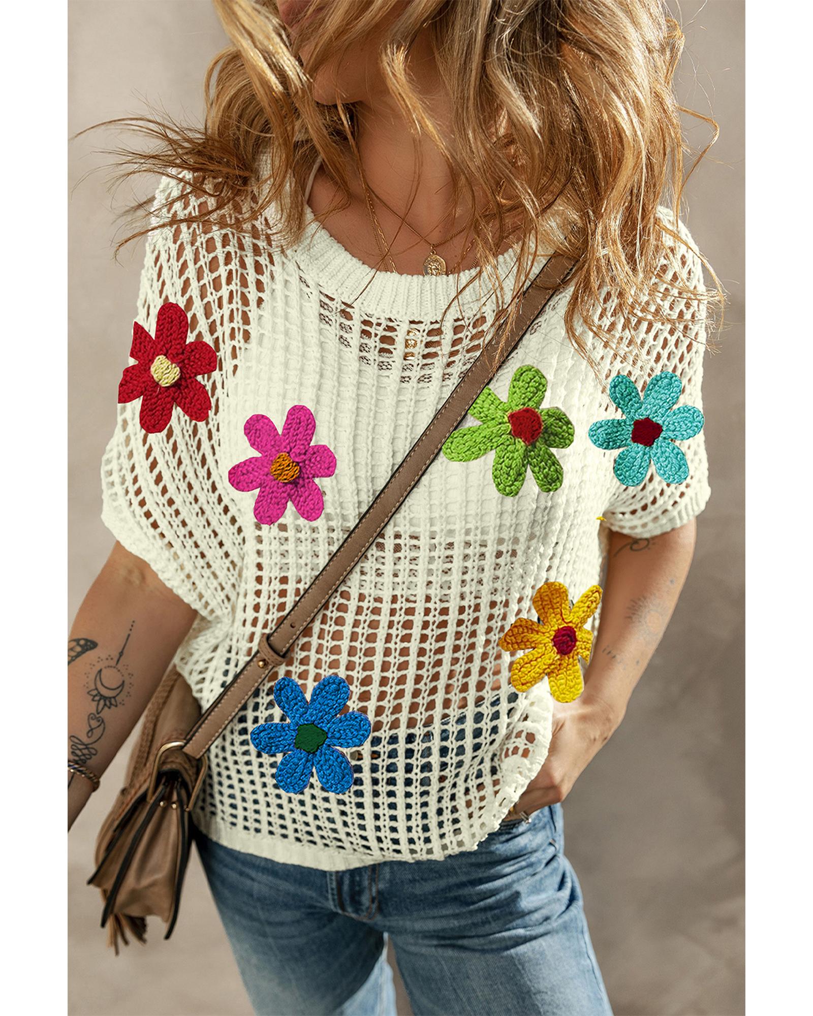 White Crochet Flower Hollow-out Sweater T Shirt – M