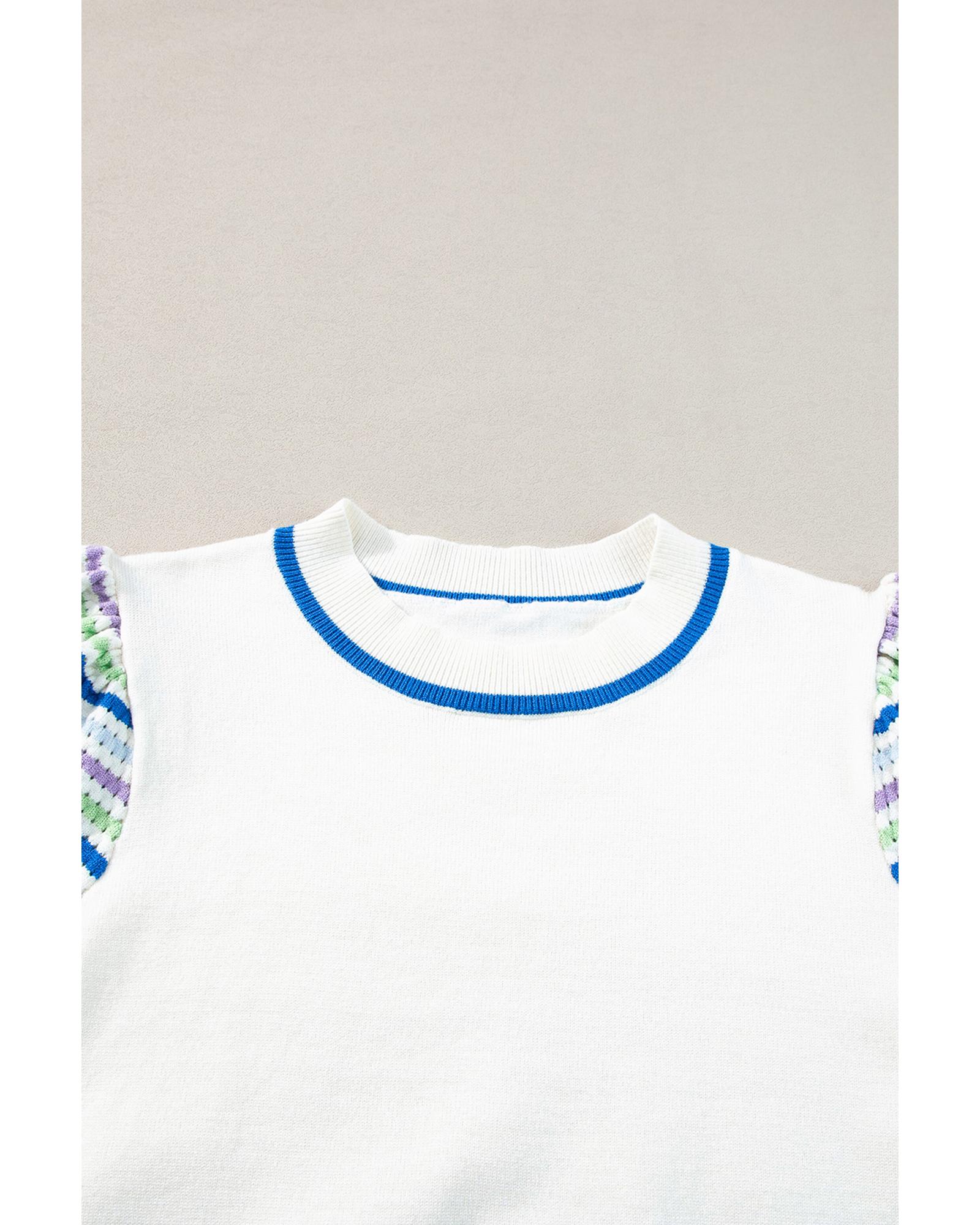 White Crochet Striped Bubble Sleeve Knit Sweater – M