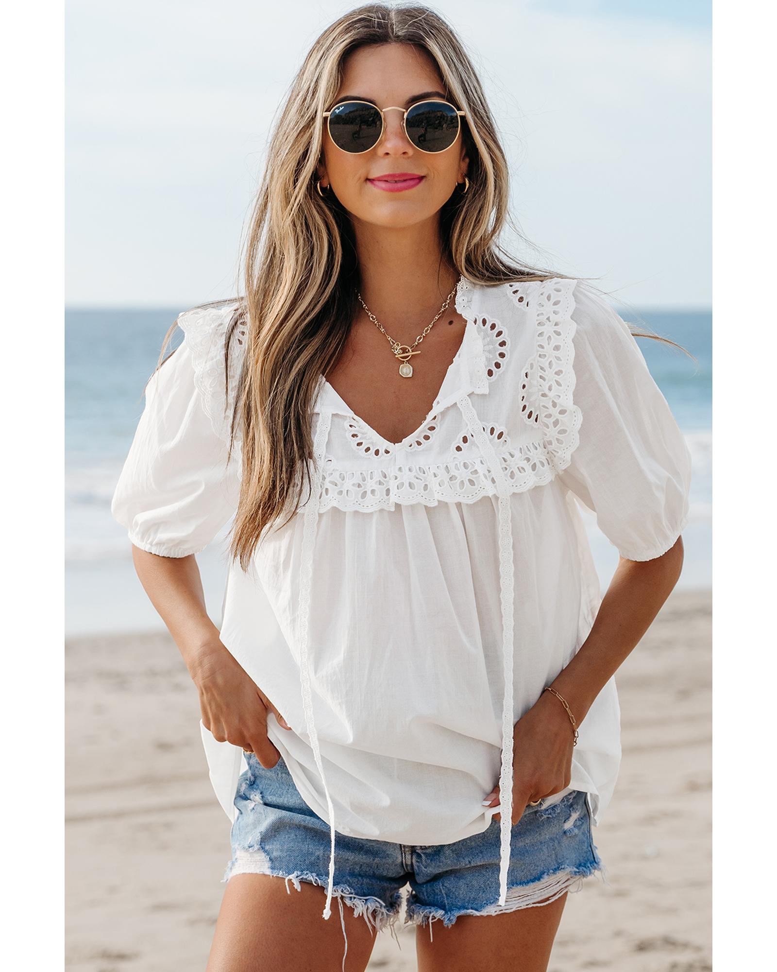 White Embroidered Lace Patchwork Tie Neck Puff Short Sleeve Blouse – XL