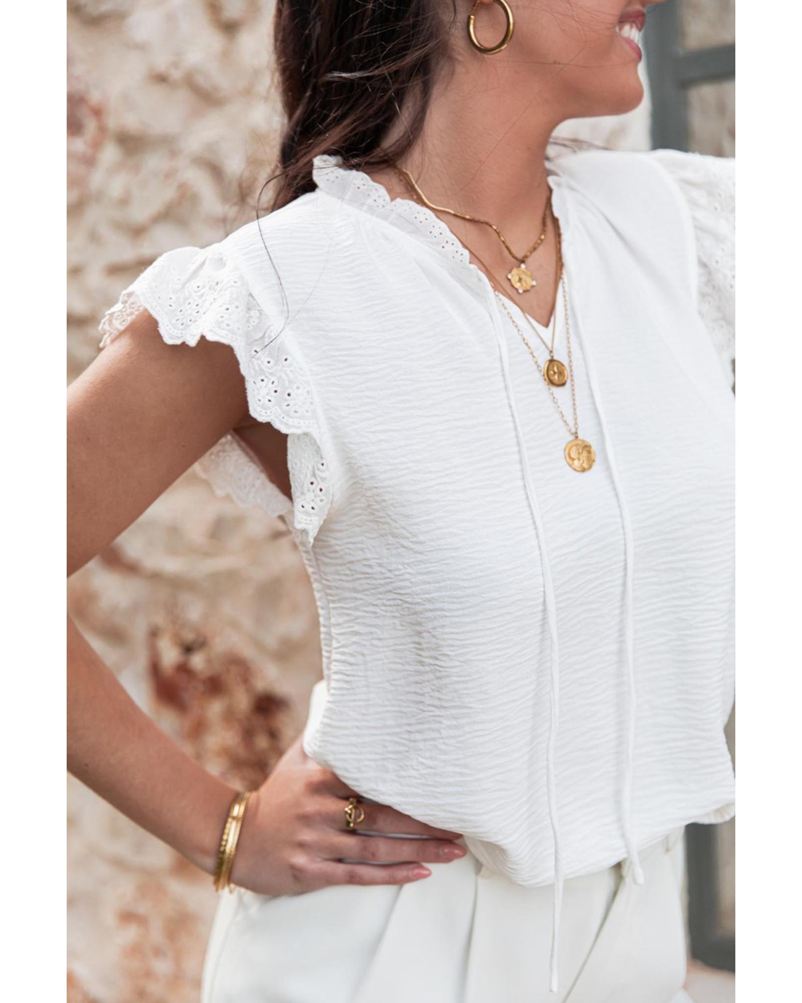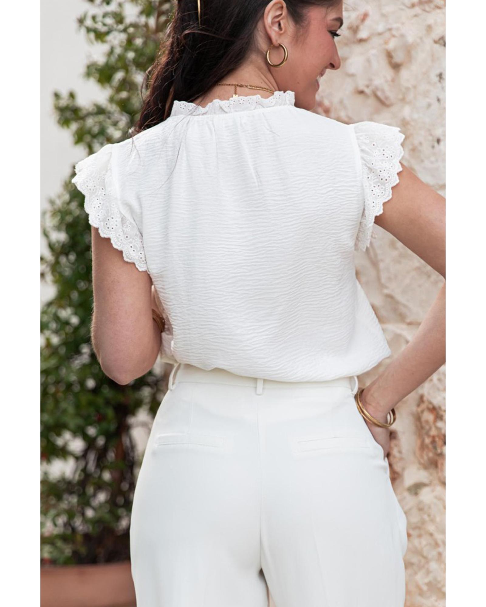 White Embroidered Ruffle Trim Textured Blouse – L