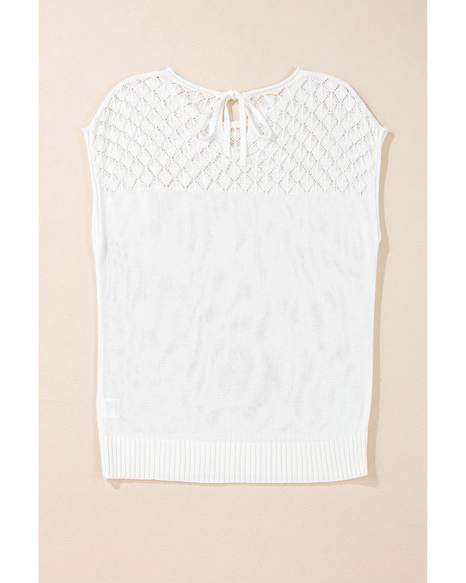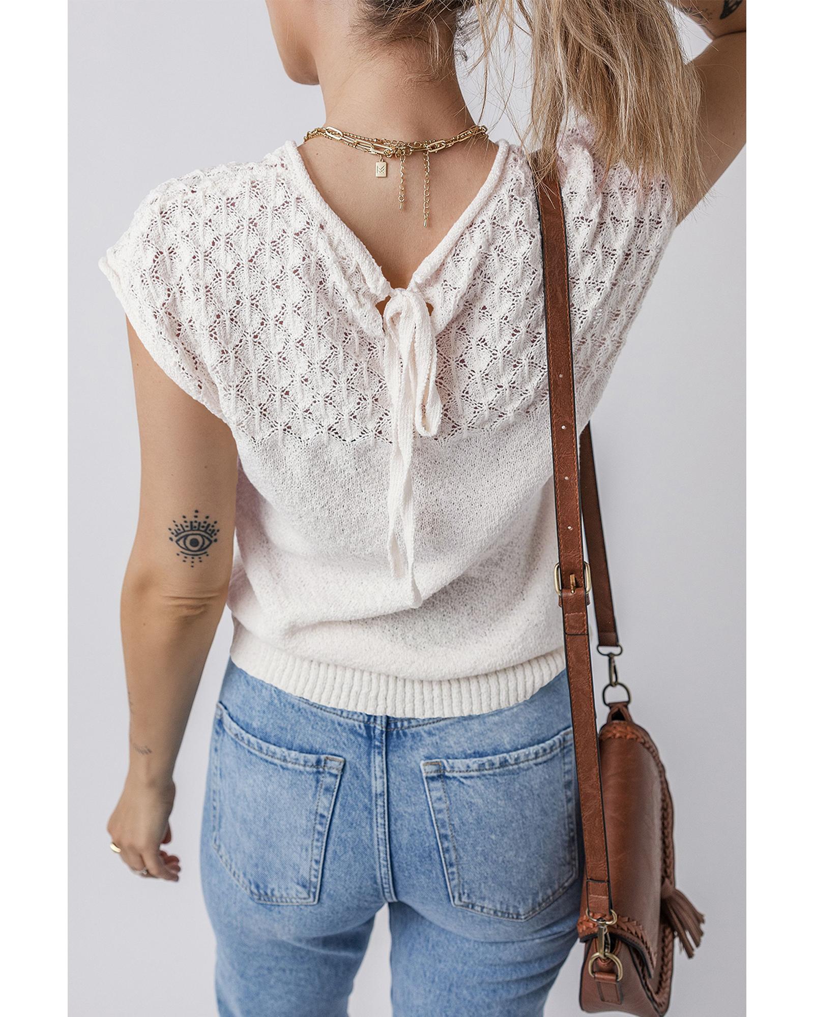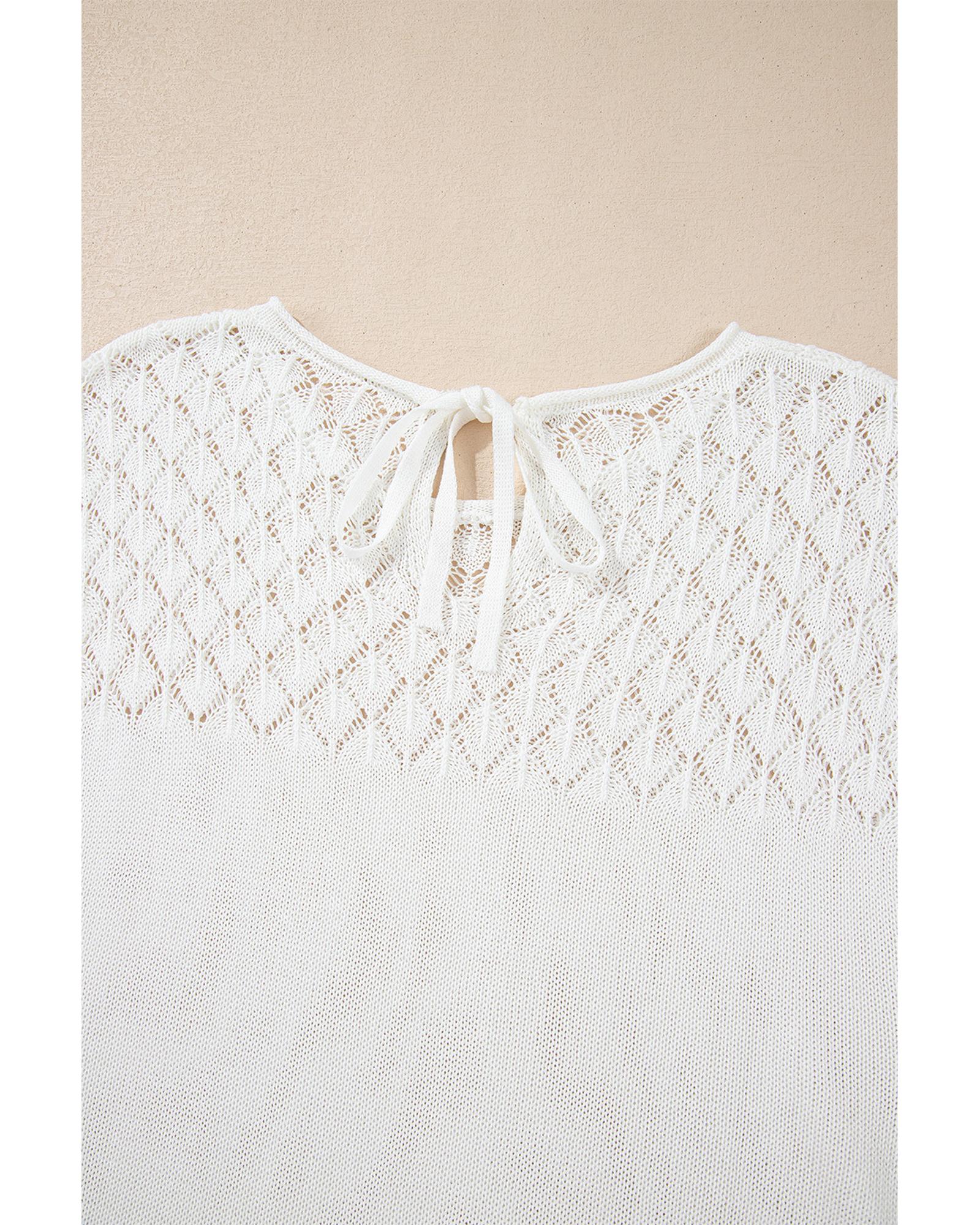 White Eyelet Knit Tied Back Short Sleeve Sweater – M
