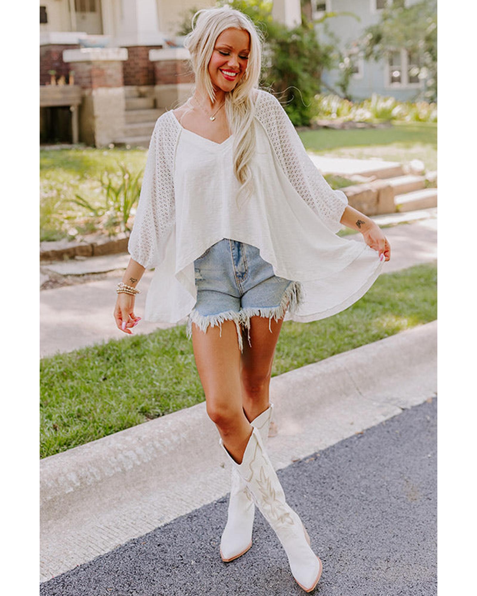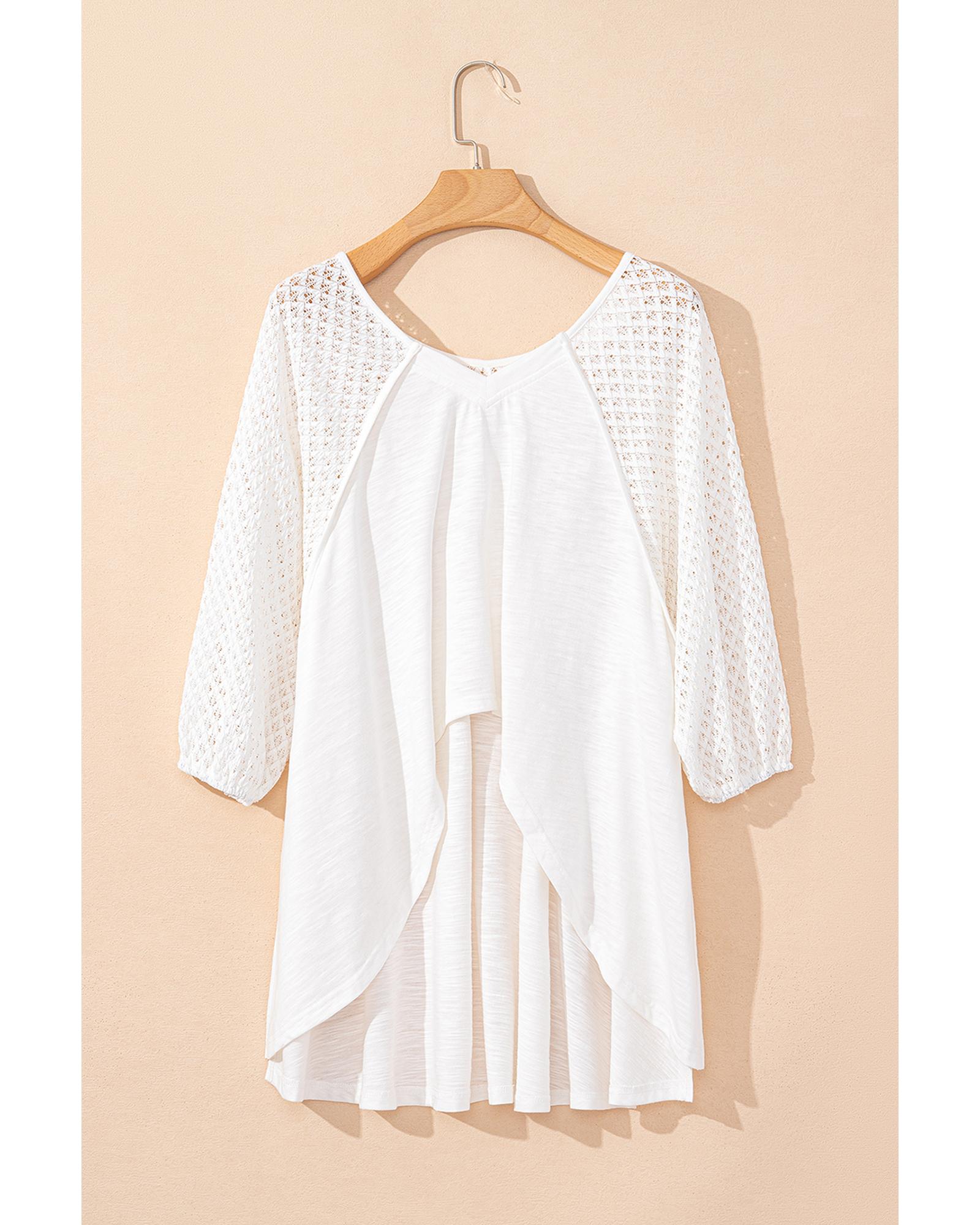 White Eyelet Patchwork High Low Hem V Neck Oversized Top – L