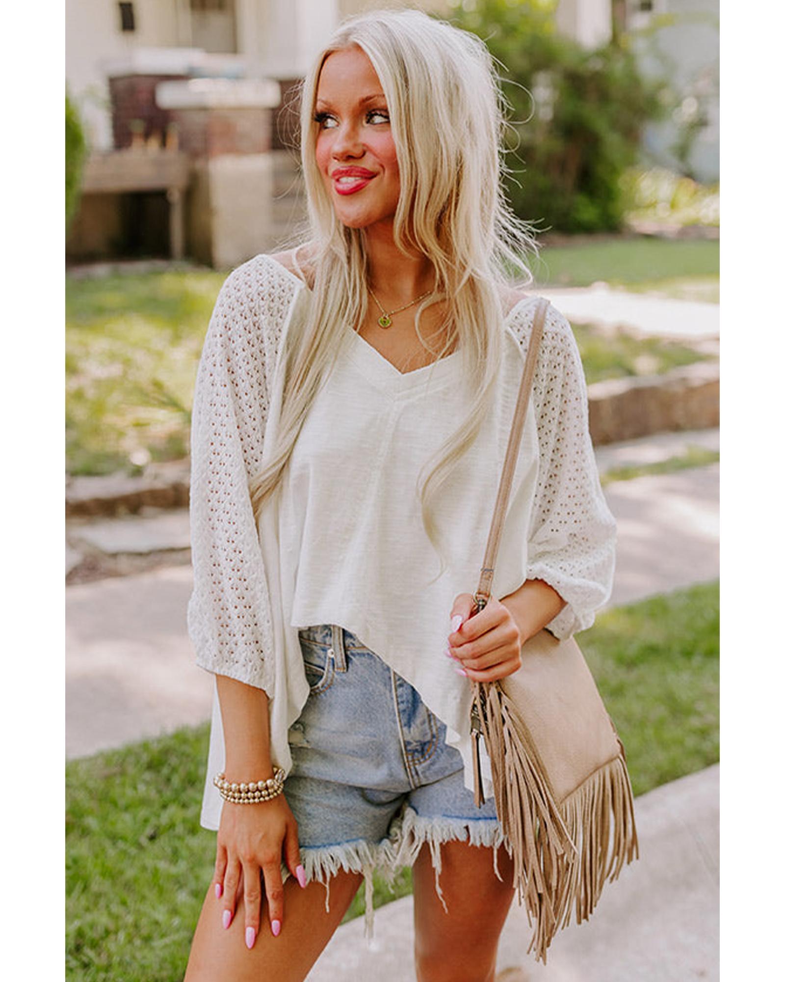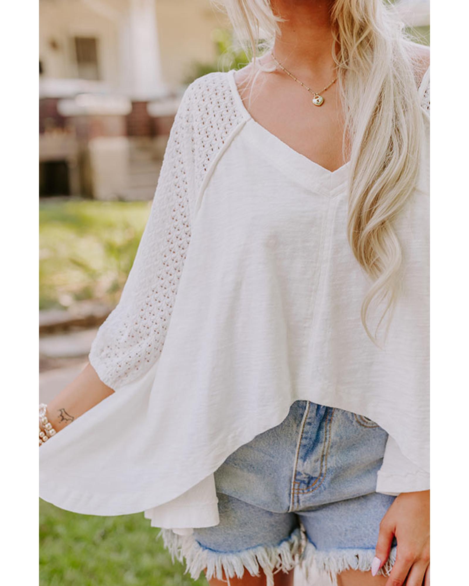 White Eyelet Patchwork High Low Hem V Neck Oversized Top – M
