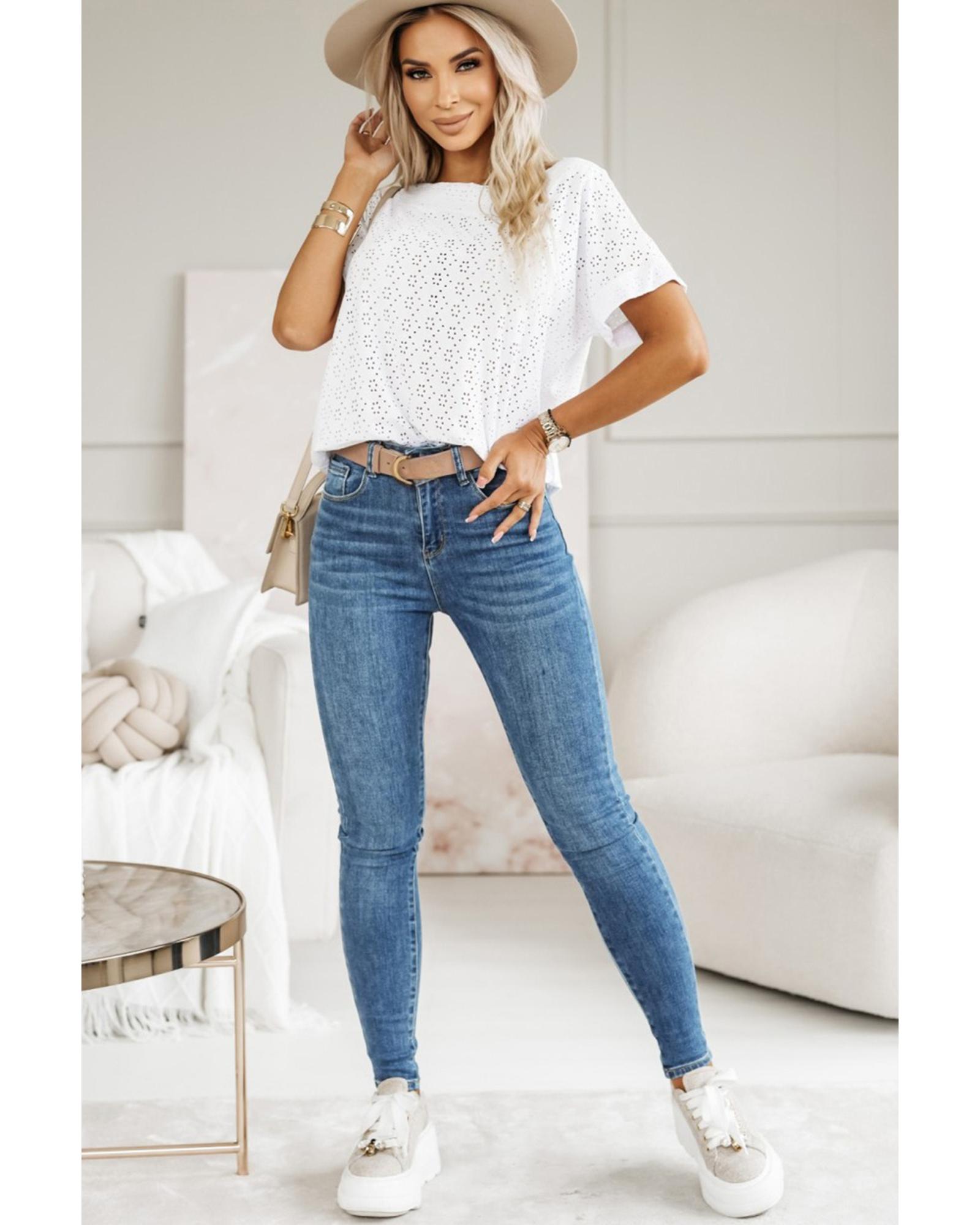 White Eyelet Pattern Boat Neck Casual Tee – M