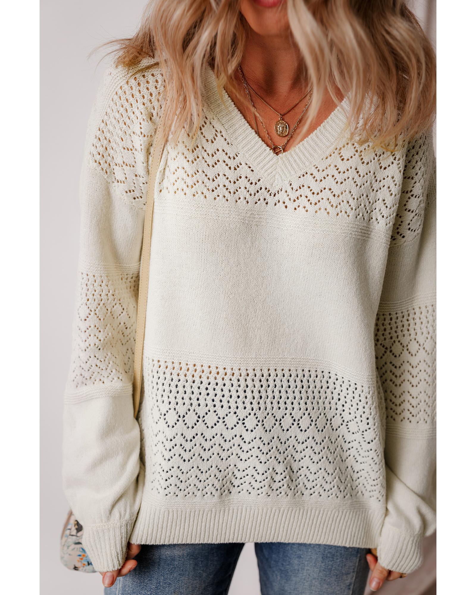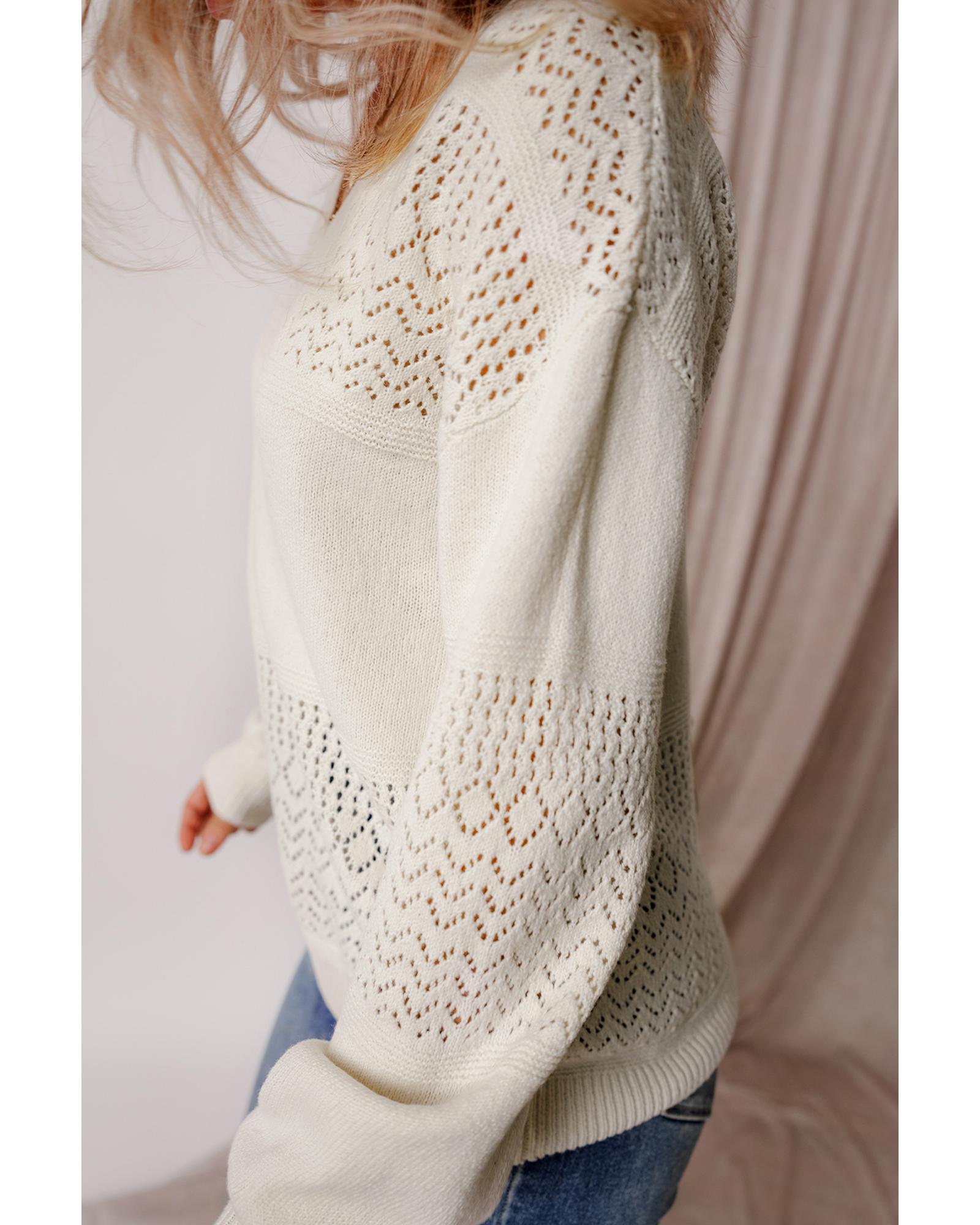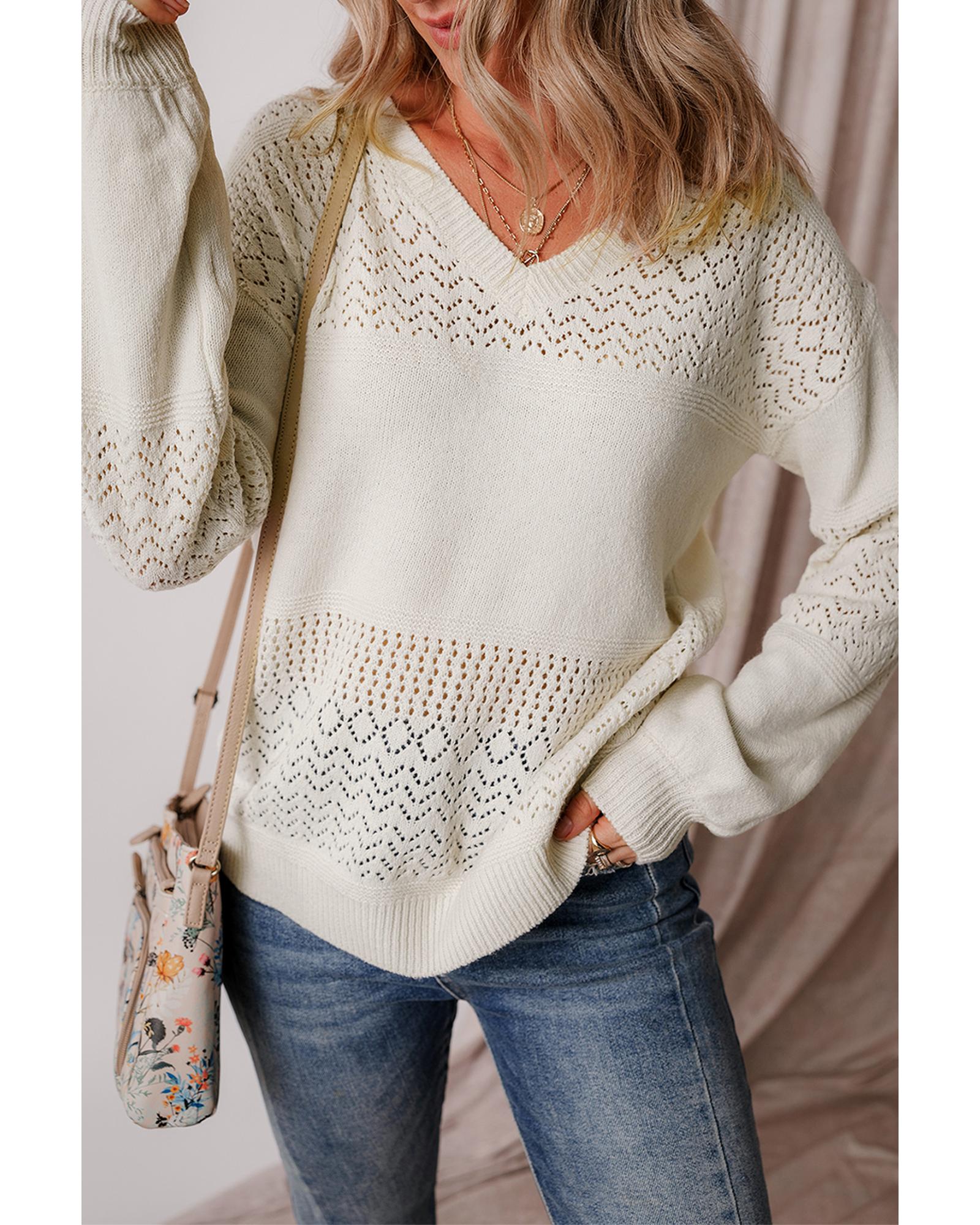 White Eyelet Pattern Detail V Neck Drop Shoulder Sweater – L