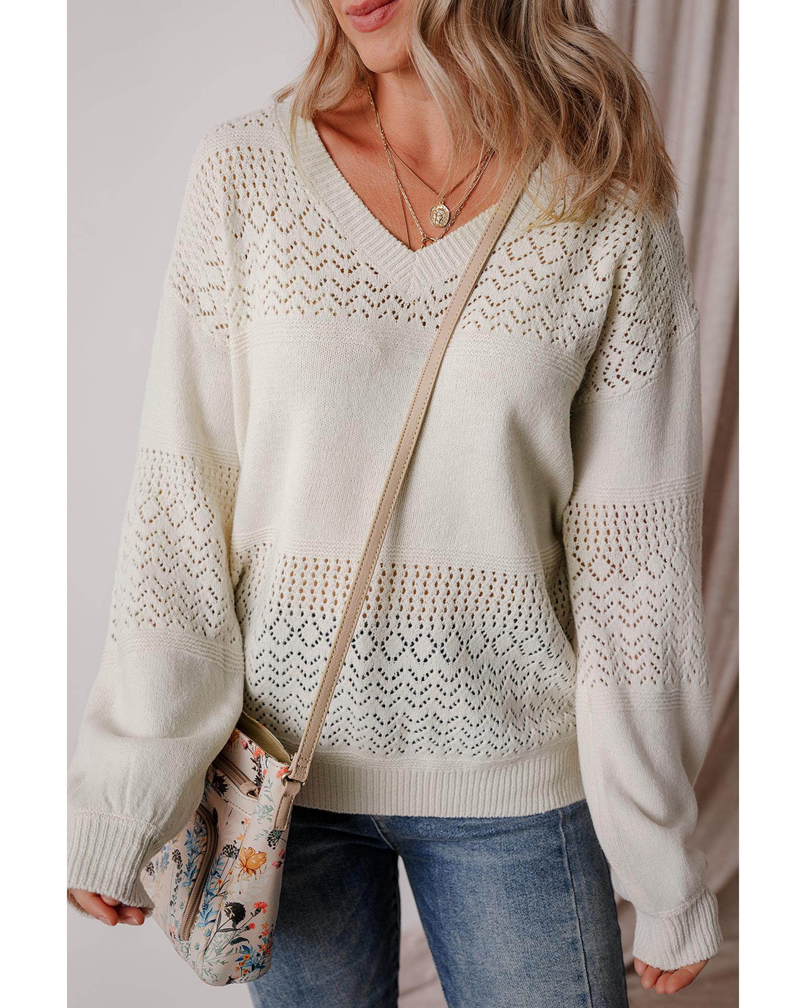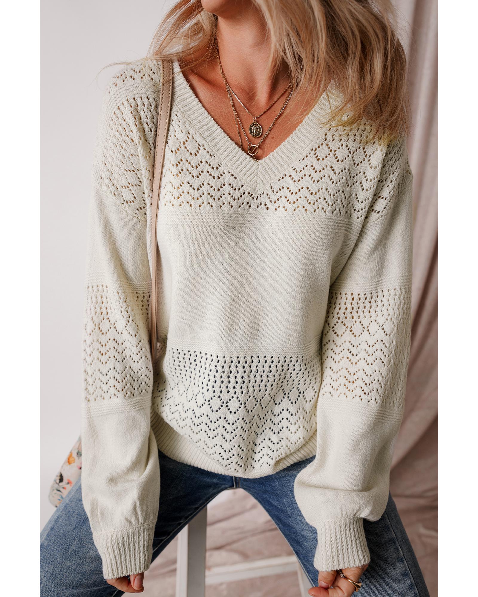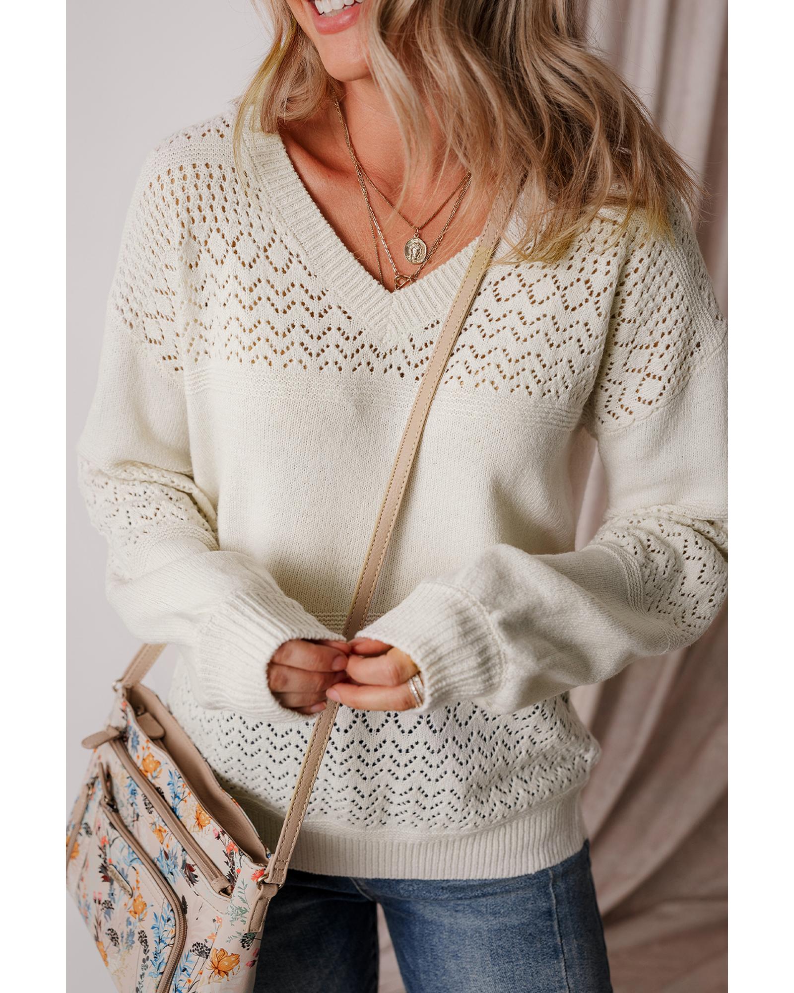 White Eyelet Pattern Detail V Neck Drop Shoulder Sweater – L