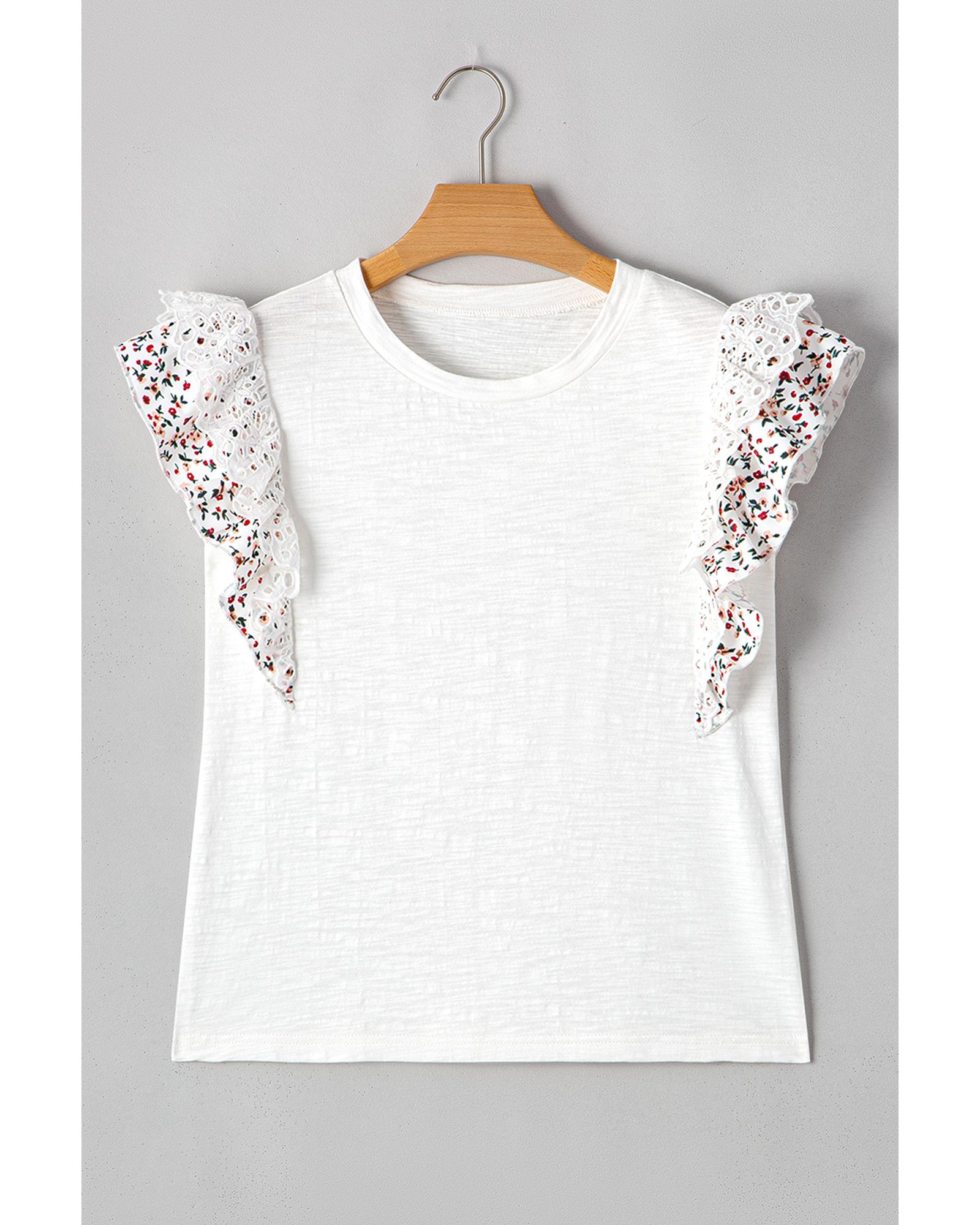 White Floral Lace Eyelet Patched Butterfly Sleeve Blouse – L