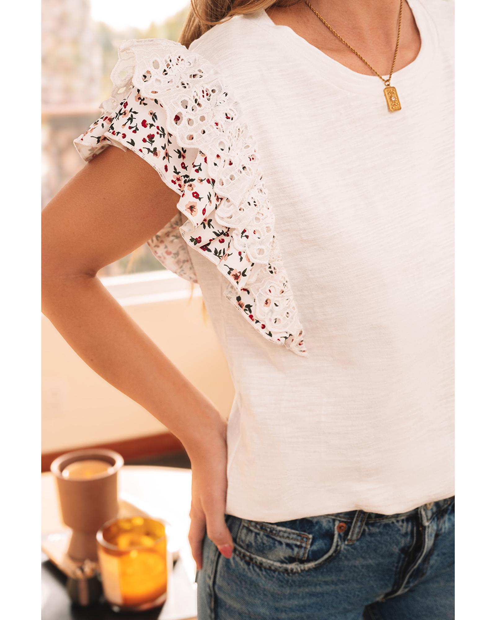 White Floral Lace Eyelet Patched Butterfly Sleeve Blouse – M