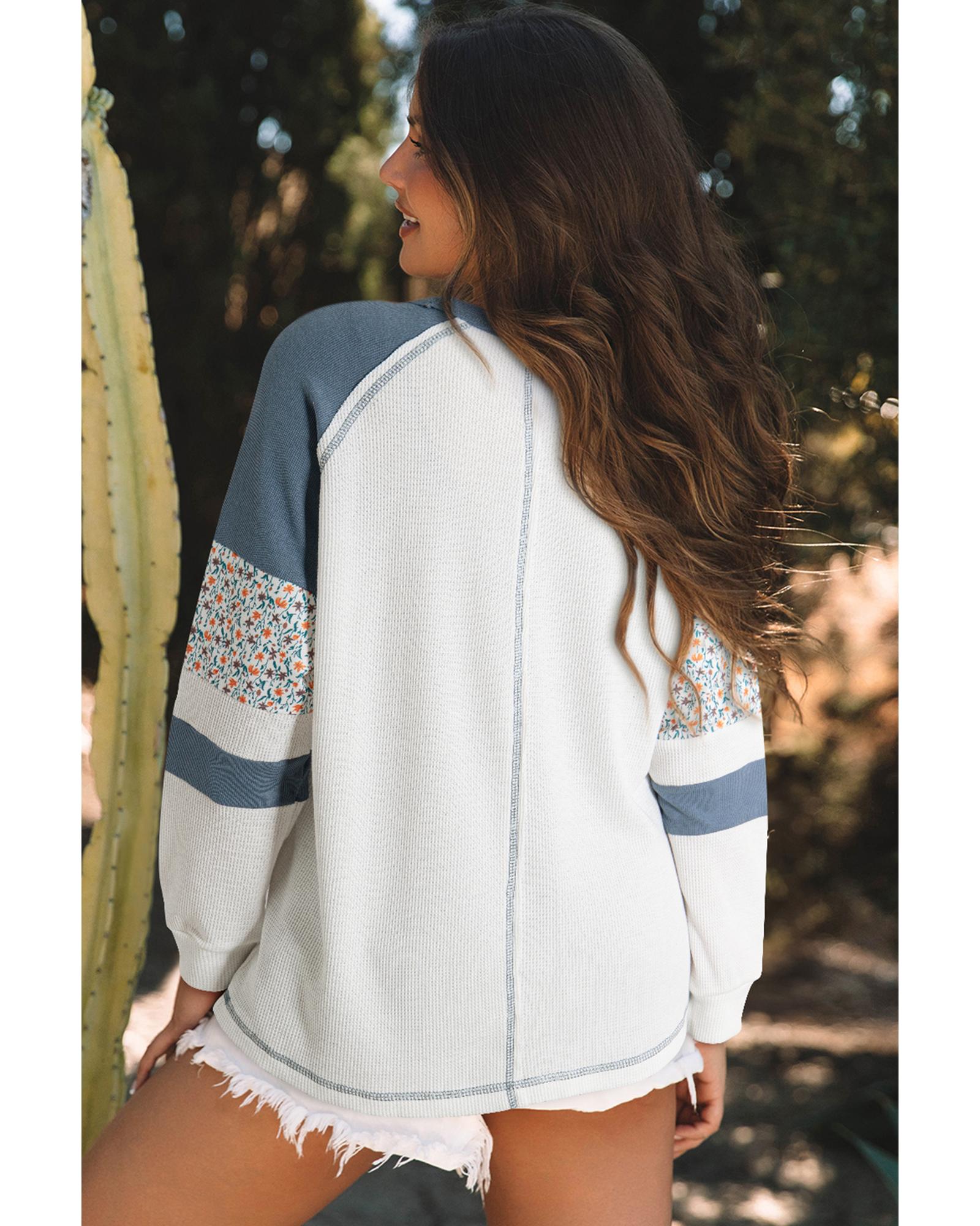 • White Floral Patchwork Waffle Knit Raglan Top