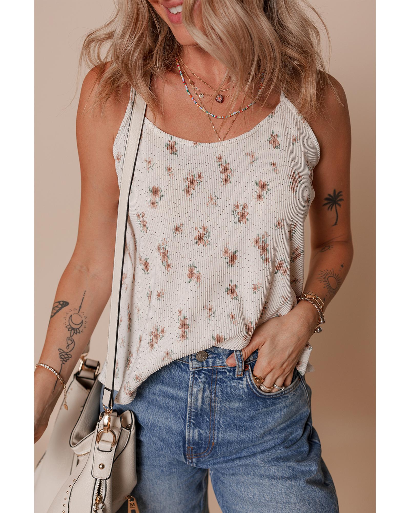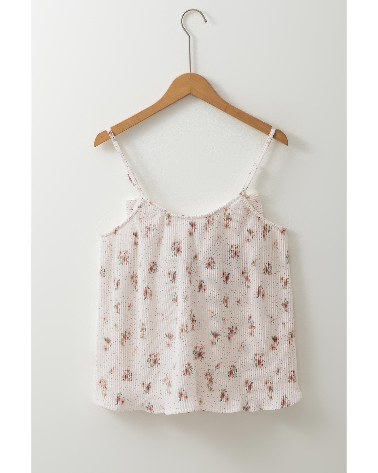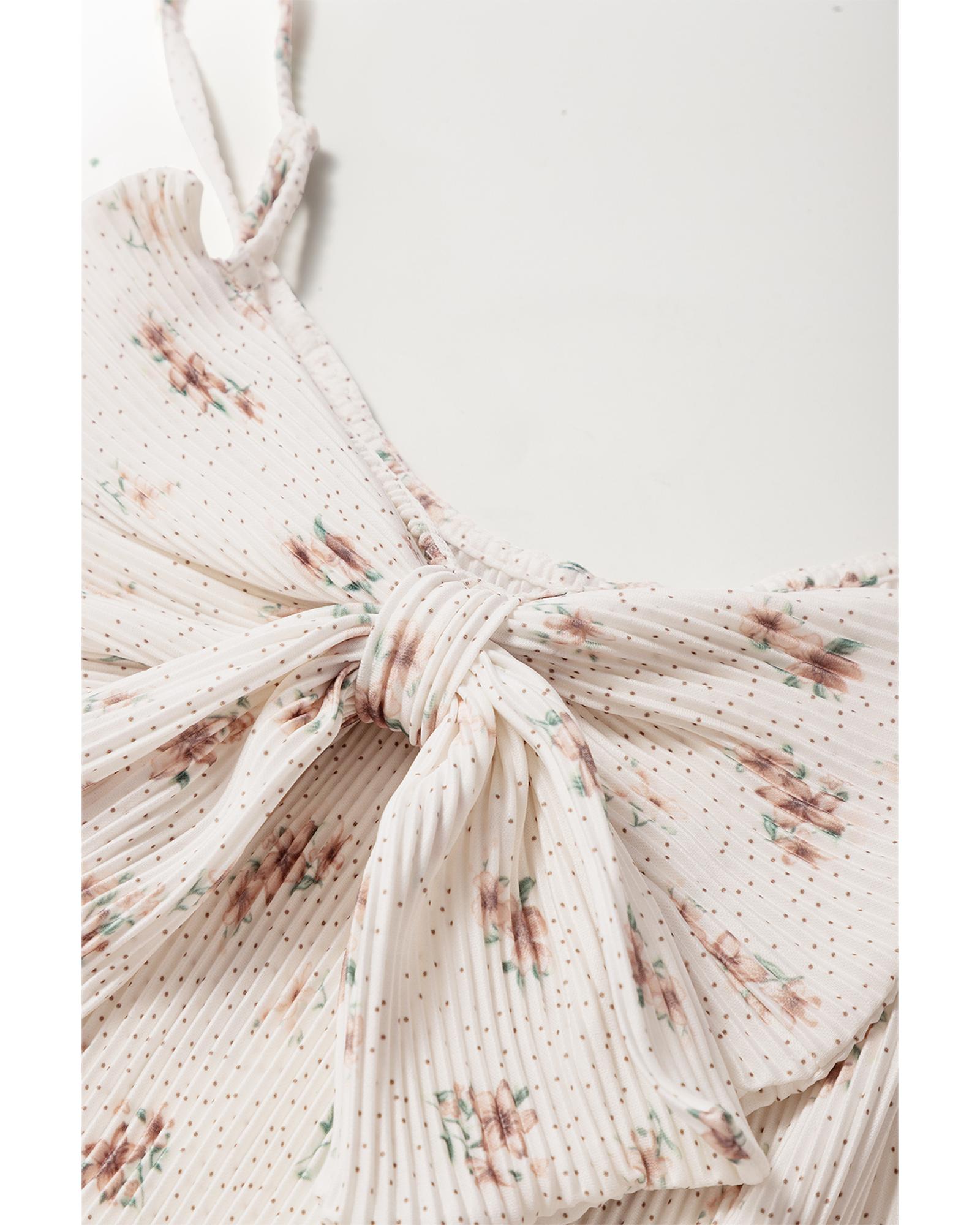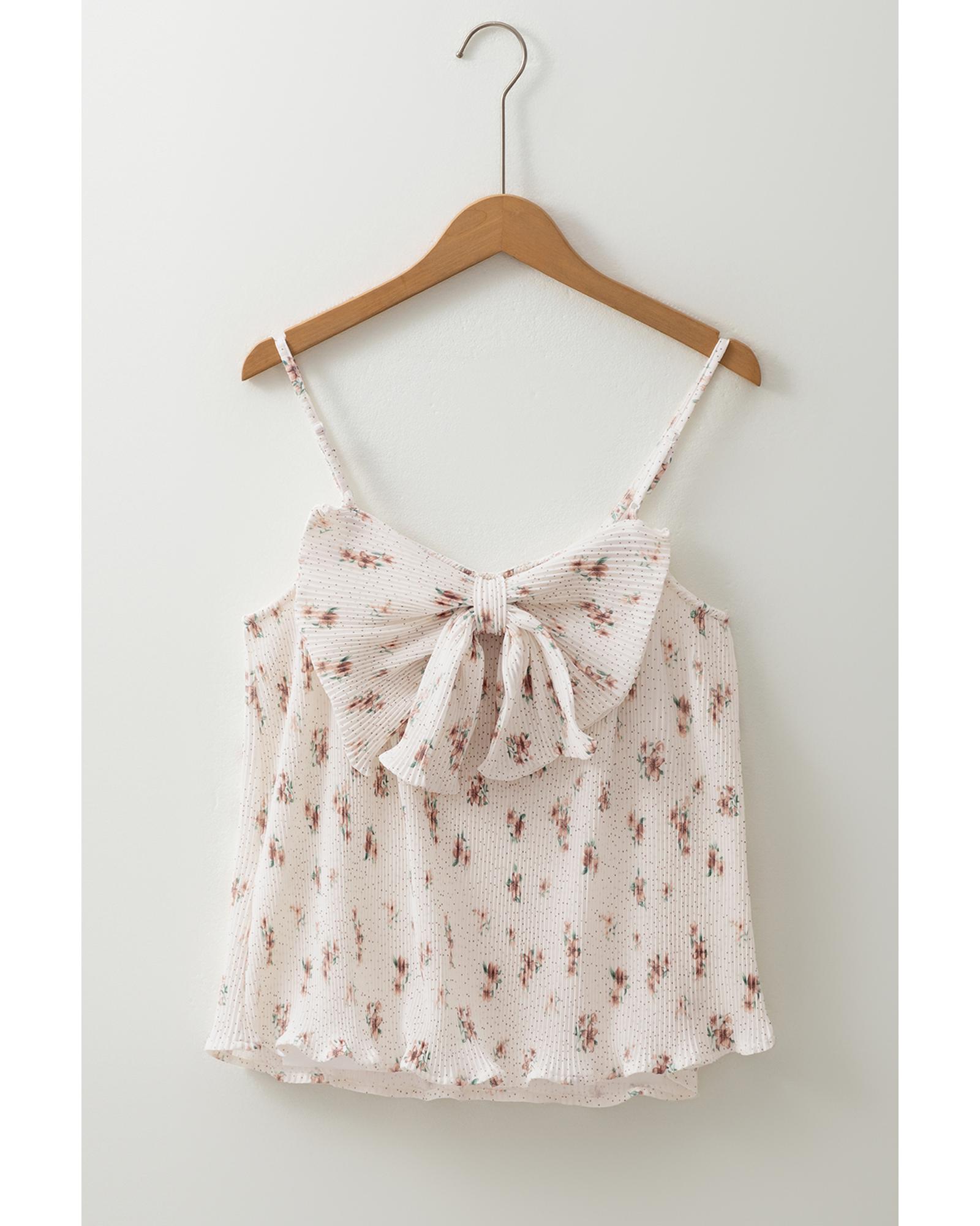 White Floral Pleated Big Bow Back Spaghetti Straps Tank Top – L