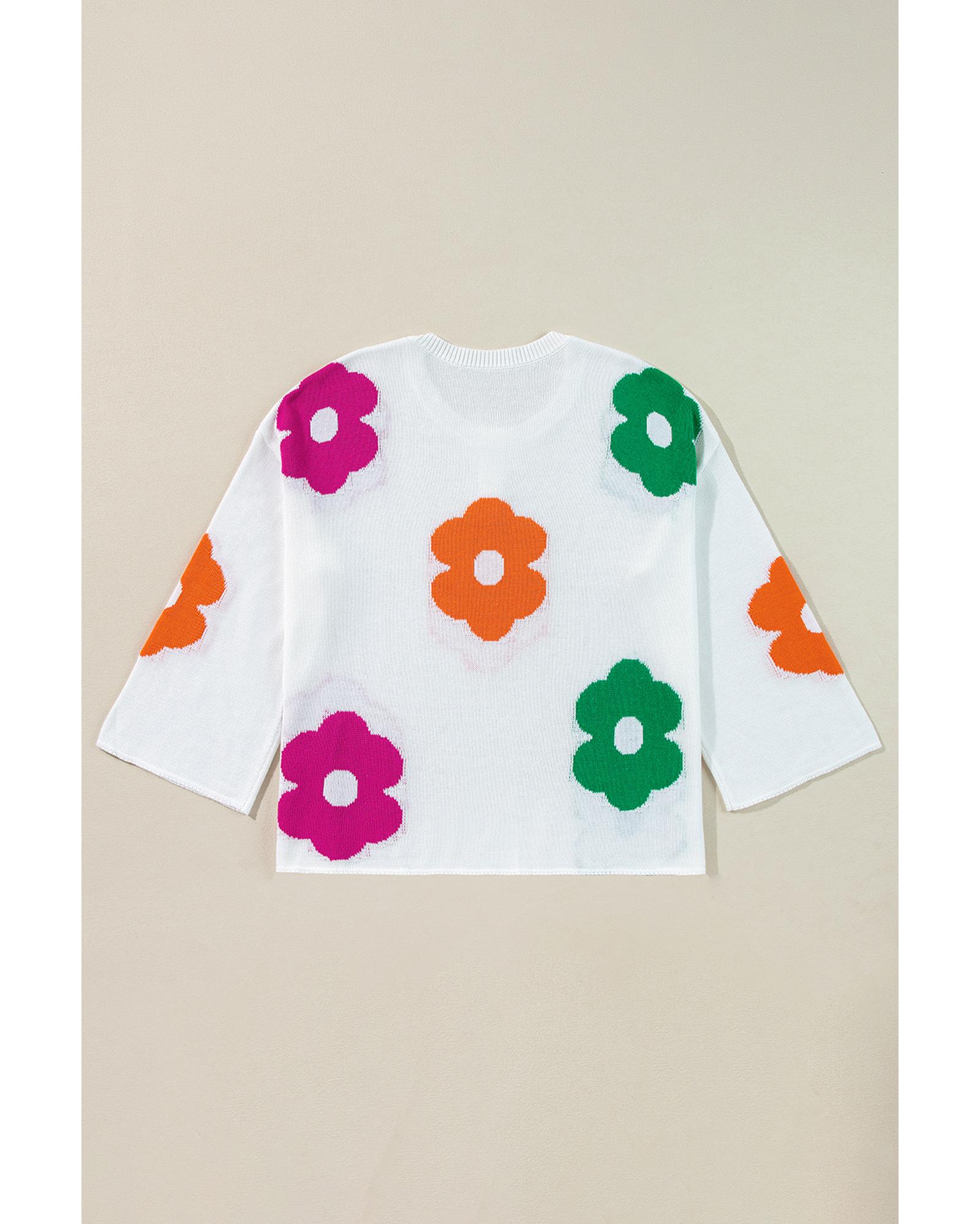 White Floral Print Buttoned Loose Lightweight Sweater – M