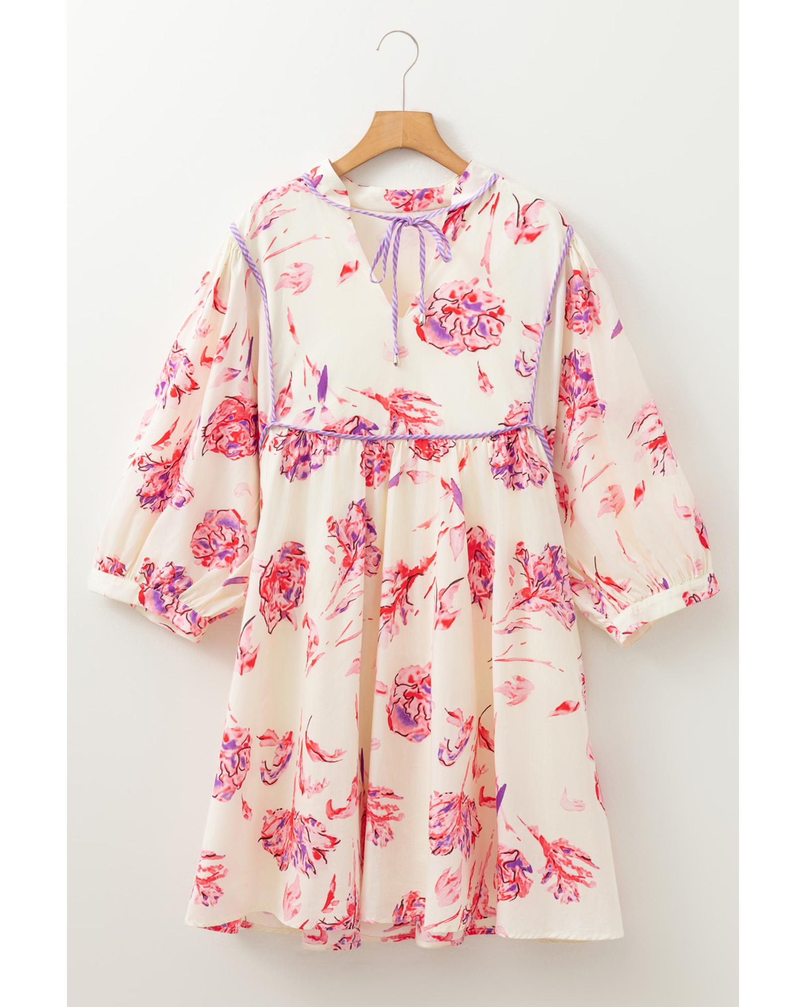 White Floral Print Lace up V Neck Balloon Sleeve Plus Size Shift Mini Dress – 2X