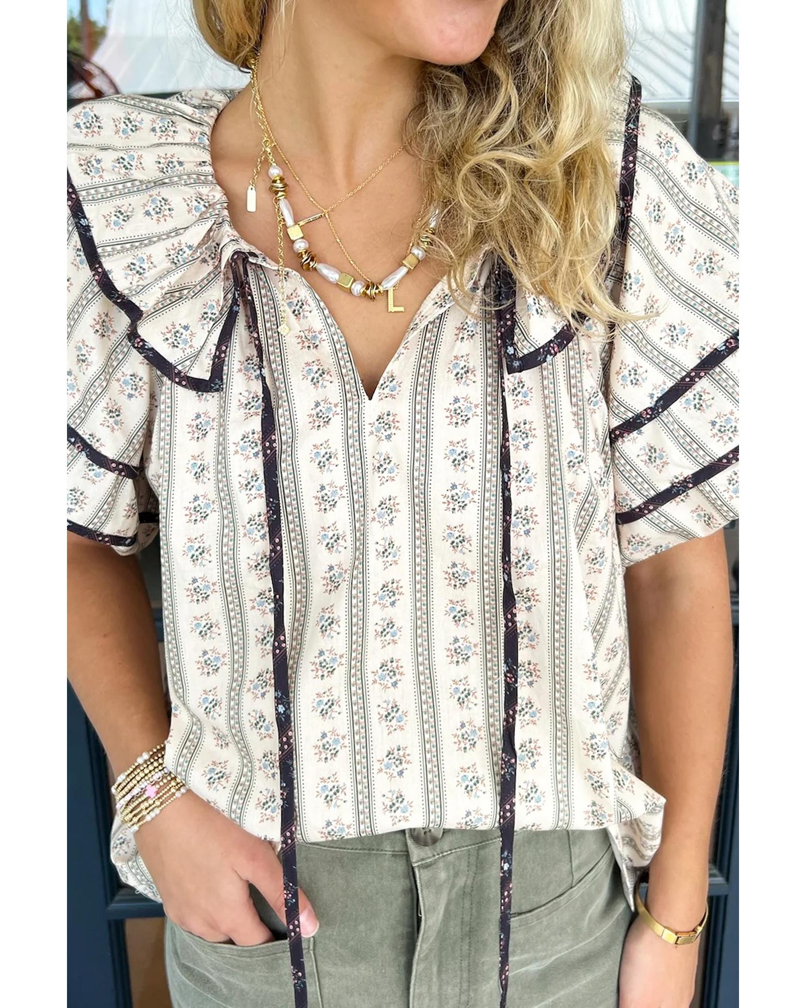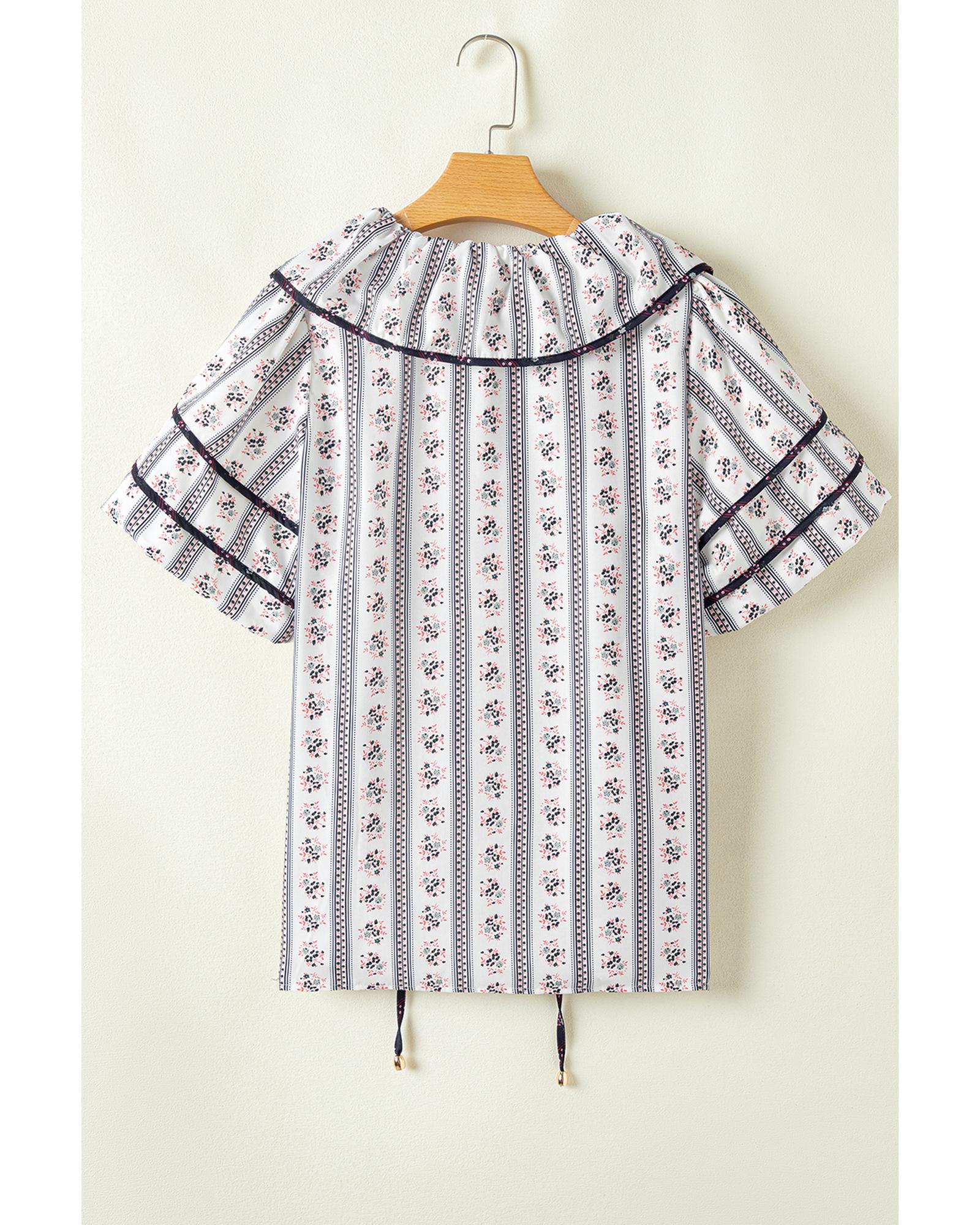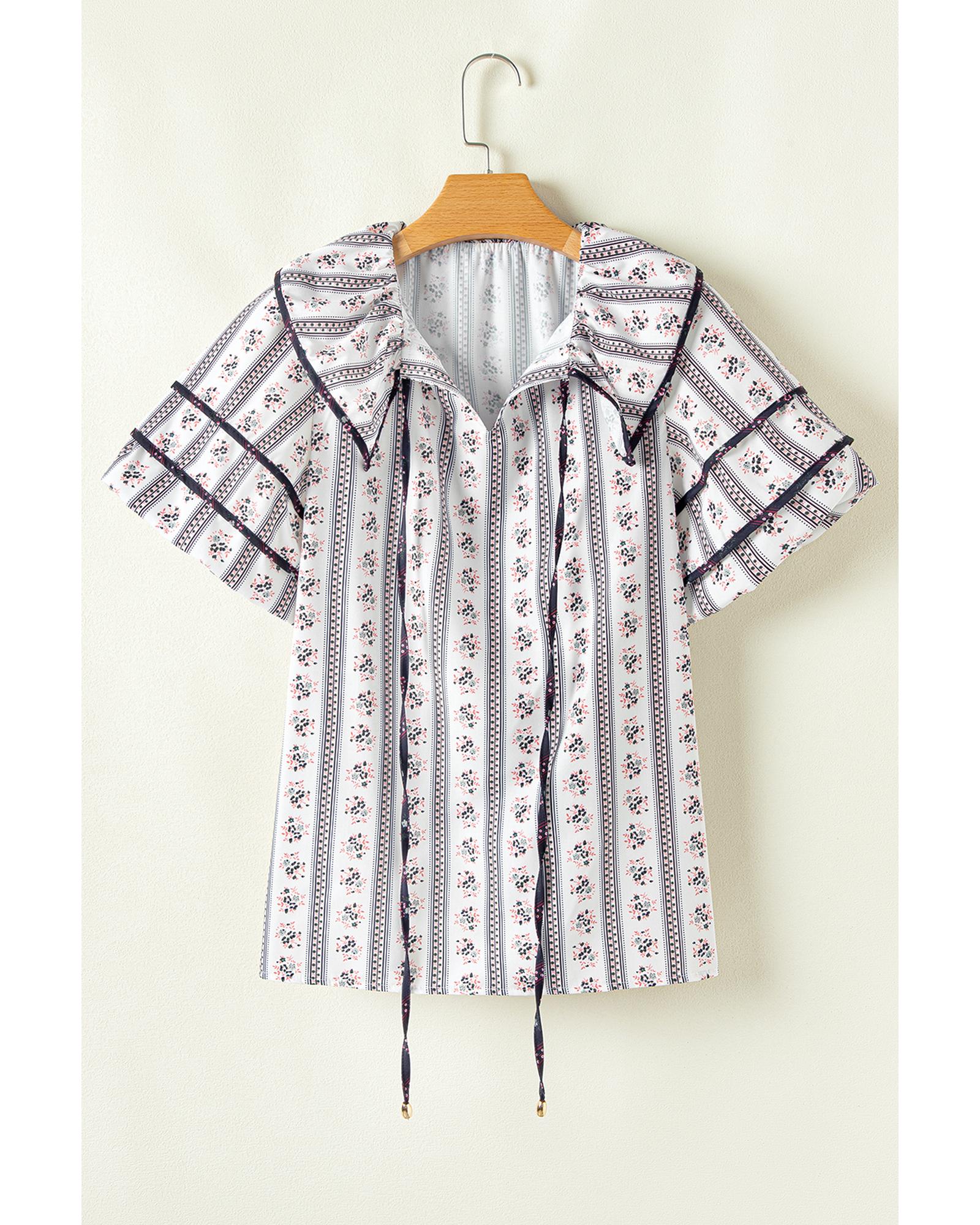 White Floral Ruffled Collar Short Puff Sleeve Printed Blouse – S